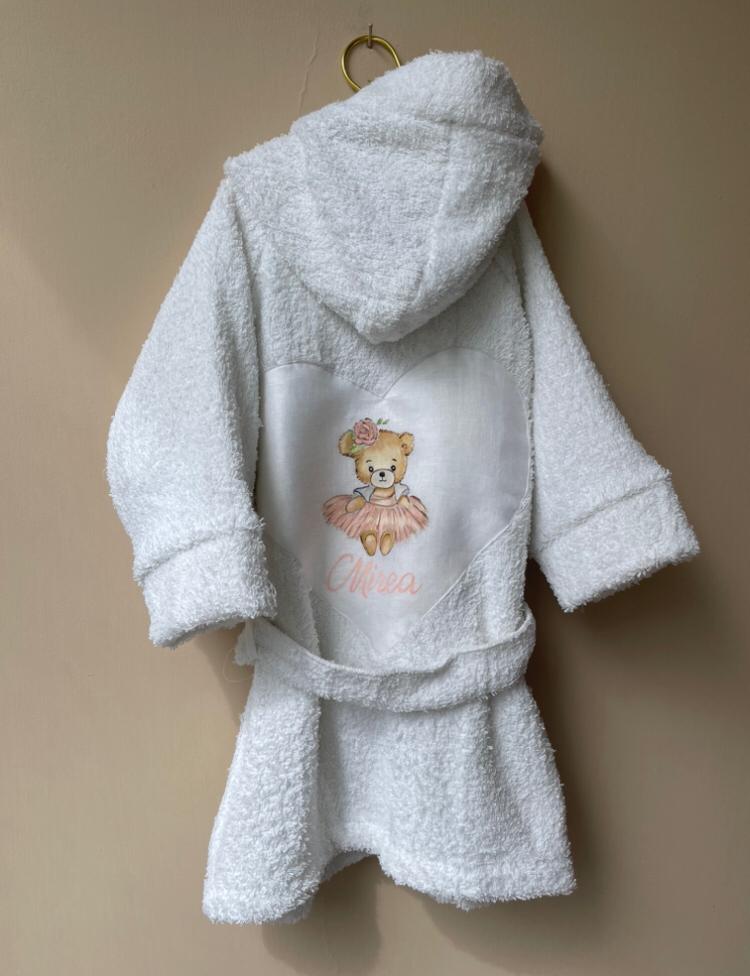 Dopo il bagnetto tieni il tuo bambino comodo con il nostro morbido accappatoio realizzato in spugna di cotone e personalizzato con un delicato dipinto realizzato a mano su cuore di lino applicato sul retro della vestaglia.