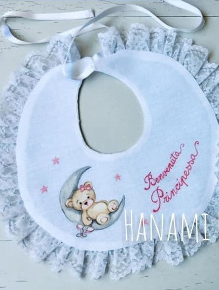 Bavetta in puro lino bianco o cotone 100% con merletto valancienne, personalizzata con il nome del bimbo/a e un grazioso orsetto su luna dipinti a mano con colori specifici per il tessuto. (È realizzabile anche in celeste).