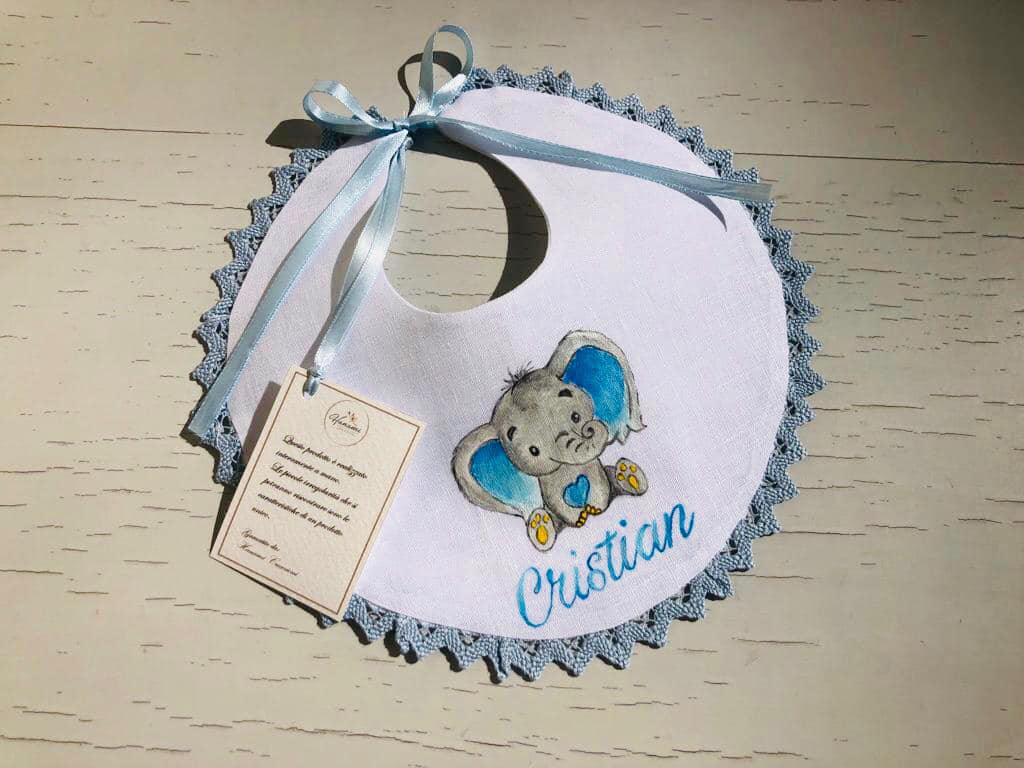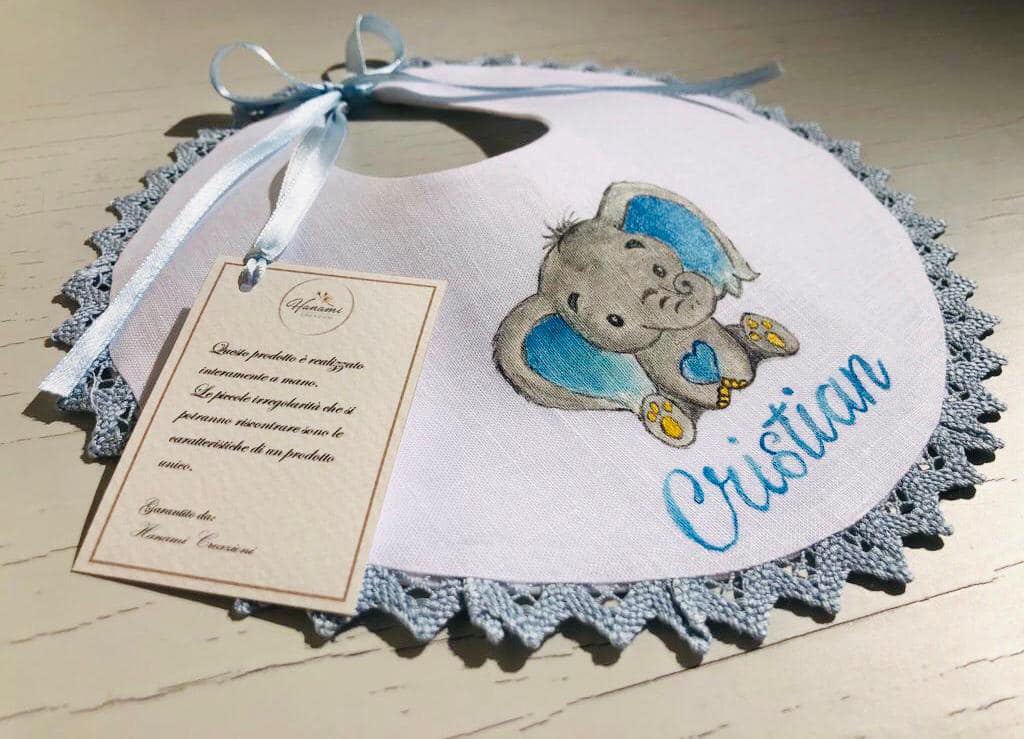Bavetta in puro lino bianco con merletto e personalizzata con il nome del bimbo/a e un grazioso elefantino dipinto a mano con colori specifici per il tessuto. (È realizzabile anche in rosa).