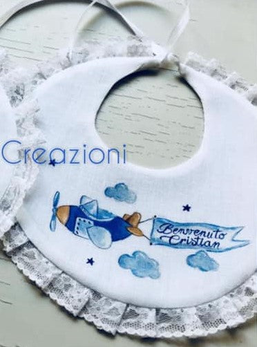 Bavetta in puro lino o cotone 100% con merletto valancienne e personalizzata con il nome del bimbo/a e un grazioso aeroplanino dipinti a mano con colori specifici per il tessuto. (È realizzabile anche in celeste).