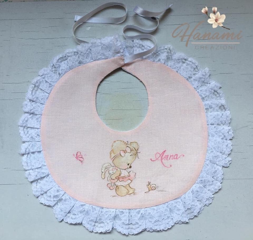 Bavetta in puro lino rosa con merletto valancienne, personalizzata con nome della bimba/o e un grazioso e timido orsetto con farfalline interamente dipinti a mano con colori specifici per il tessuto. (È realizzabile in qualsiasi colore).