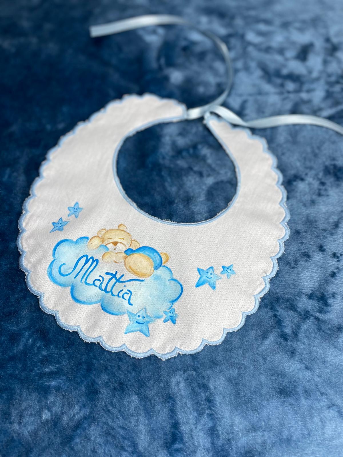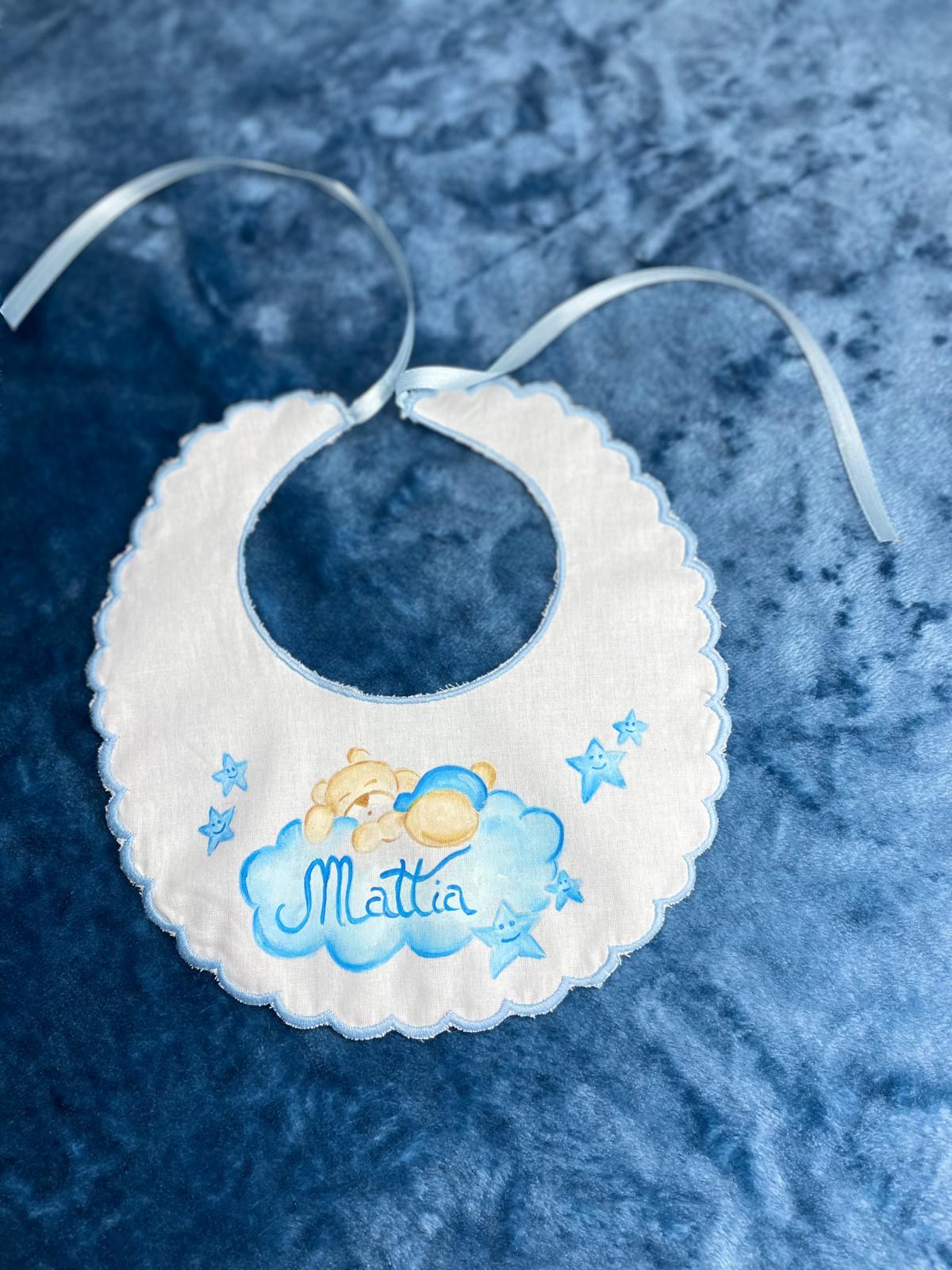 Bavetta in puro lino bianco o cotone 100% con orlo ricamato a macchina, personalizzata con un grazioso orsetto su nuvoletta nella quale è inserito il nome del bimbo/a interamente dipinti a mano con colori specifici per il tessuto. (È realizzabile in qualsiasi colore).