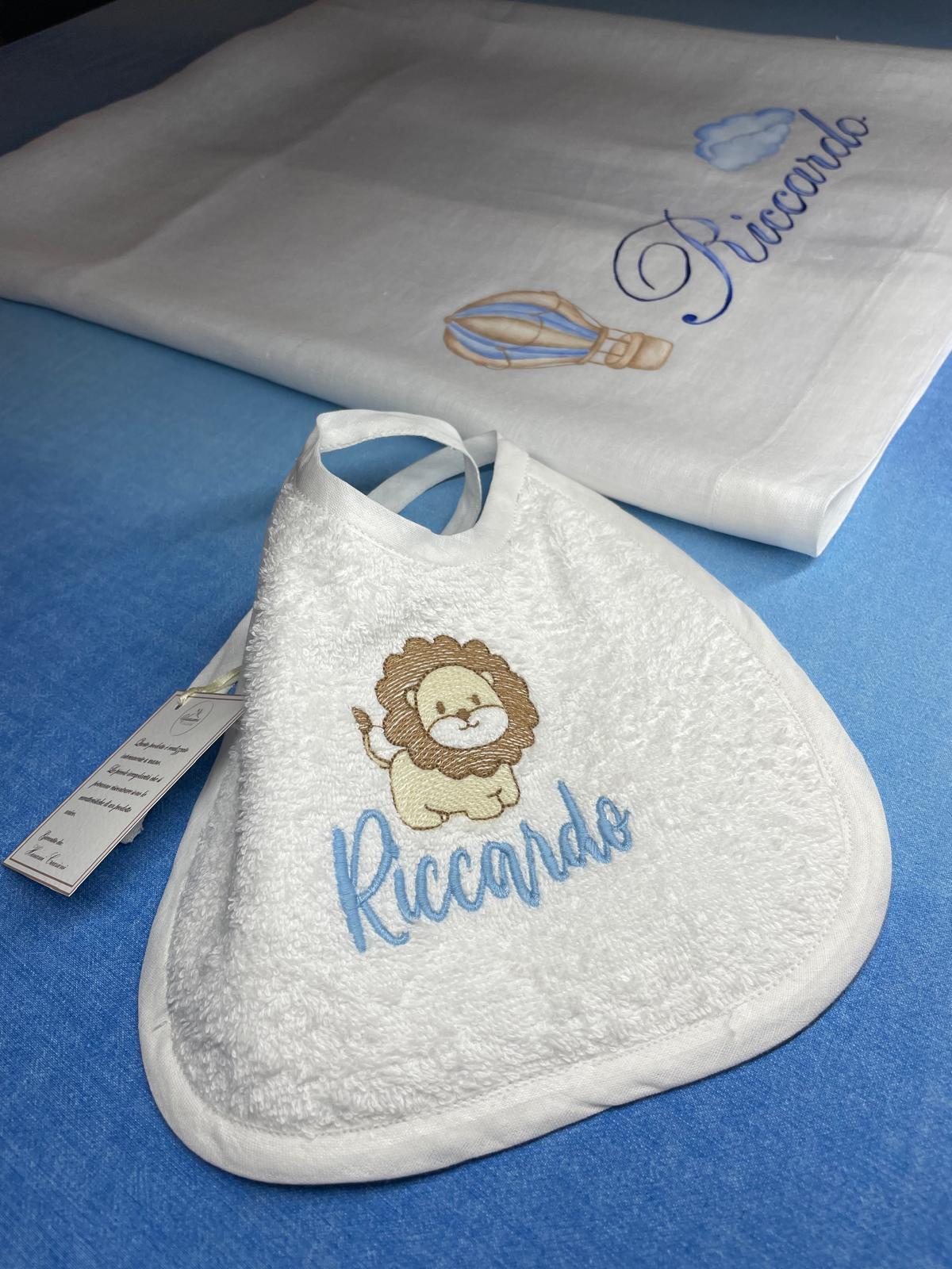 Bavetta in spugna di cotone, personalizzata con leoncino e nome del bimbo/a ricamati a macchina.(N.B. è realizzabile in qualsiasi colore).