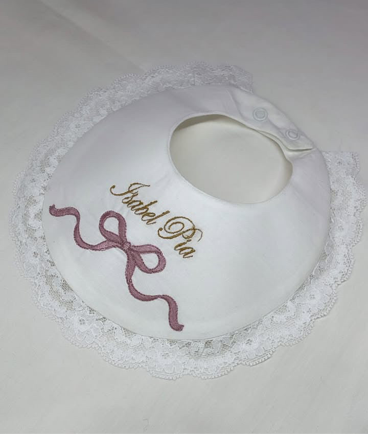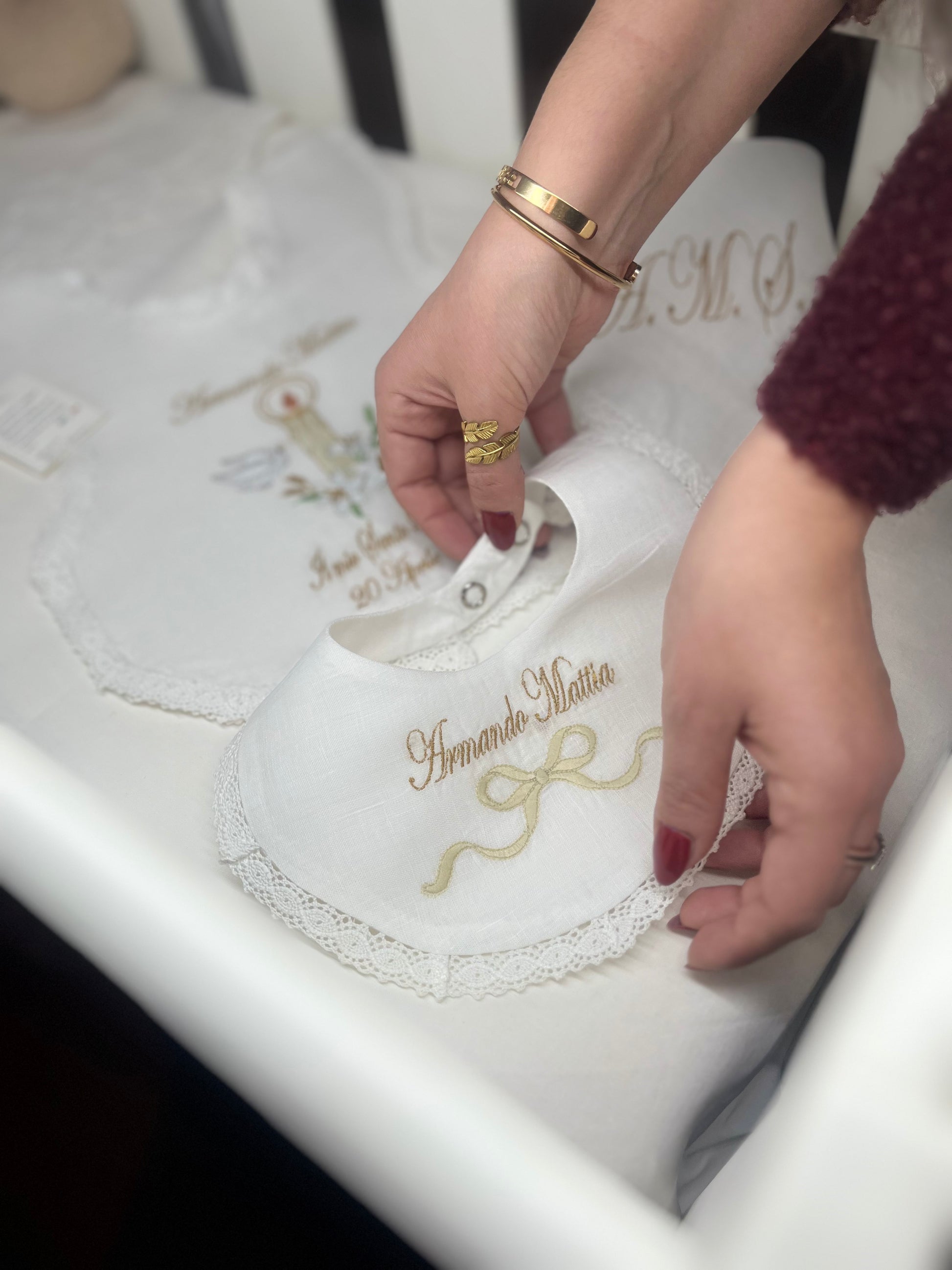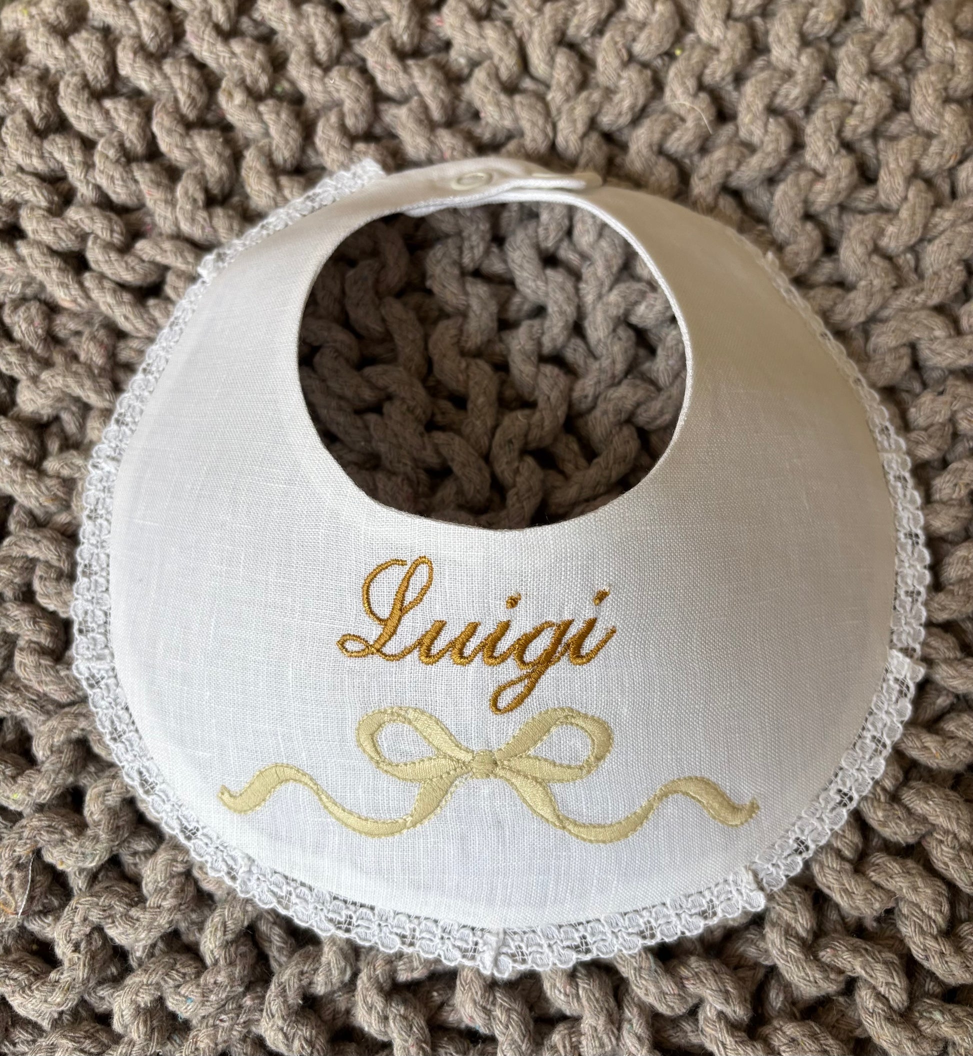 Bavetta in puro lino bianco o cotone 100% personalizzata con nome e fiocco ricamato a macchina