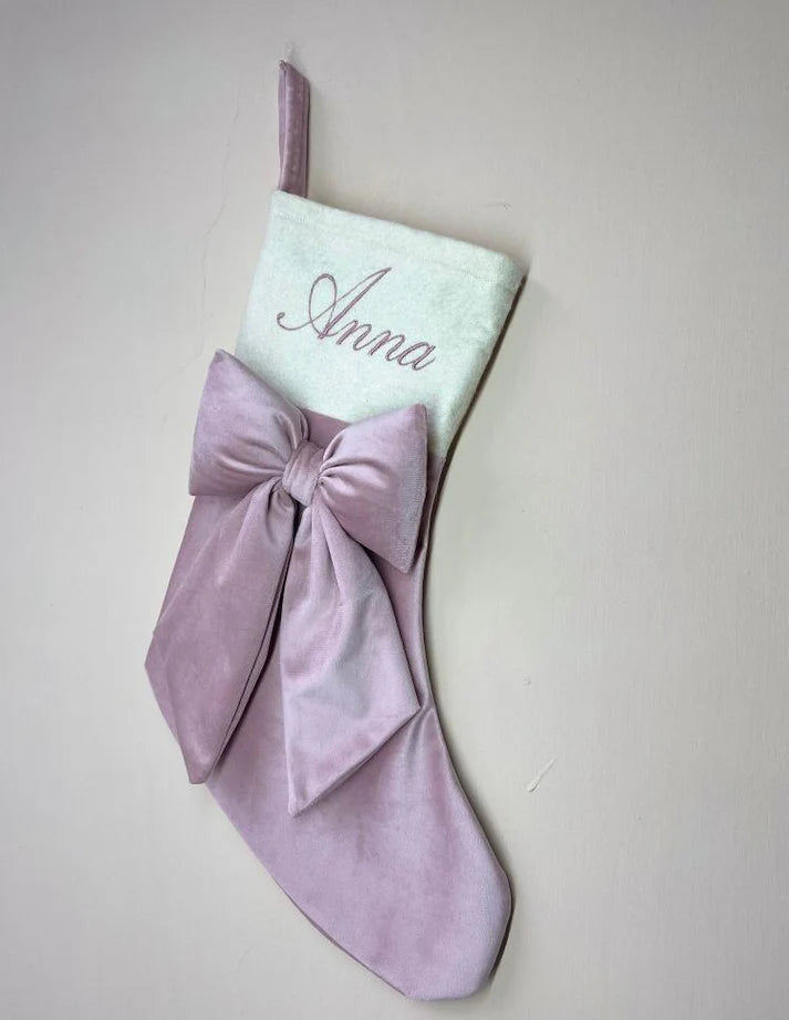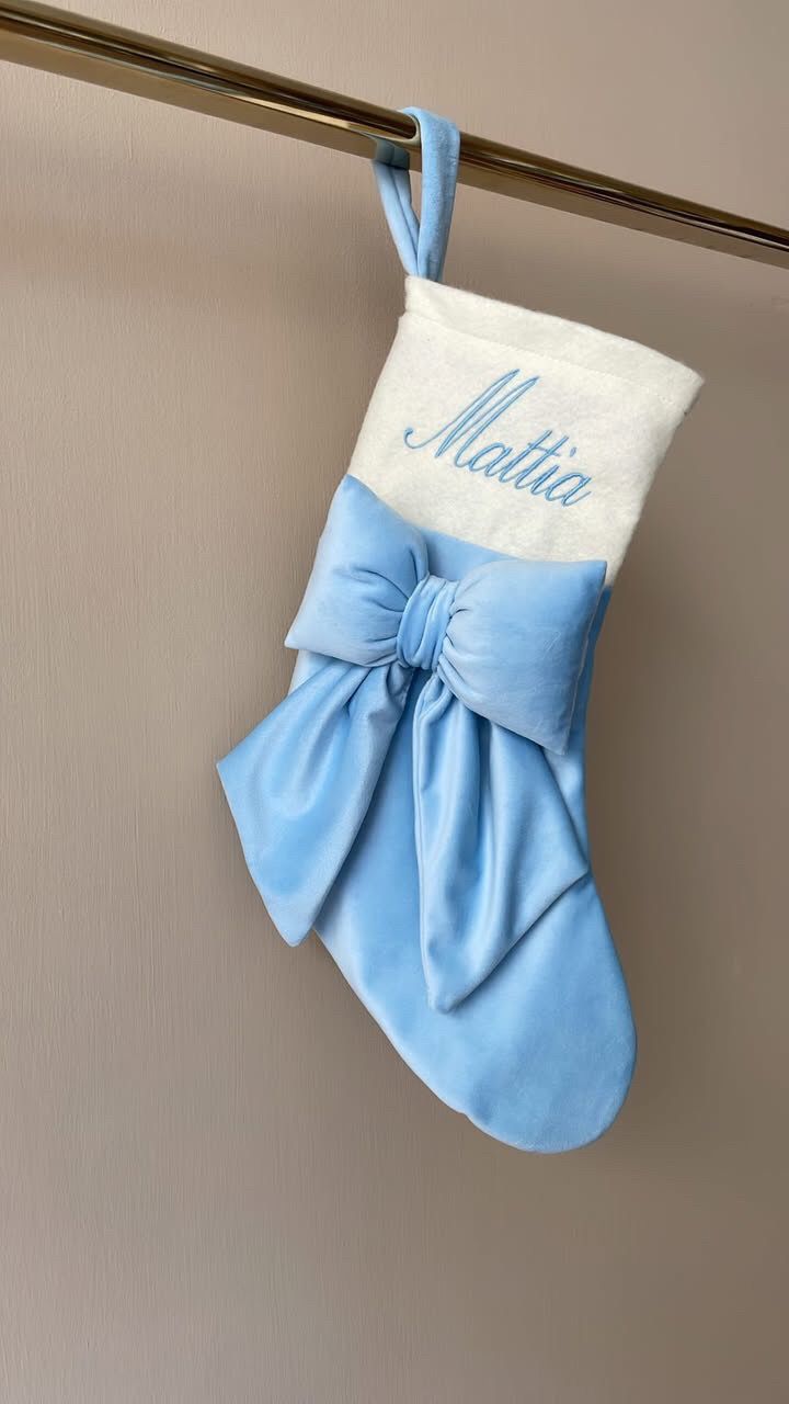 Calza realizzata interamente a mano con velluto italiano ed impreziosita con fiocco e nome ricamato.