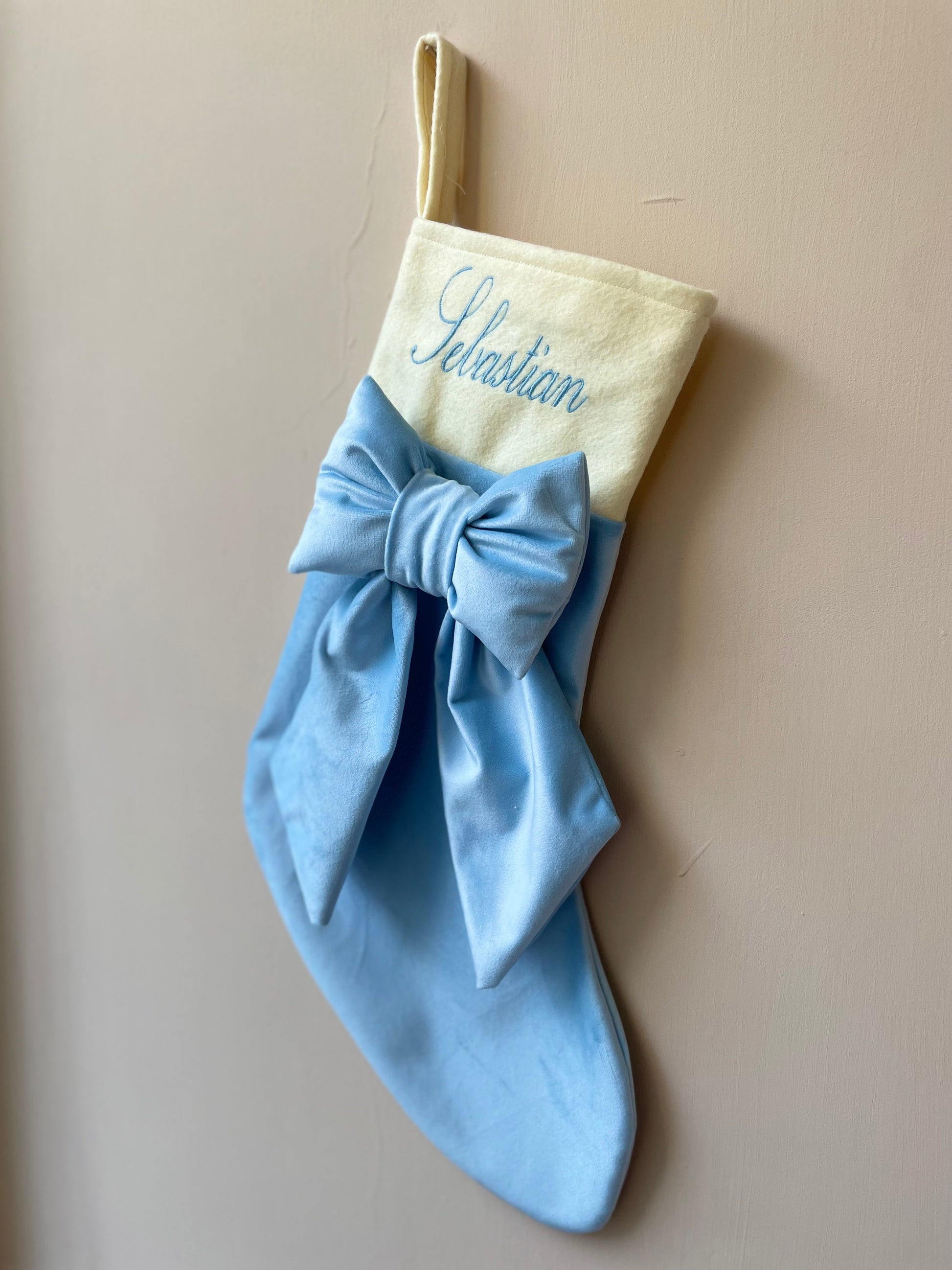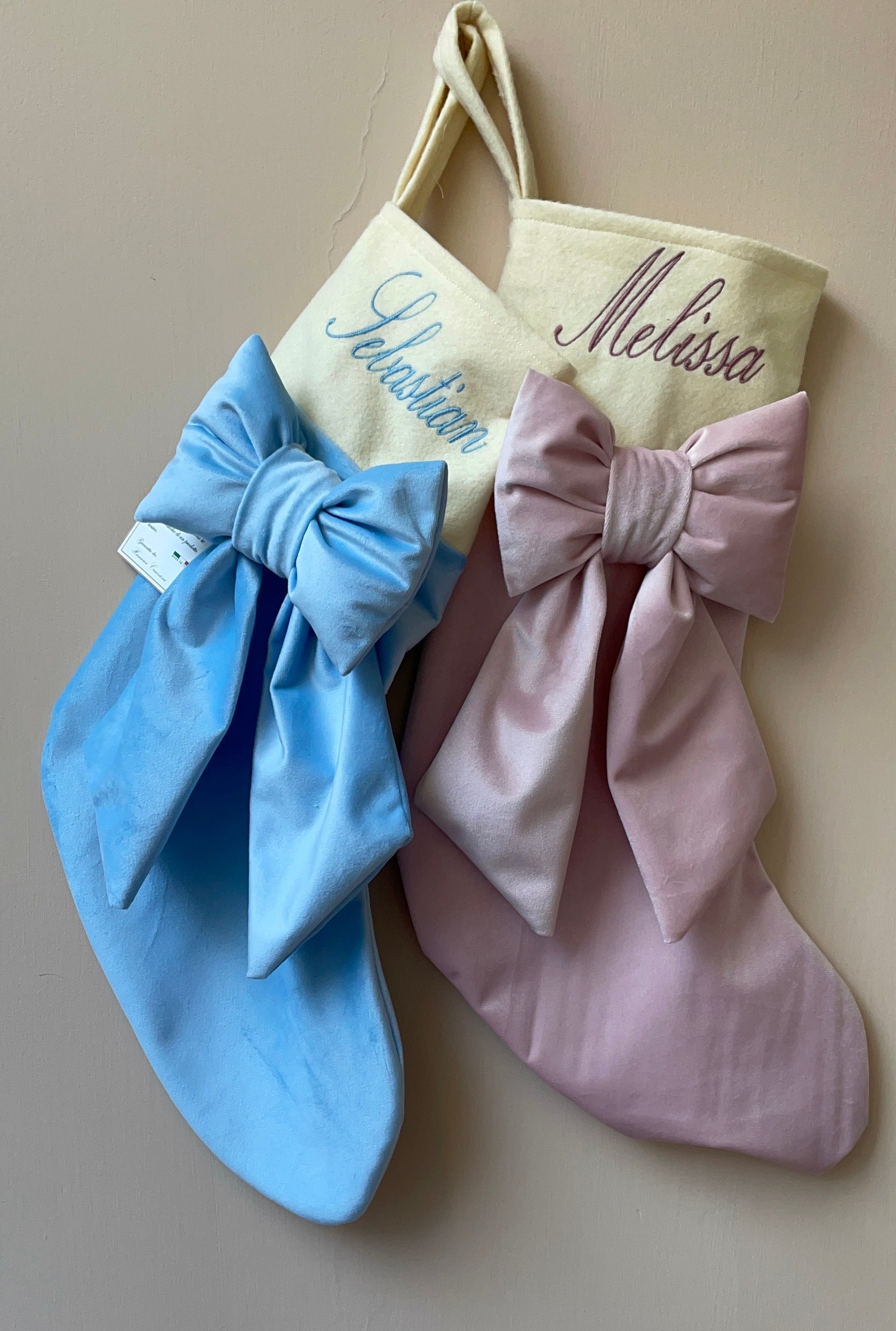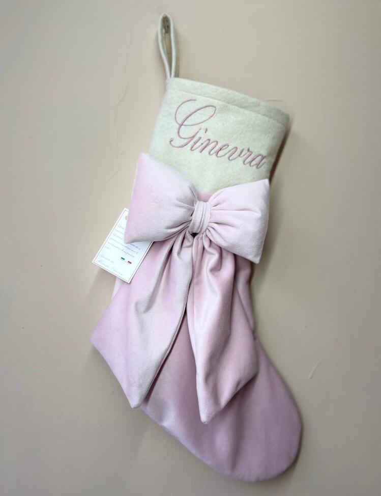 Calza realizzata interamente a mano con velluto italiano ed impreziosita con fiocco e nome ricamato.