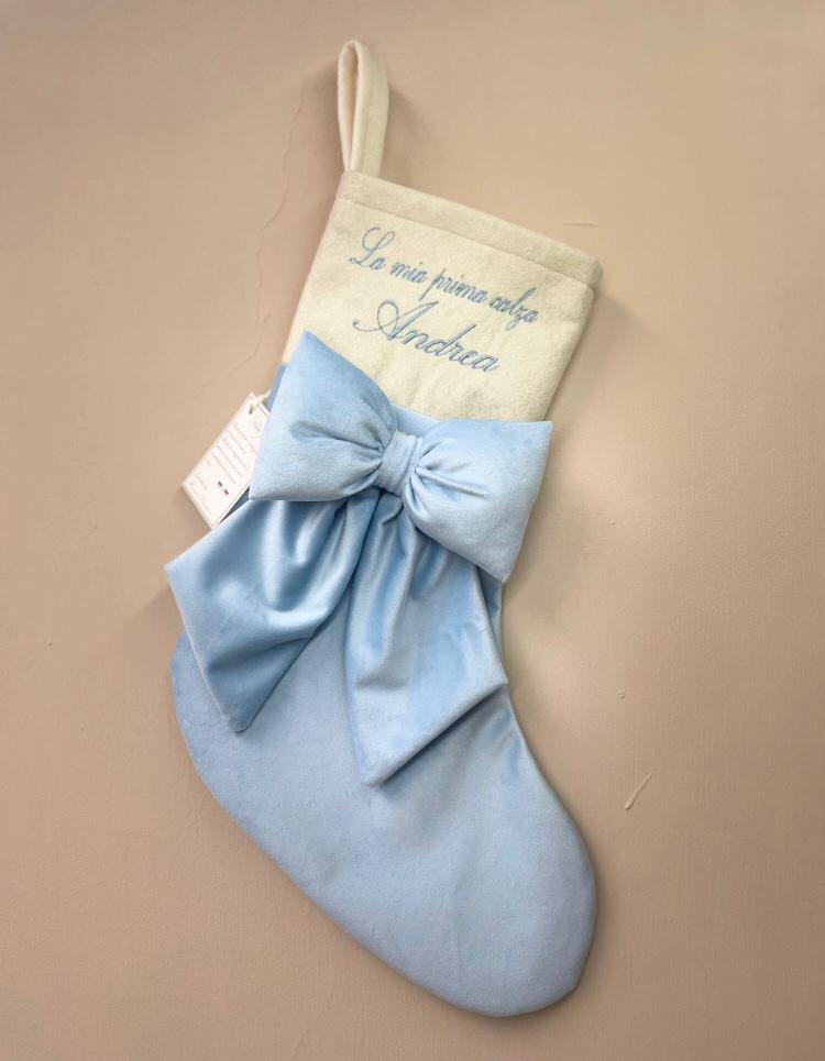 La calza "La mia prima calza" è composta da una fascia color panna sulla quale è ricamata la frase "La mia prima calza" ed il nome del bimbo/a. Invece la base, il fiocco ed il ricamo sono realizzati in velluto italiano color celeste.
