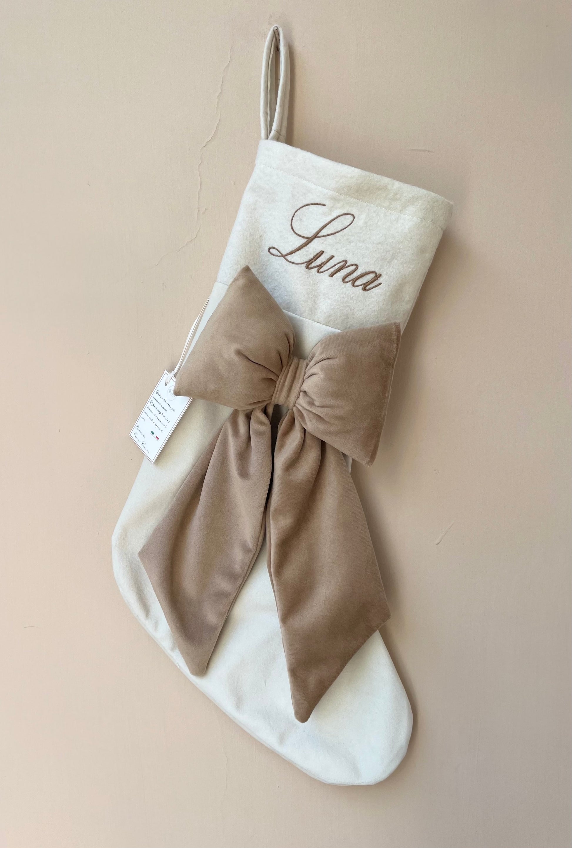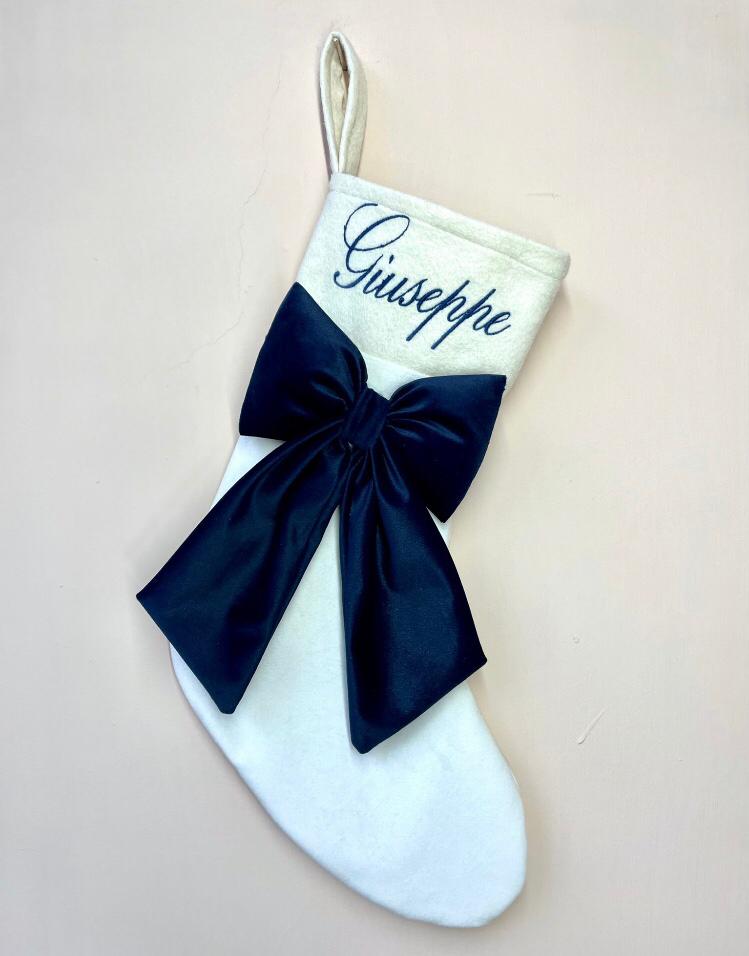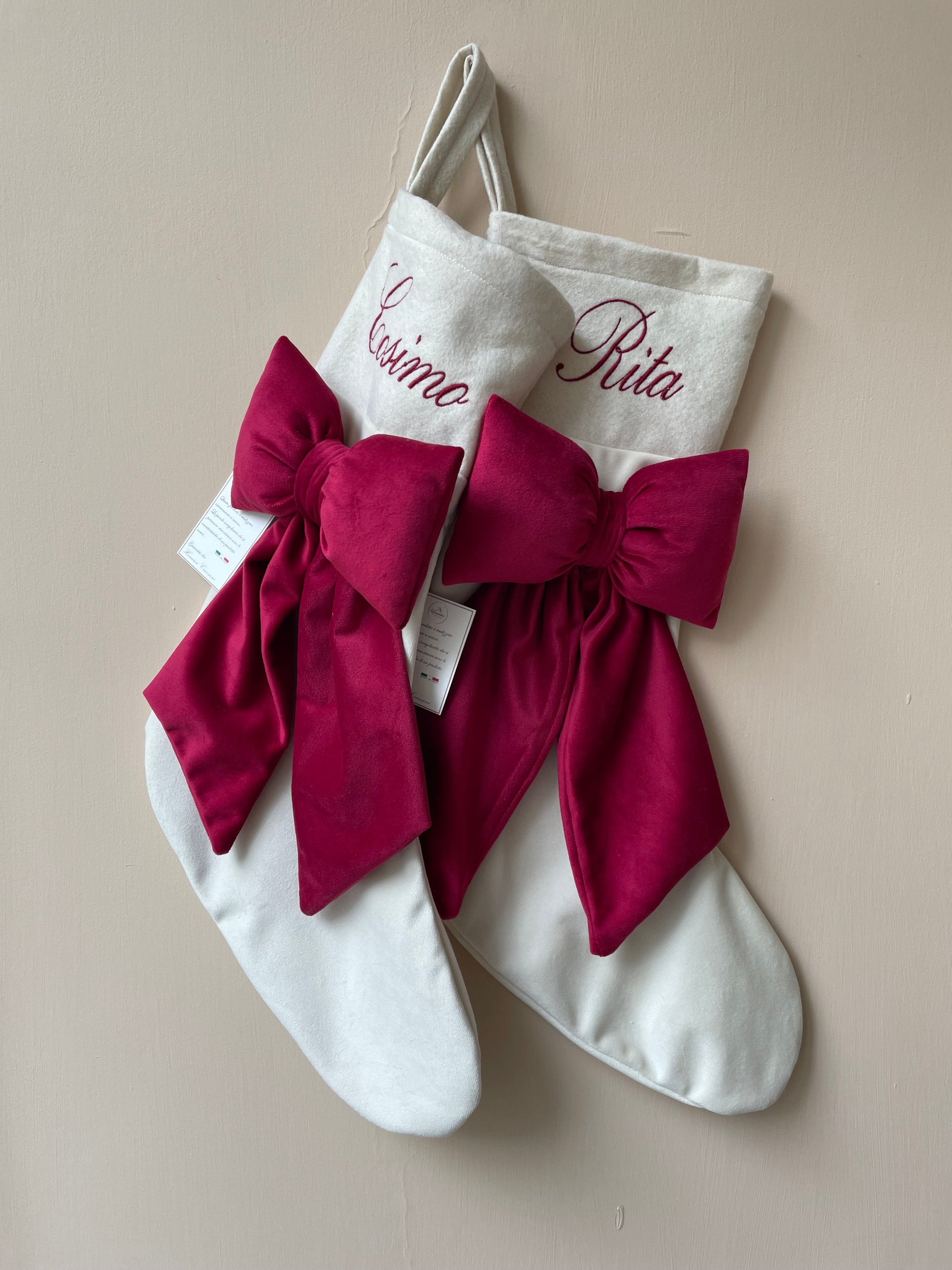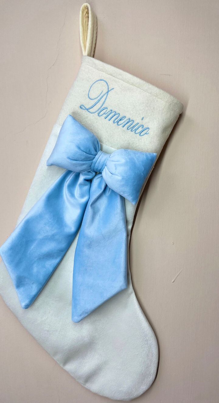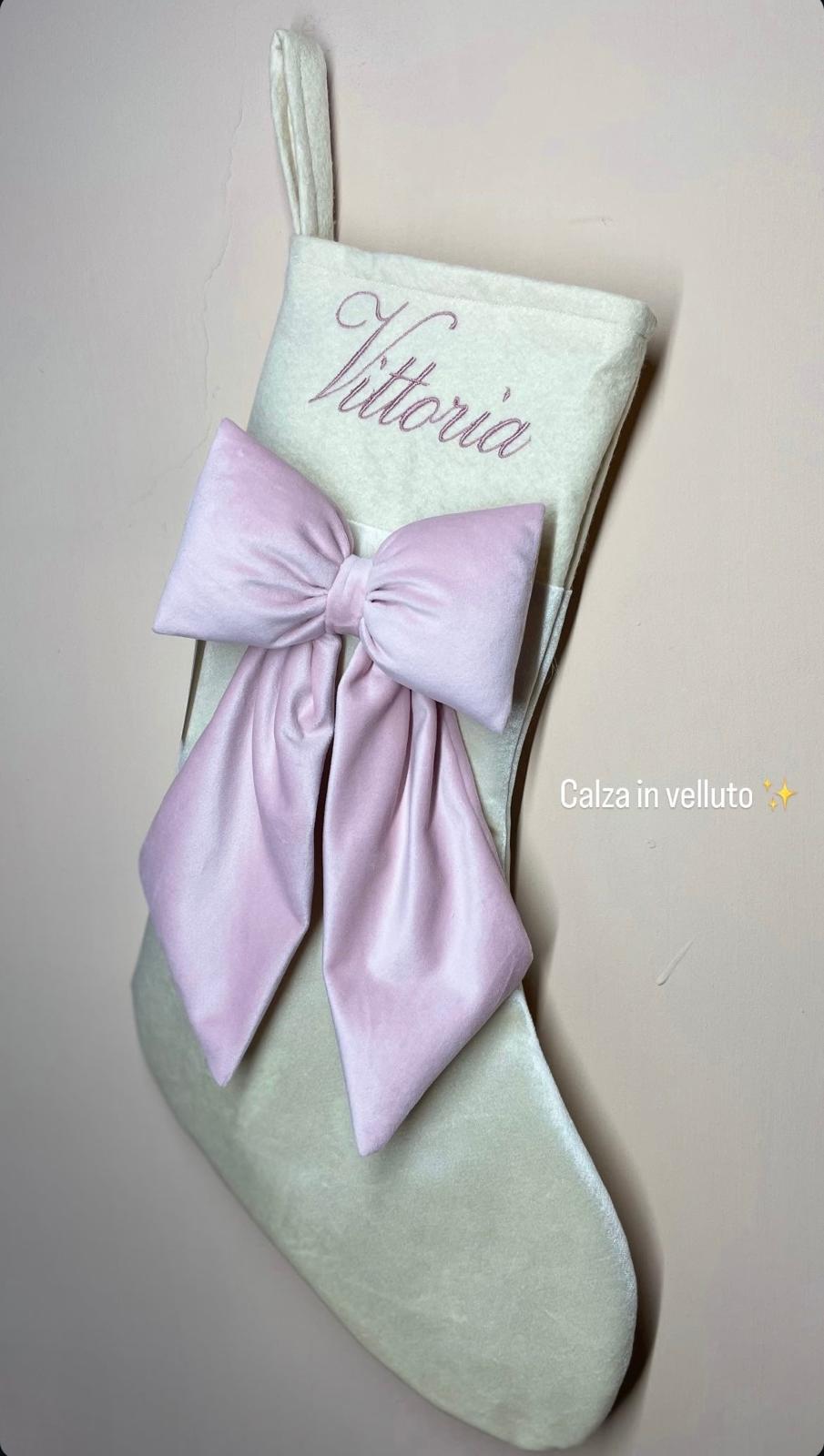 Calza realizzata interamente a mano con velluto italiano ed impreziosita con fiocco e nome ricamato.