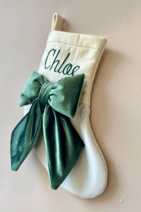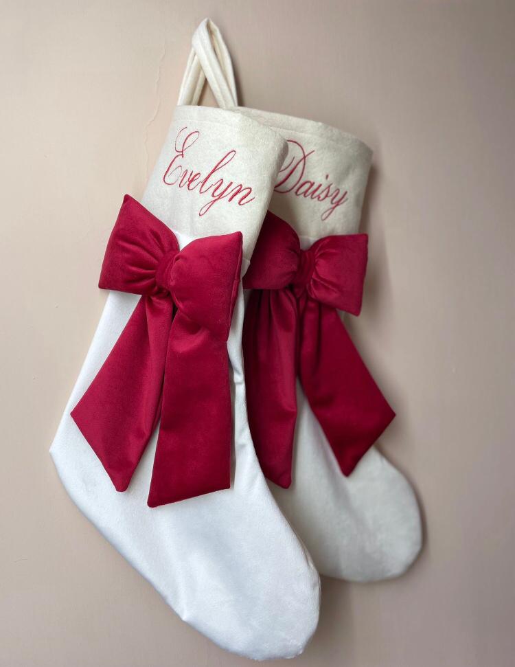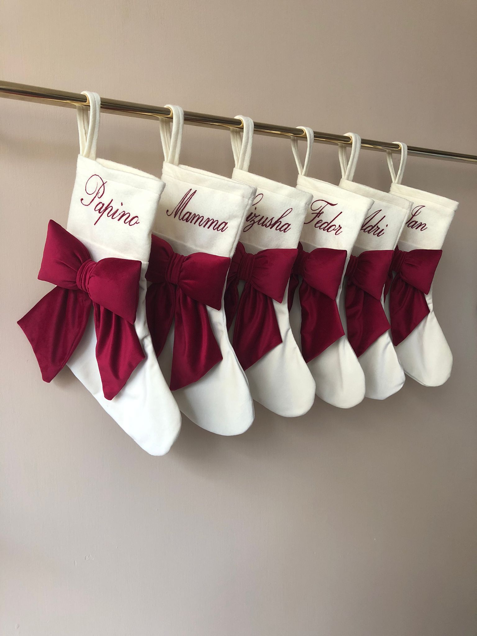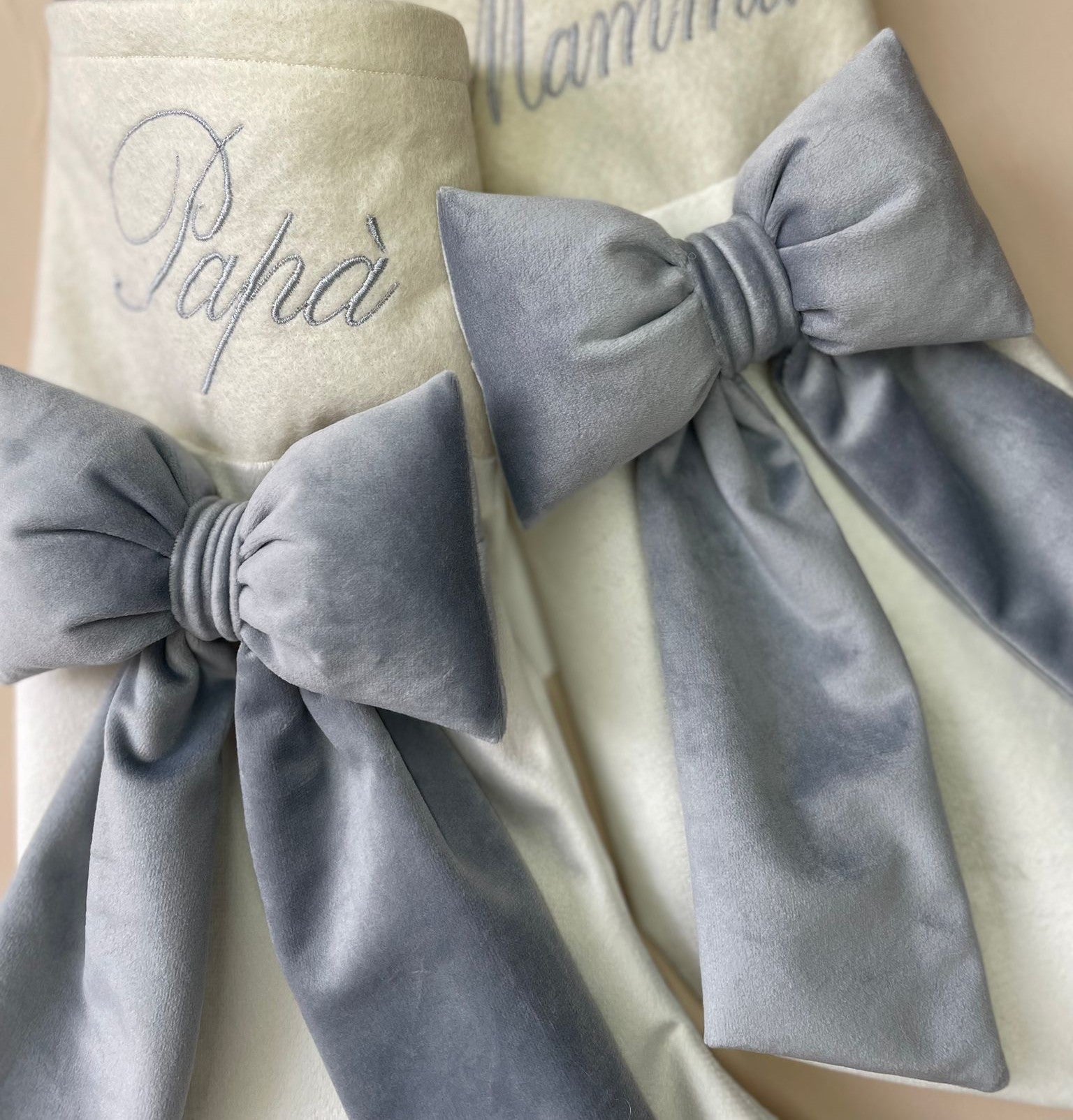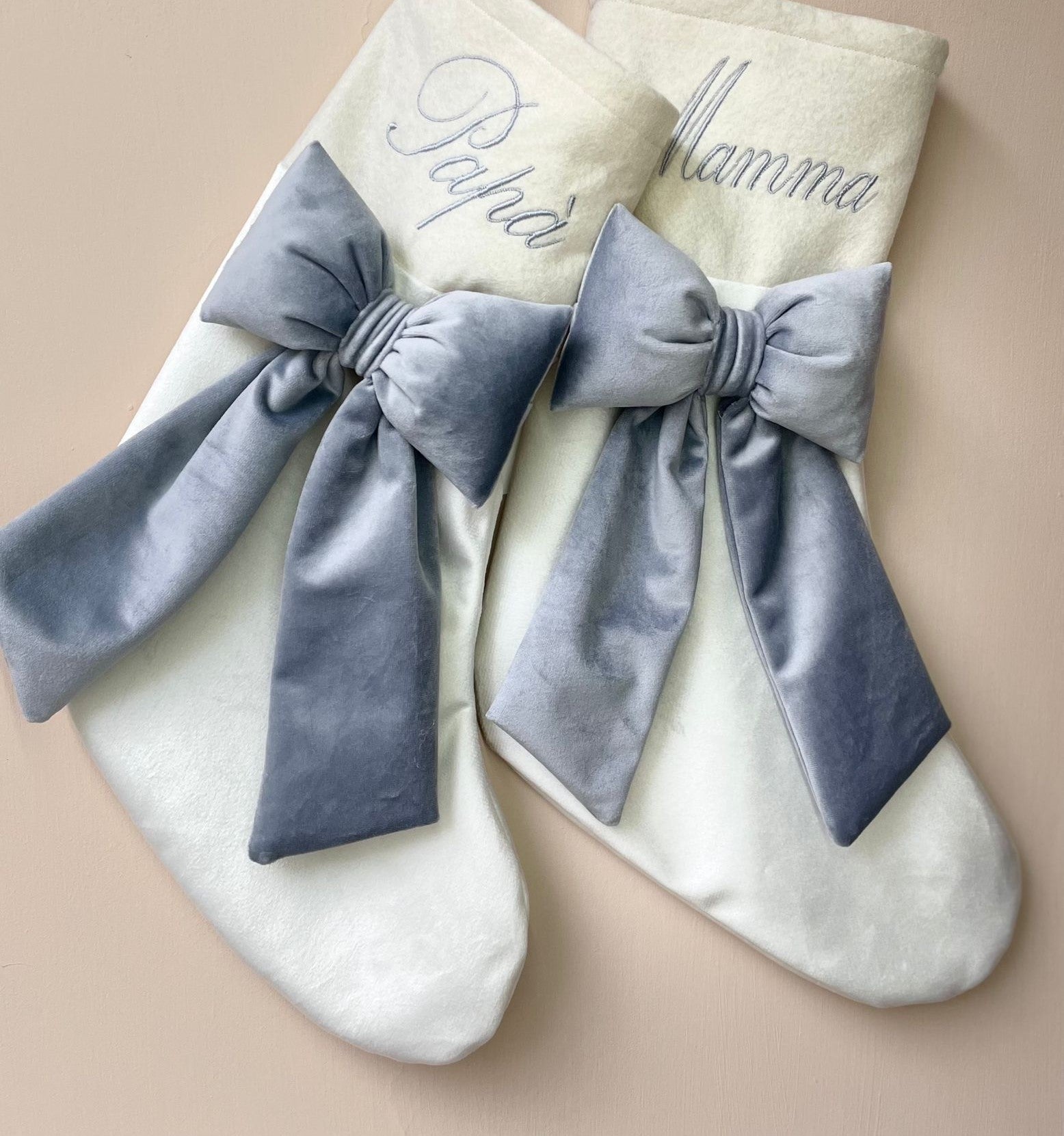 Calza realizzata interamente a mano con velluto italiano ed impreziosita con fiocco e nome ricamato.