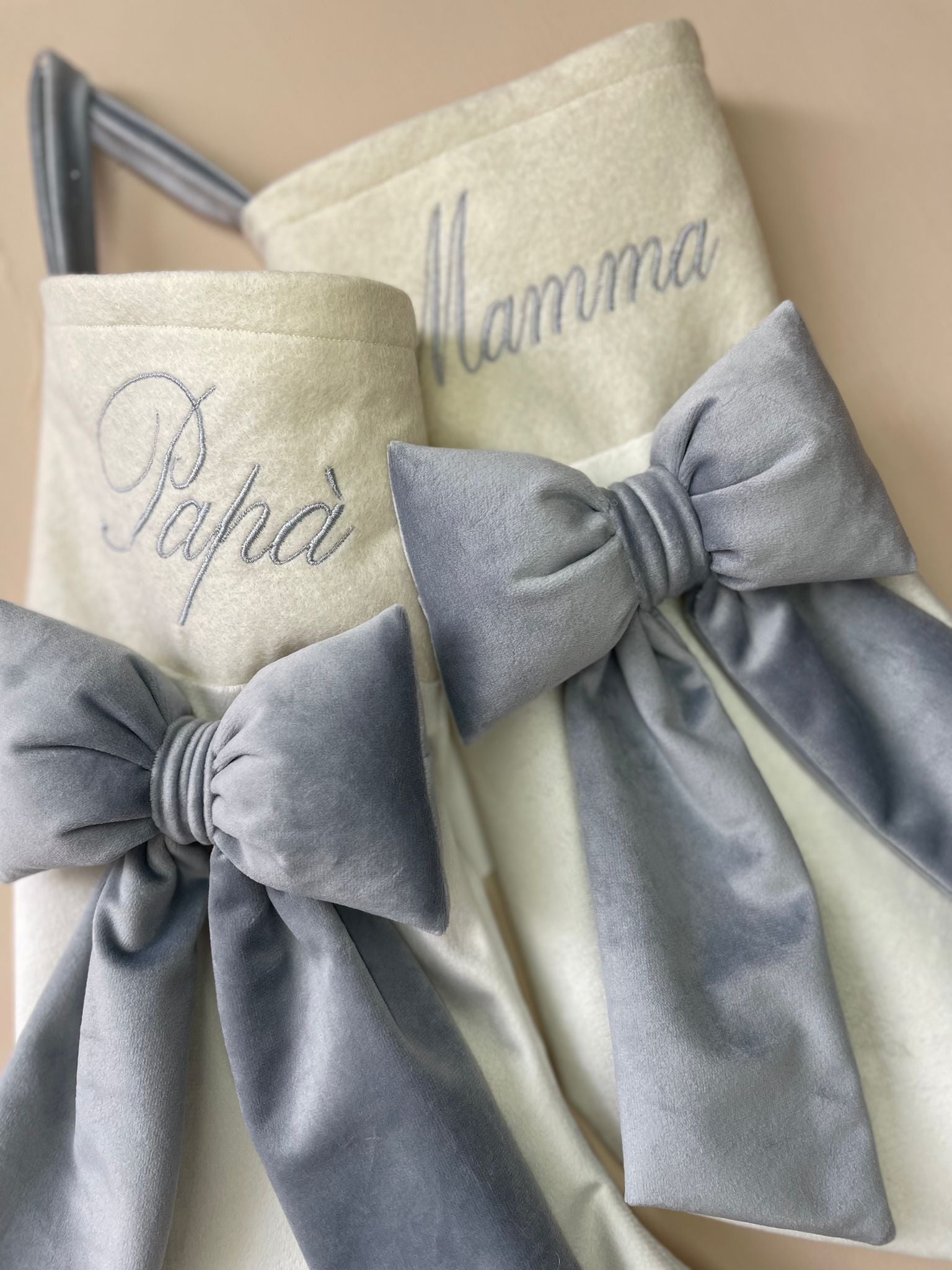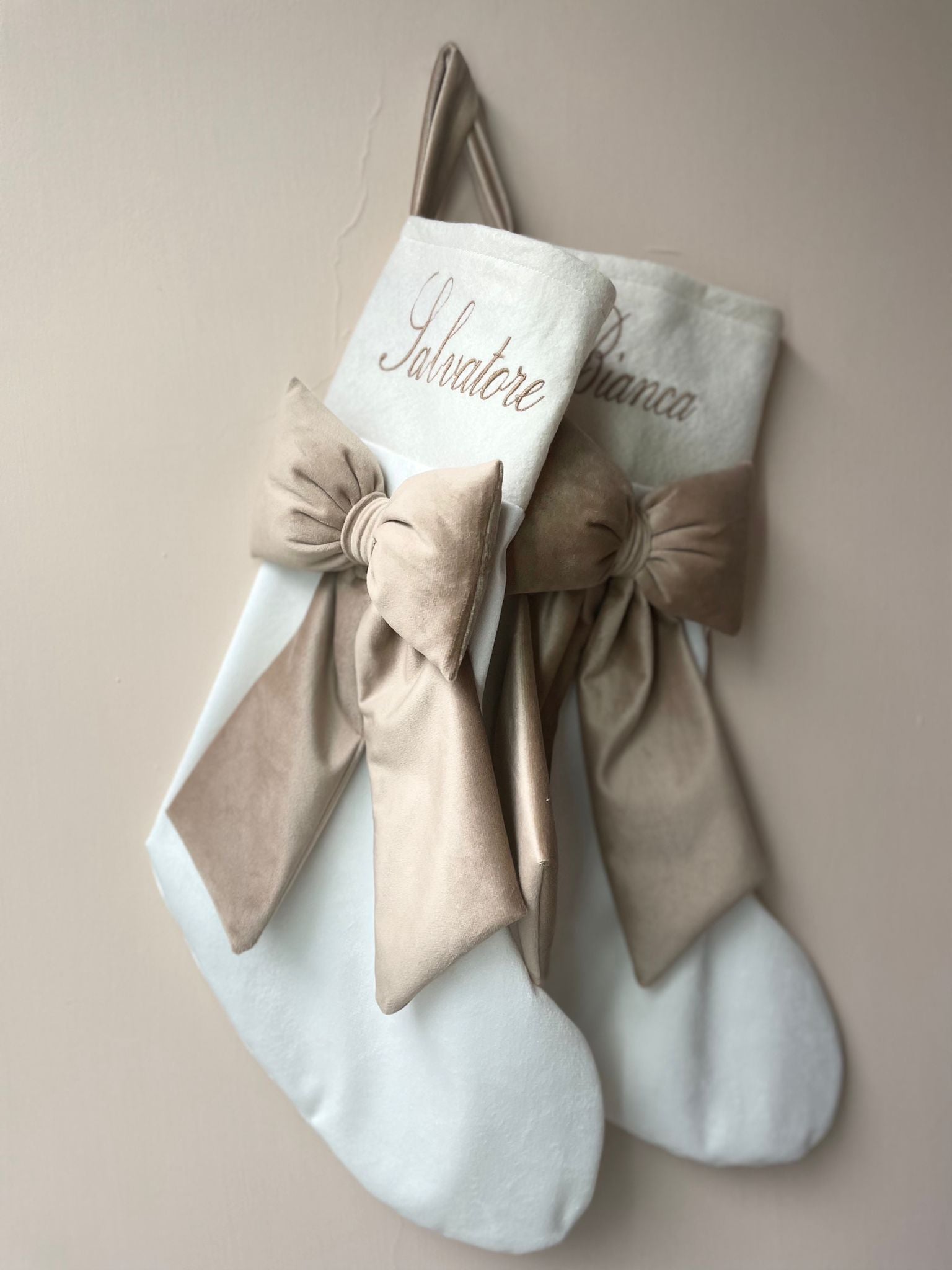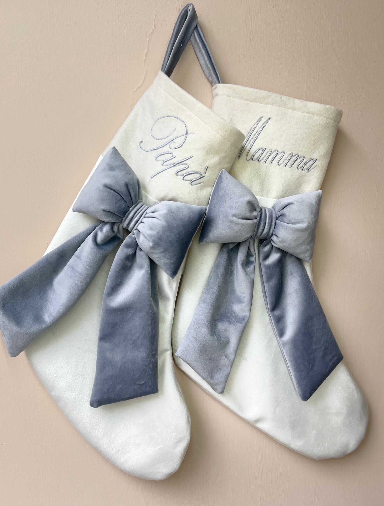 Calza realizzata interamente a mano con velluto italiano ed impreziosita con fiocco e nome ricamato.