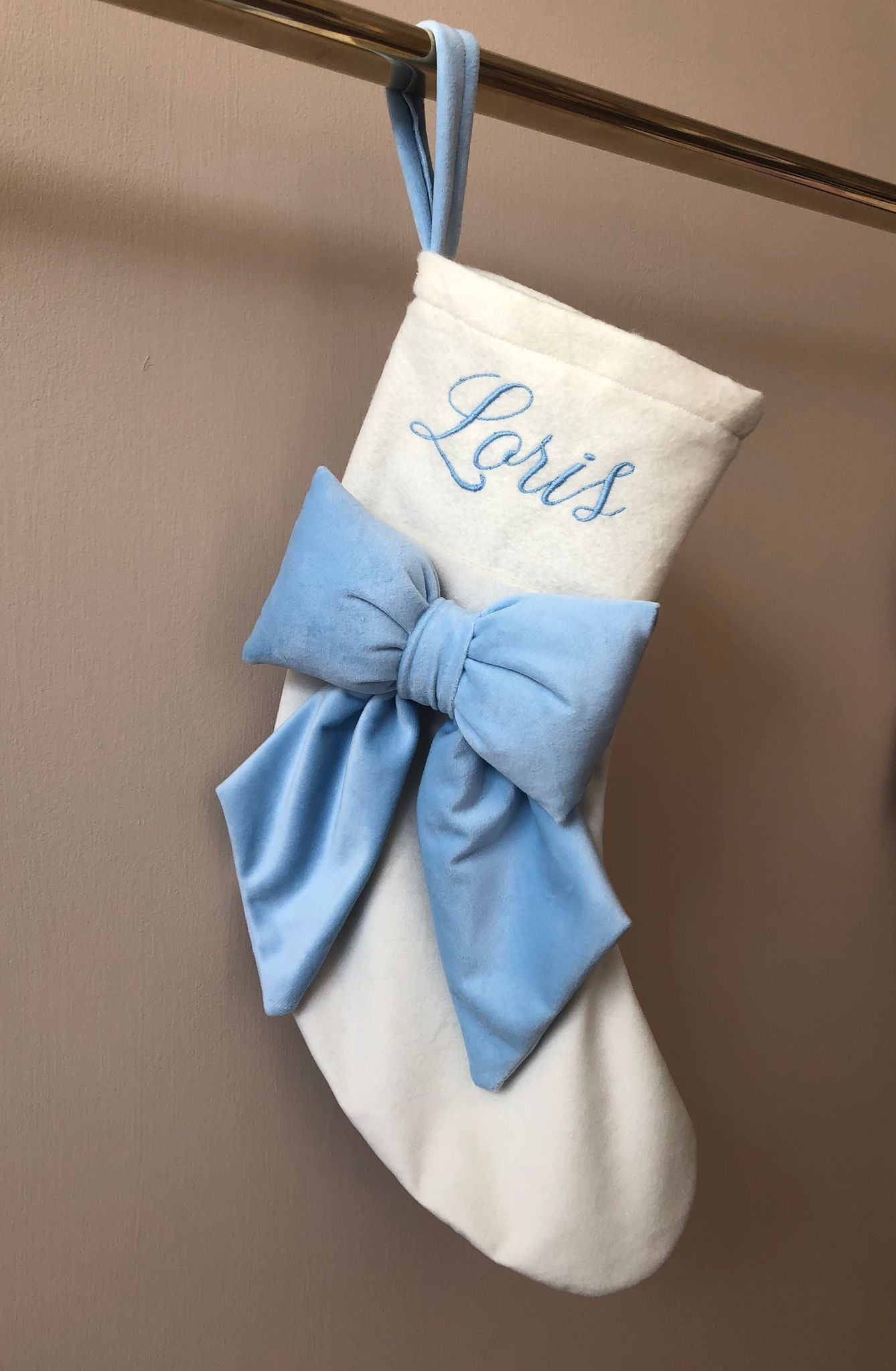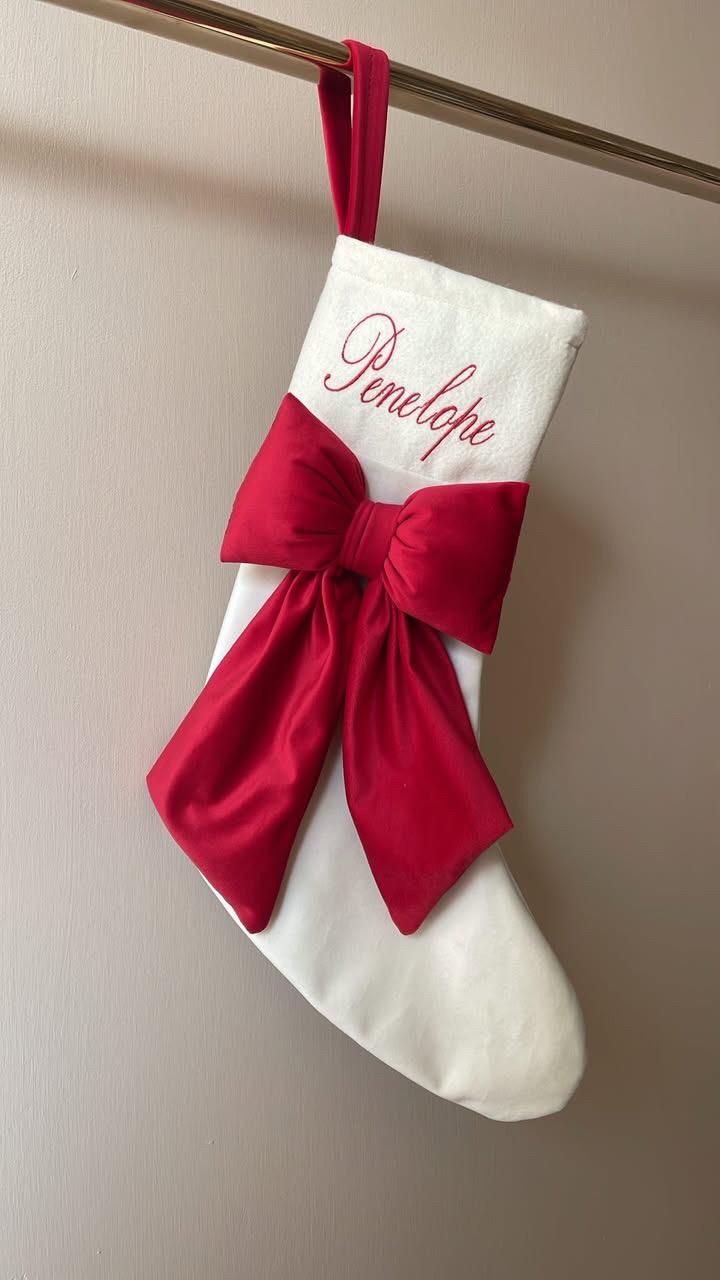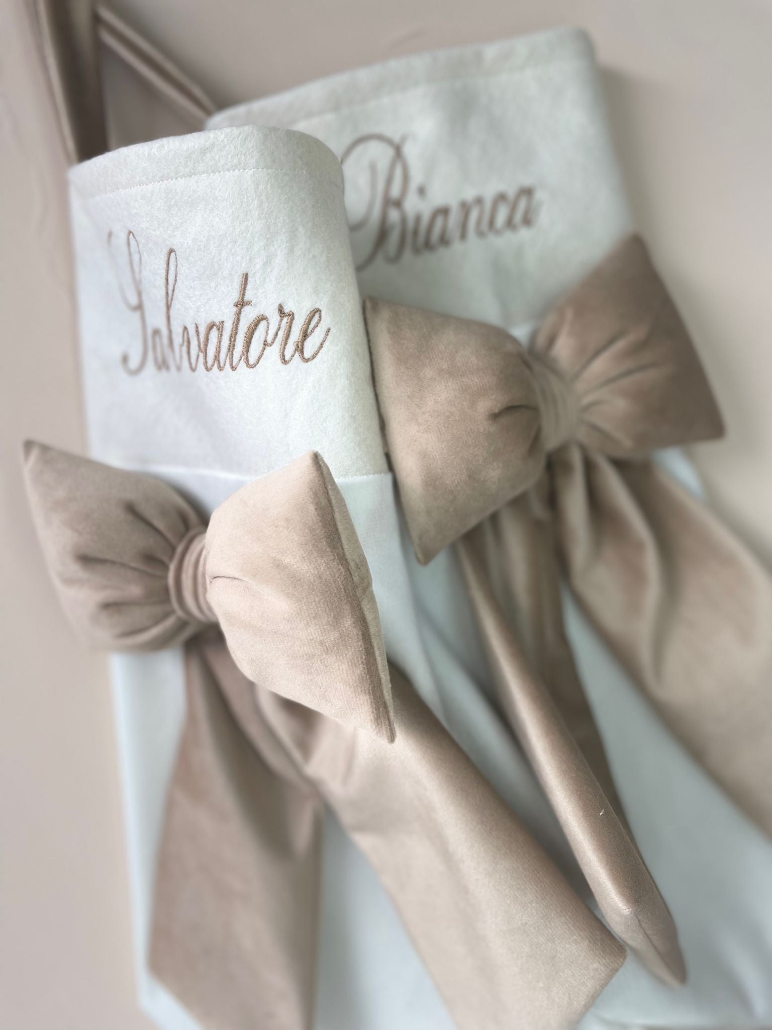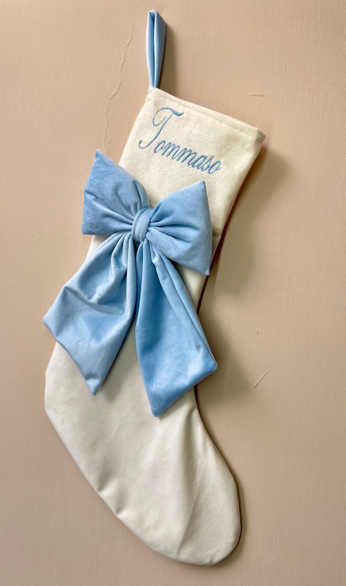 Calza realizzata interamente a mano con velluto italiano ed impreziosita con fiocco e nome ricamato.