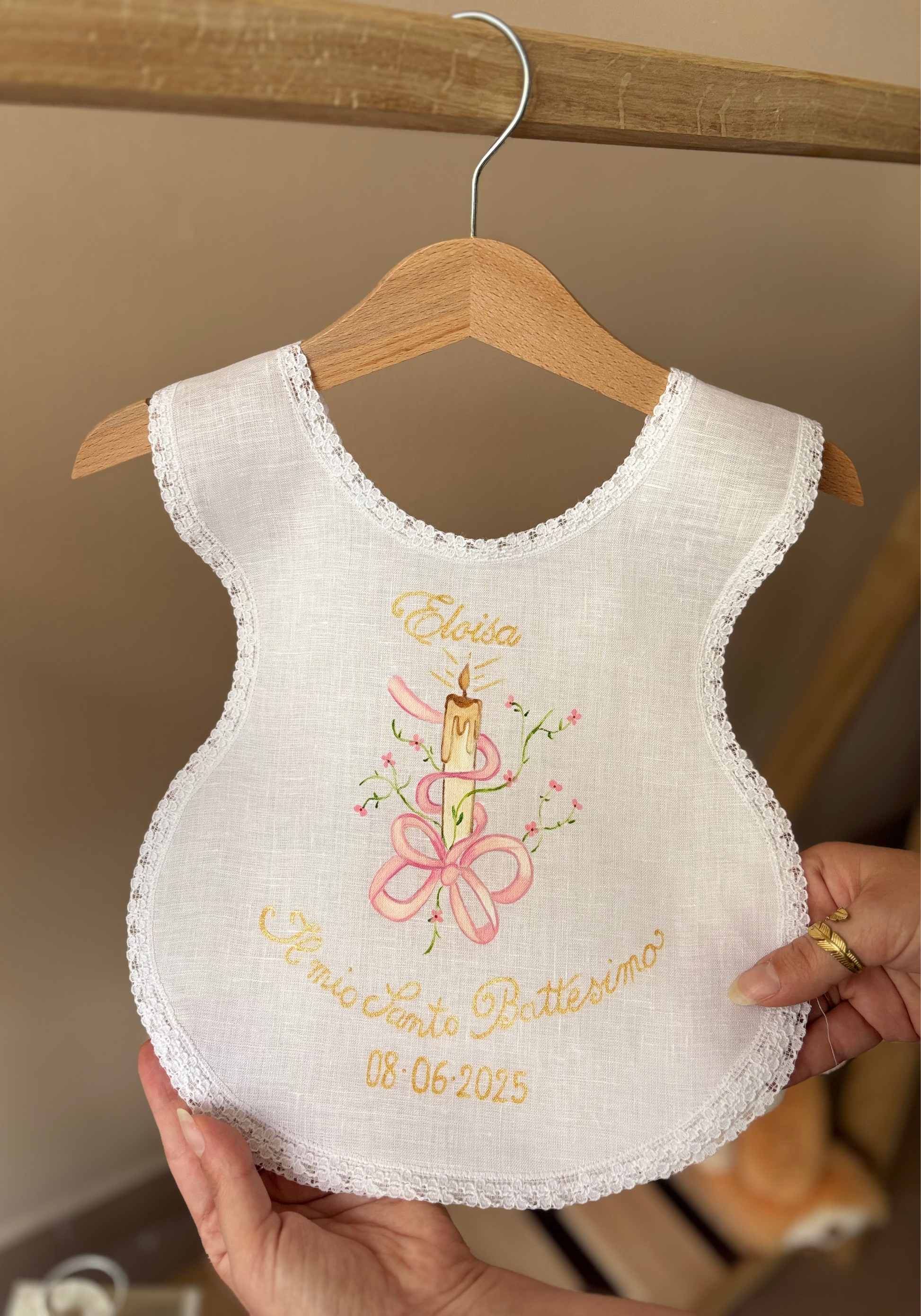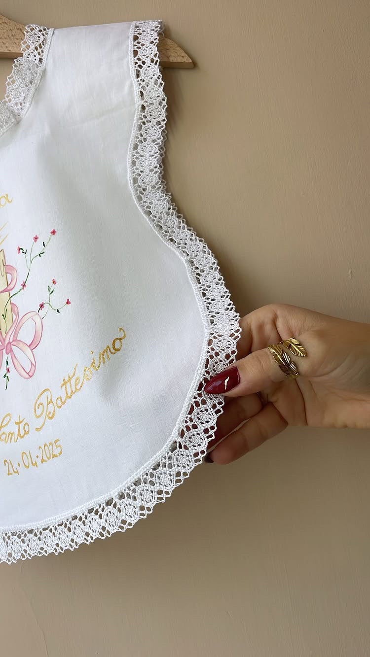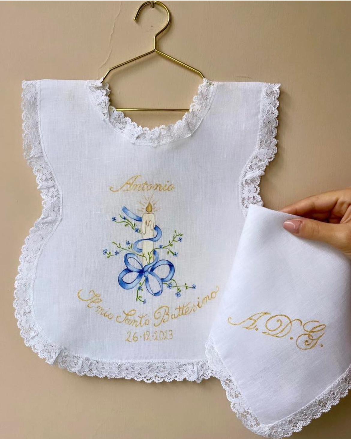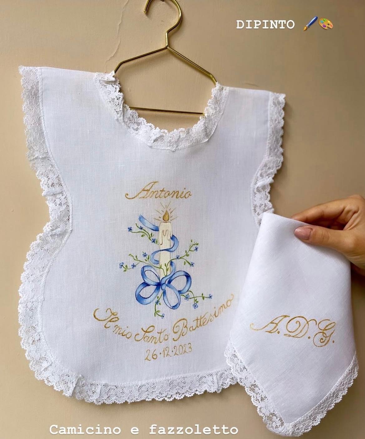 Camicino battesimale realizzabile in puro lino o 100% cotone. Dipinto a mano con colori specifici per il tessuto. Taglia unica.