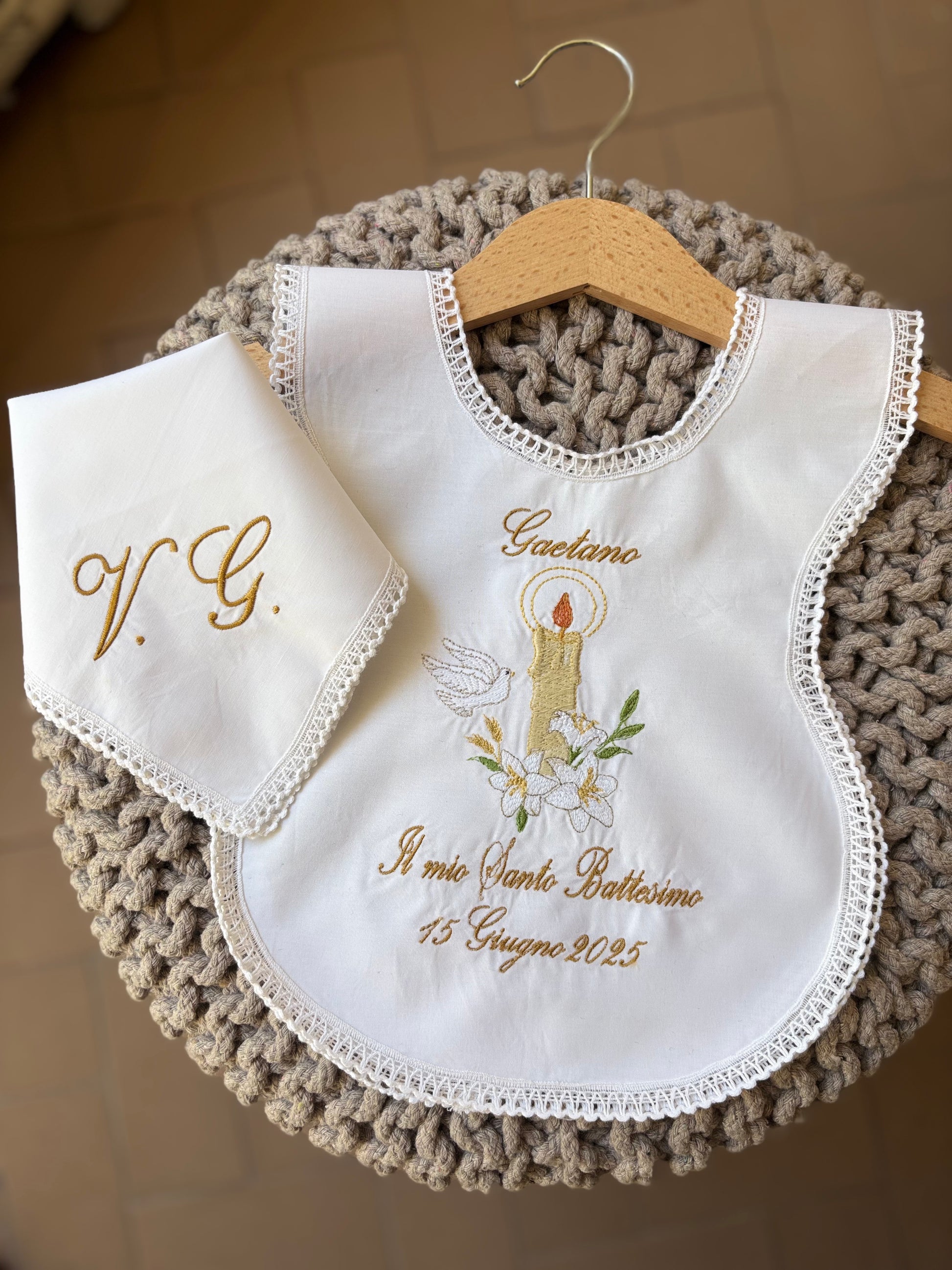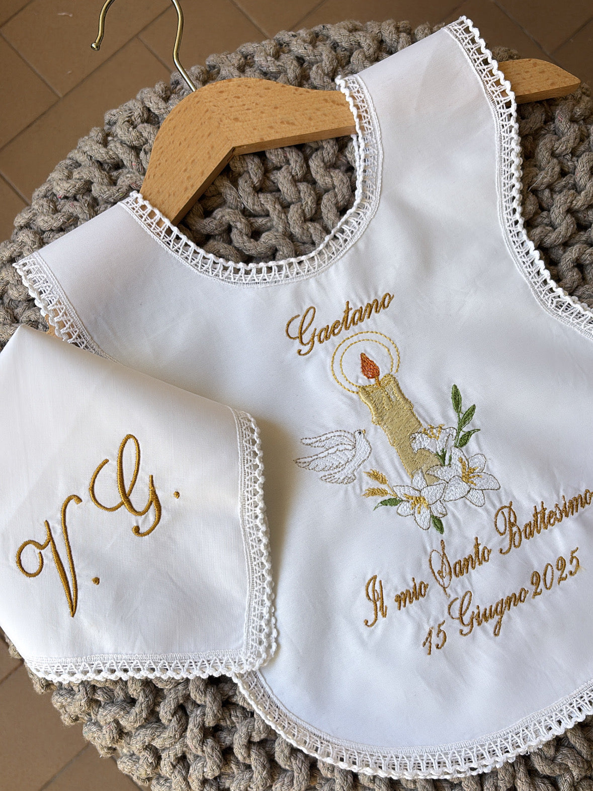 Esempio -> Nome da ricamare: Sara. Data del Battesimo: 20/10/2024. Numero merletto: 6