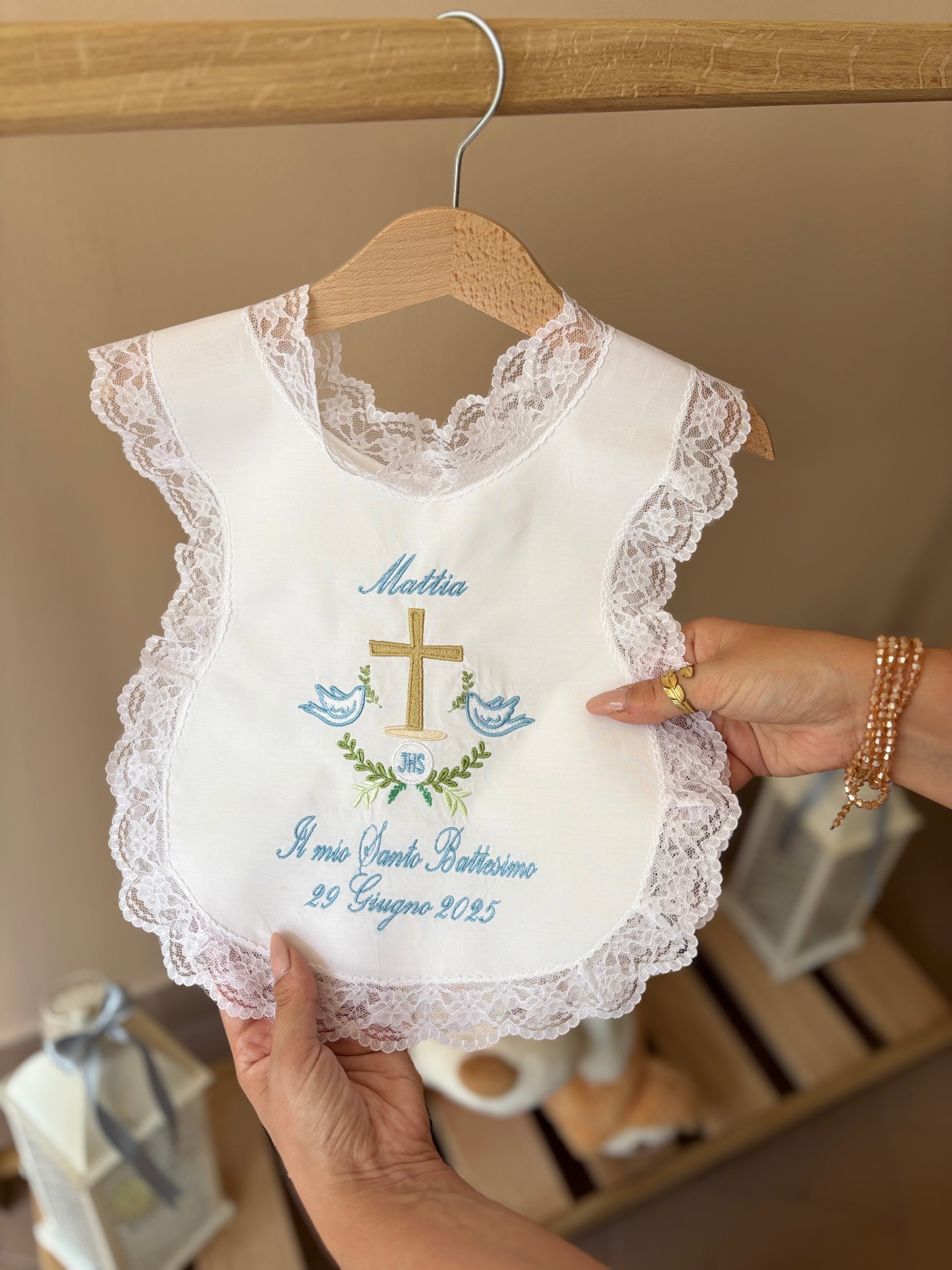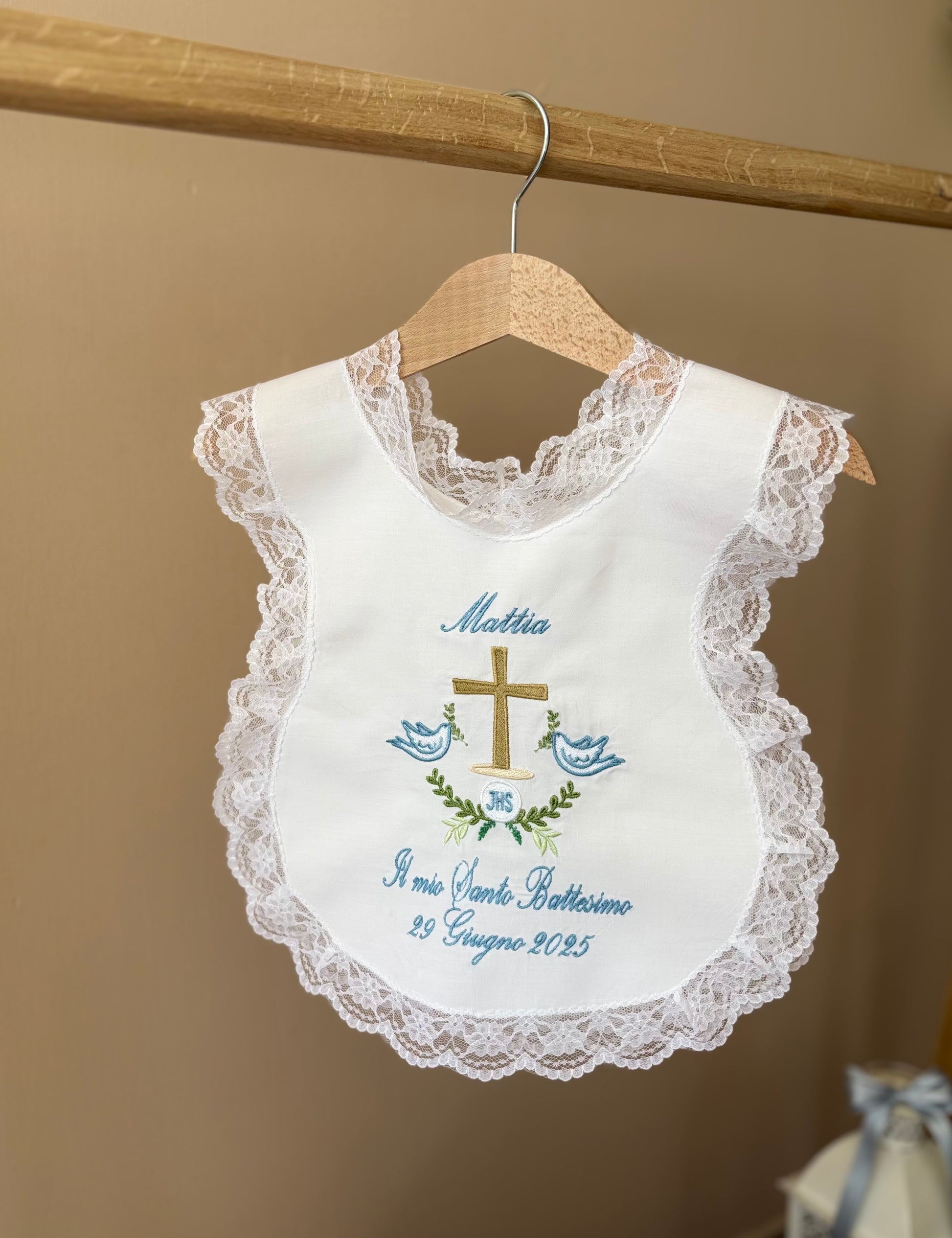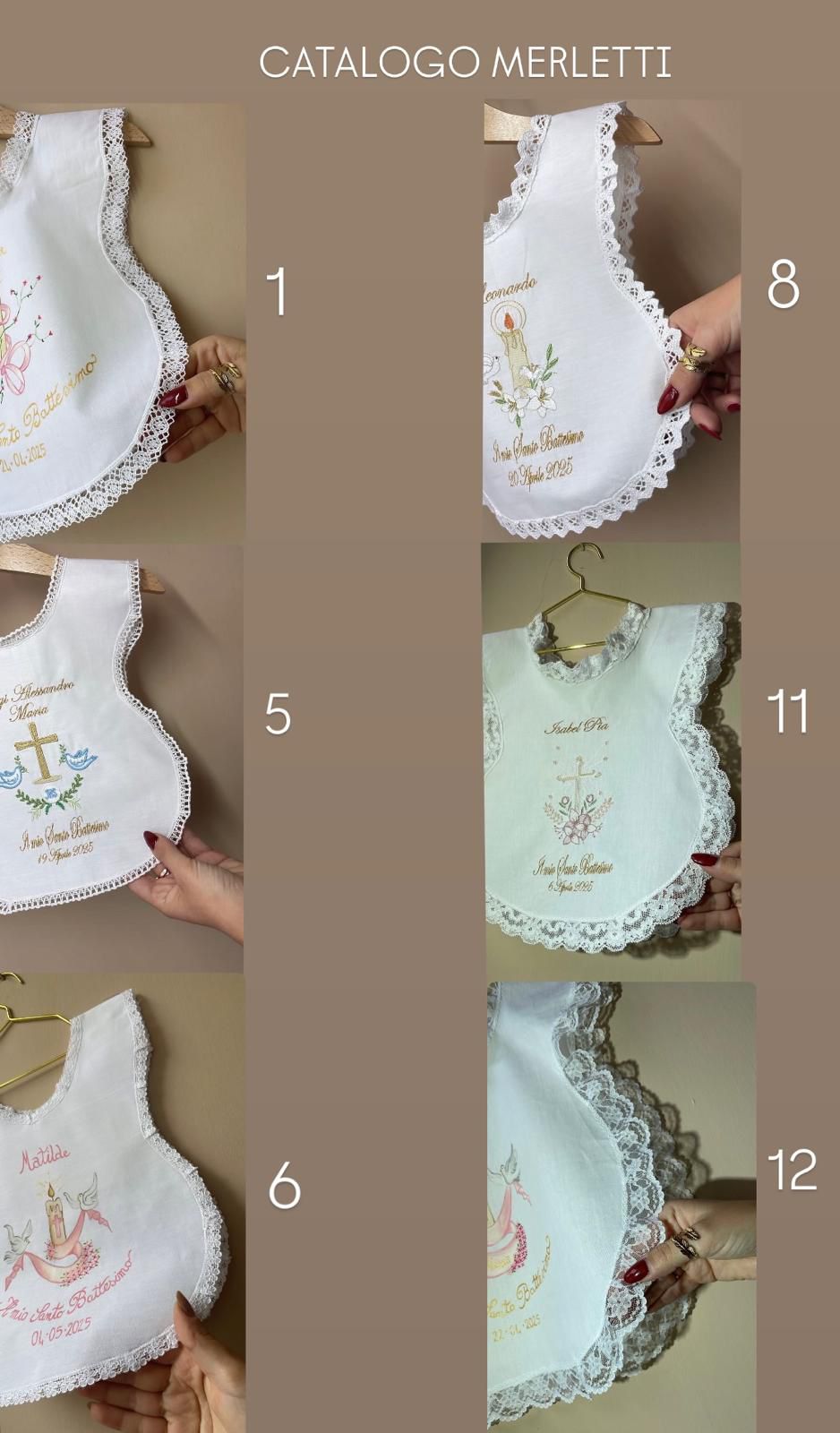 Esempio--> Nome da ricamare: Mario. Data Battesimo: 20/04/2025. Numero merletto 8