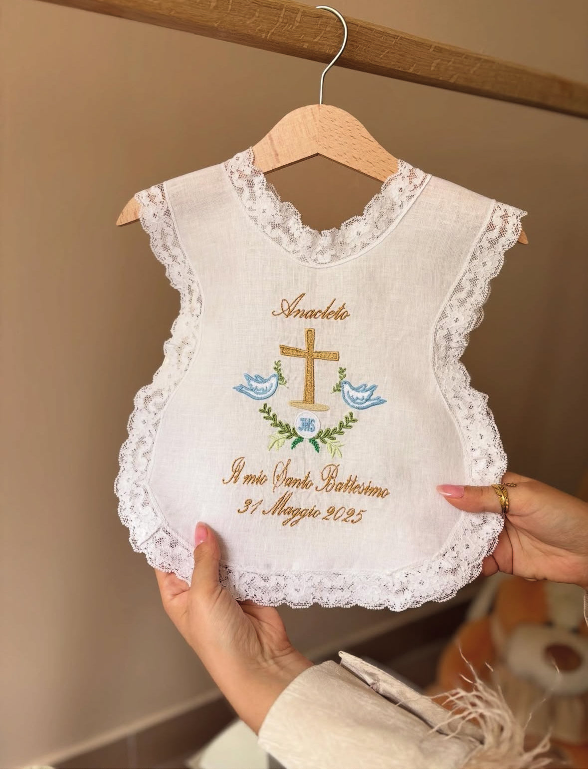 Camicino battesimale realizzabile in puro lino o 100% cotone. Personalizzato con ricamo a macchina. Taglia unica.