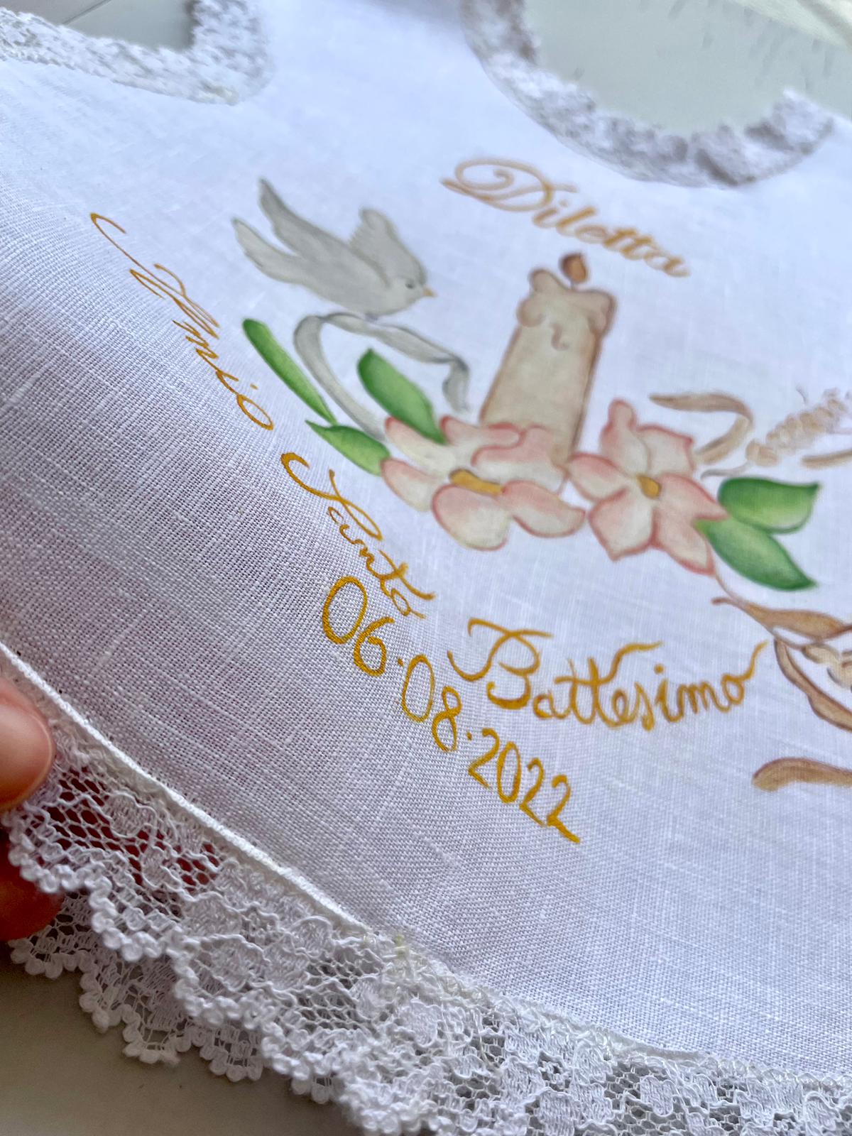 Camicino battesimale realizzabile in puro lino o 100% cotone. Dipinto a mano con colori specifici per il tessuto. Taglia unica.