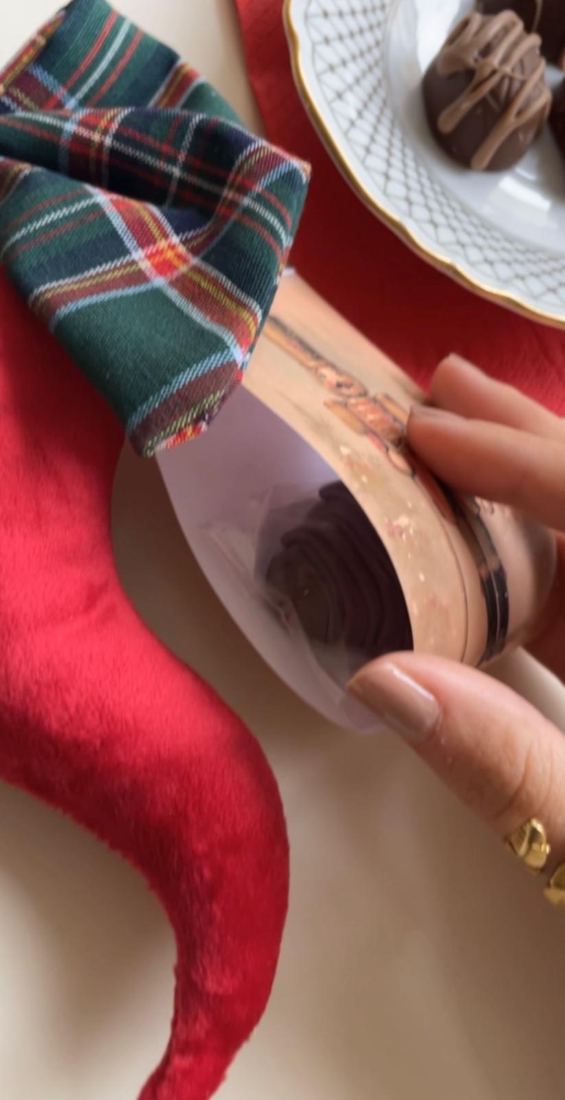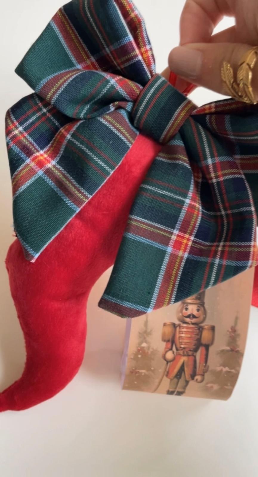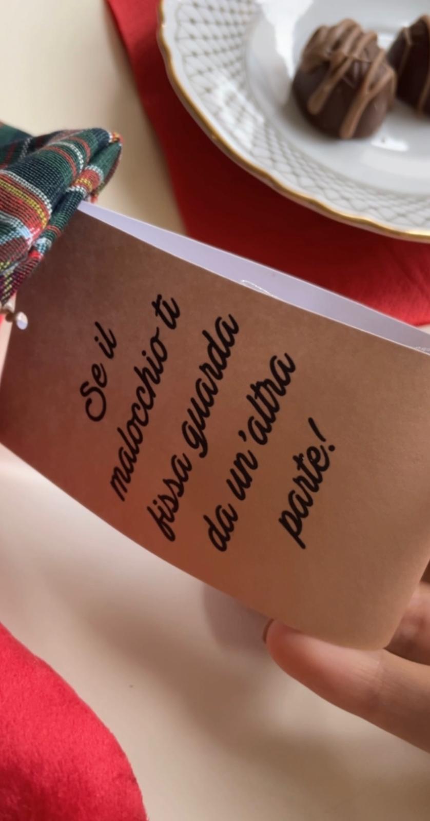 Corno in velluto rosso con fiocco in tartan scozzese verde ed impreziosito da un tag con frase "Se il malocchio ti fissa guarda da un'altra parte!" e contenente un gustoso cioccolatino con ripieno a sorpresa. Il corno è dotato di un cappietto in modo da poterlo posizionare dove preferisci.