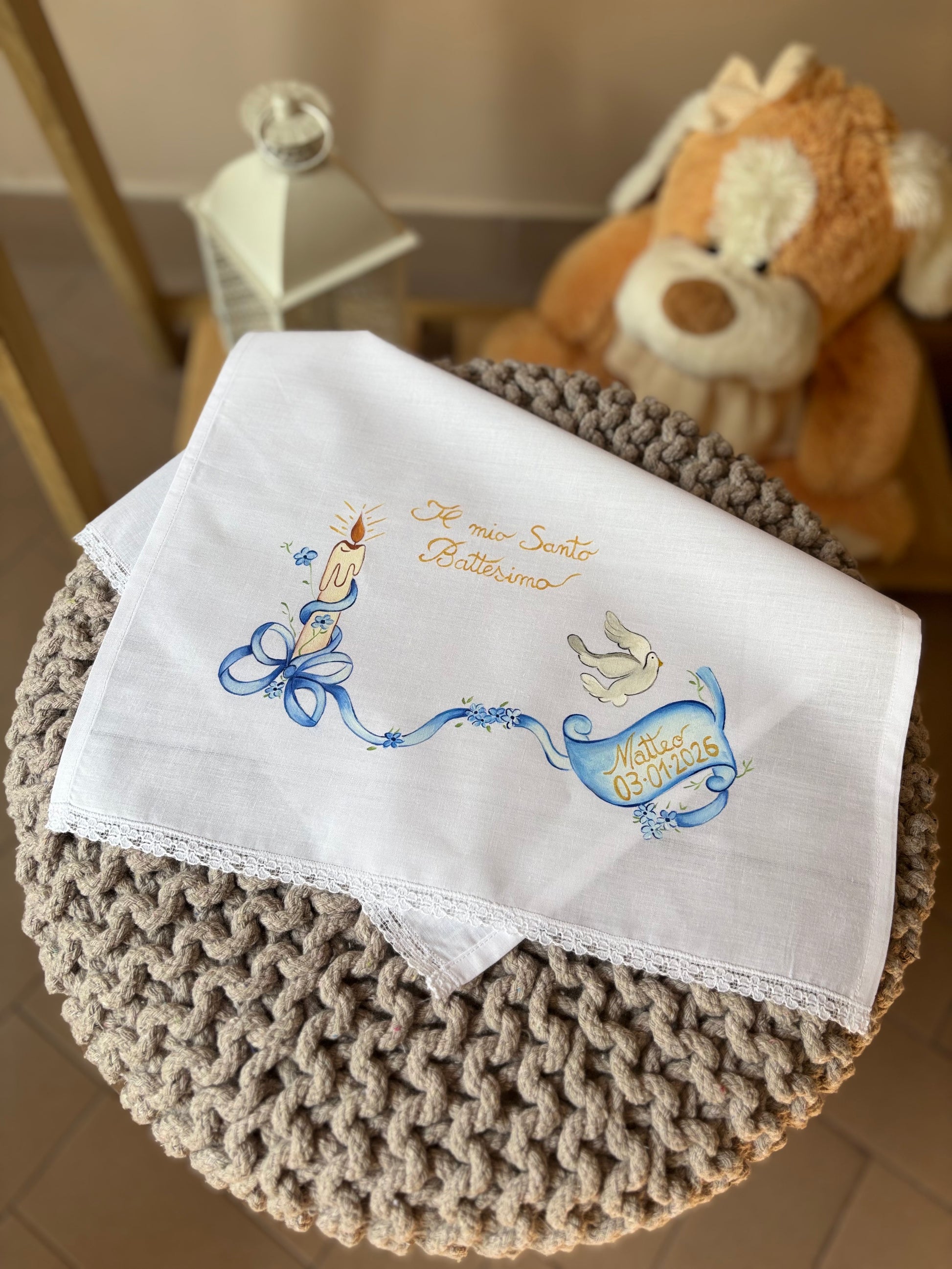 Asciugamano battesimale realizzabile in lino o 100% cotone personalizzata con disegno dipinto a mano. Misura 35x45 cm