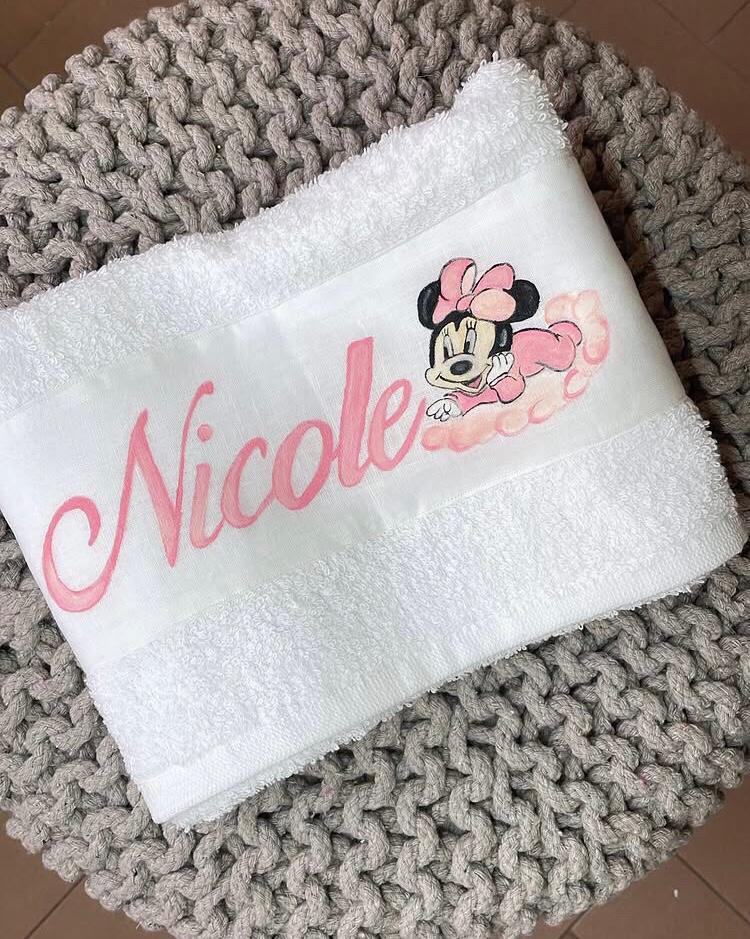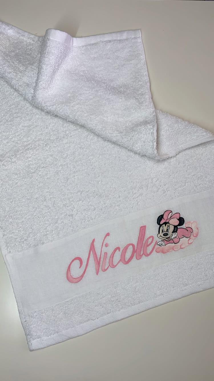 Asciugamano ideale per avvolgere il bimbo dopo il bagnetto facendolo sentire dolcemente coccolato dalla morbidezza della sua spugna di cotone 100% italiana. Il prodotto è personalizzato con nome e disegno di Minnie dipinti a mano.