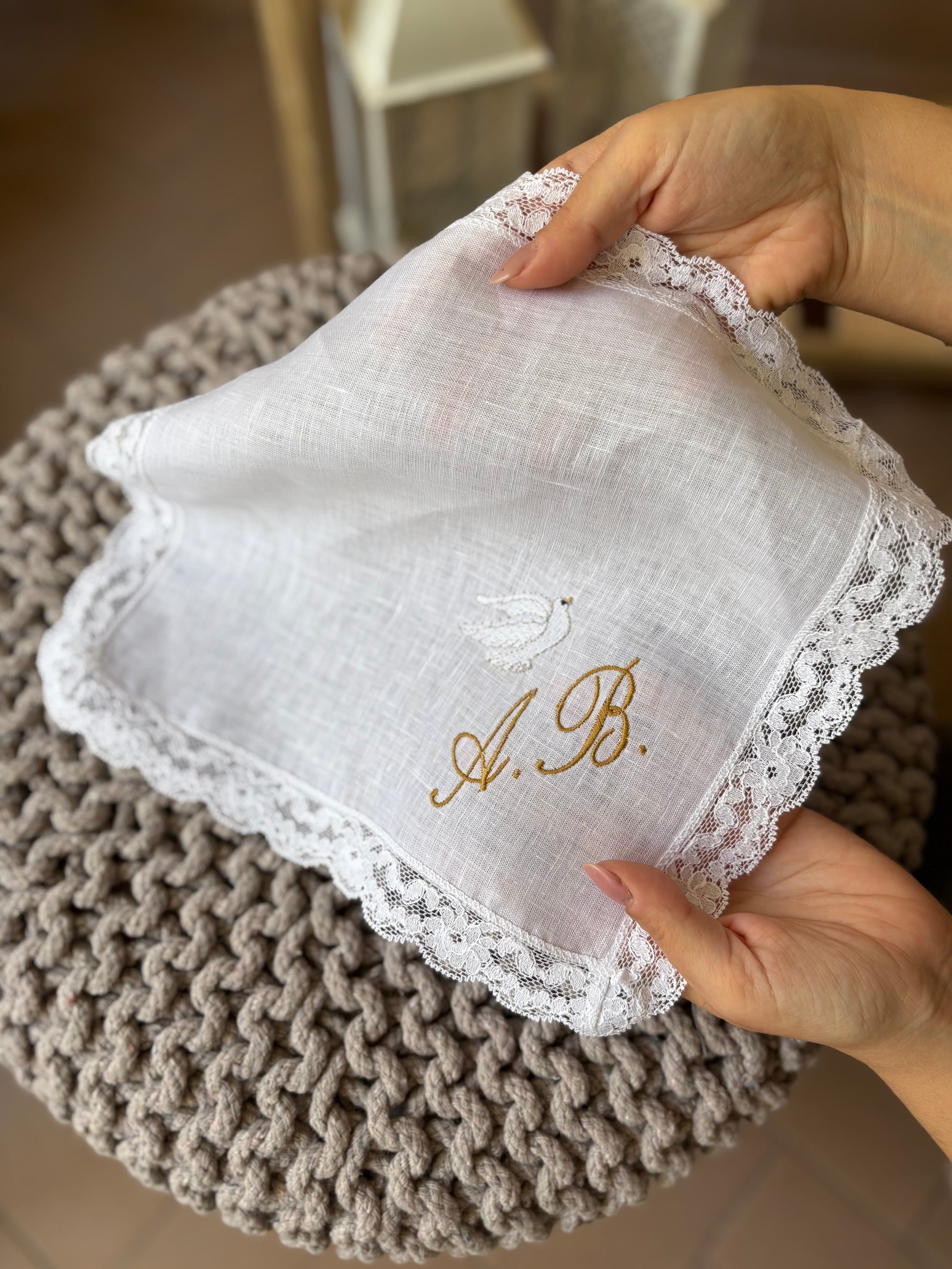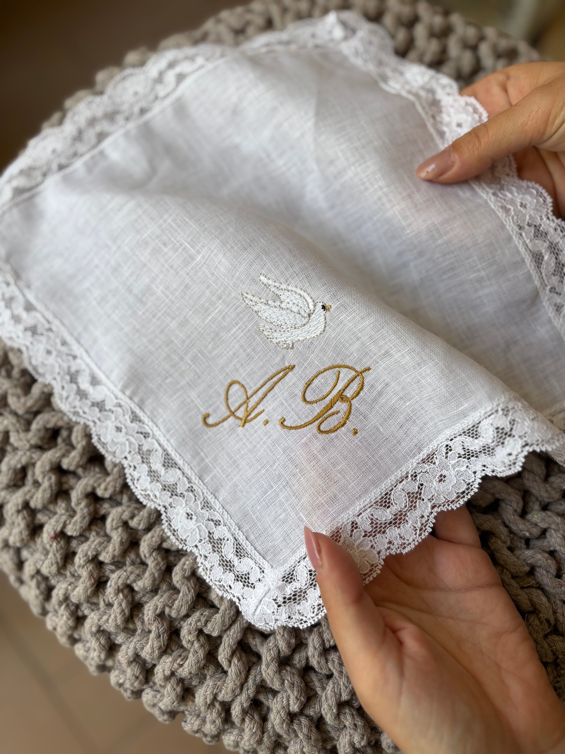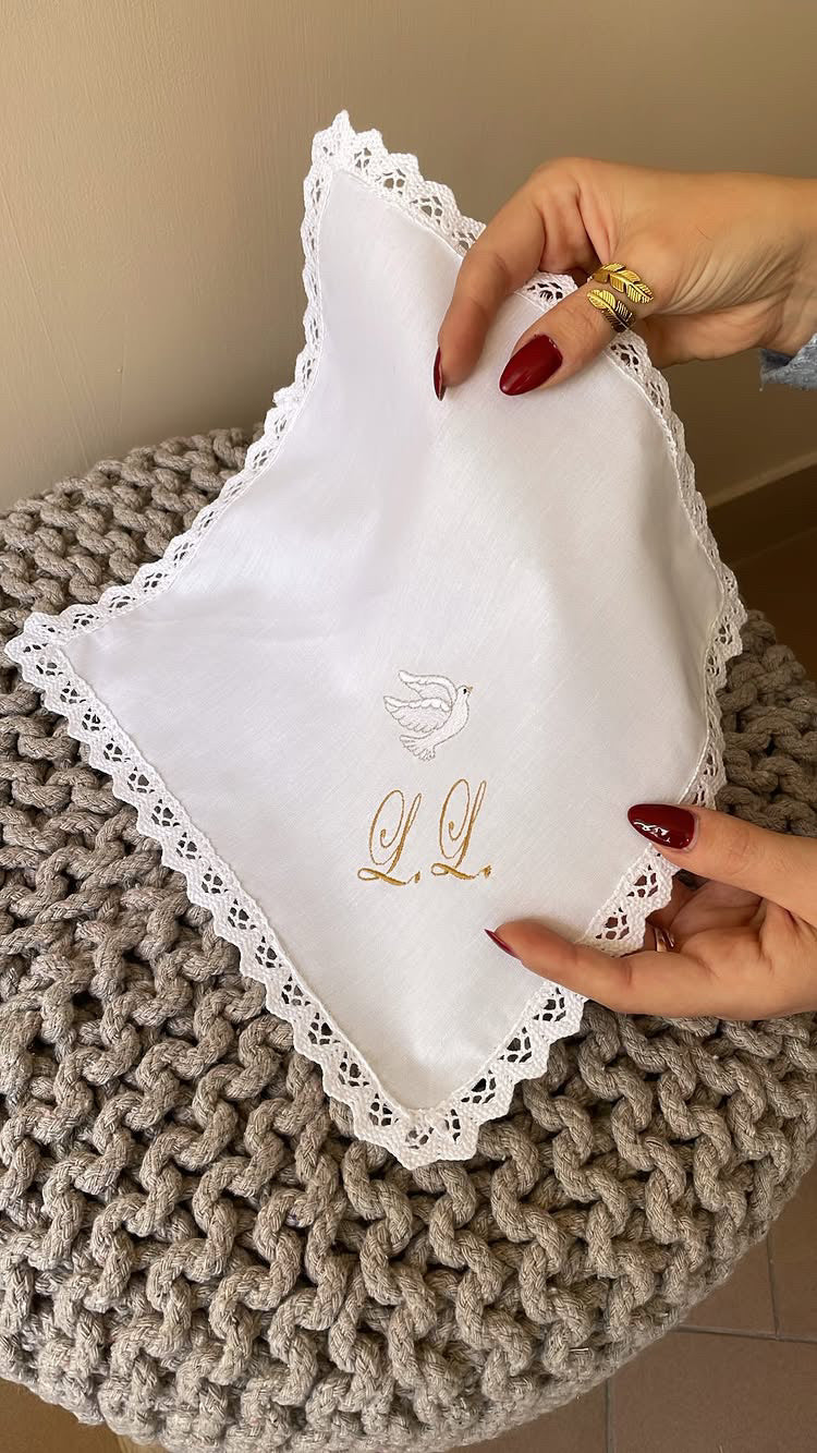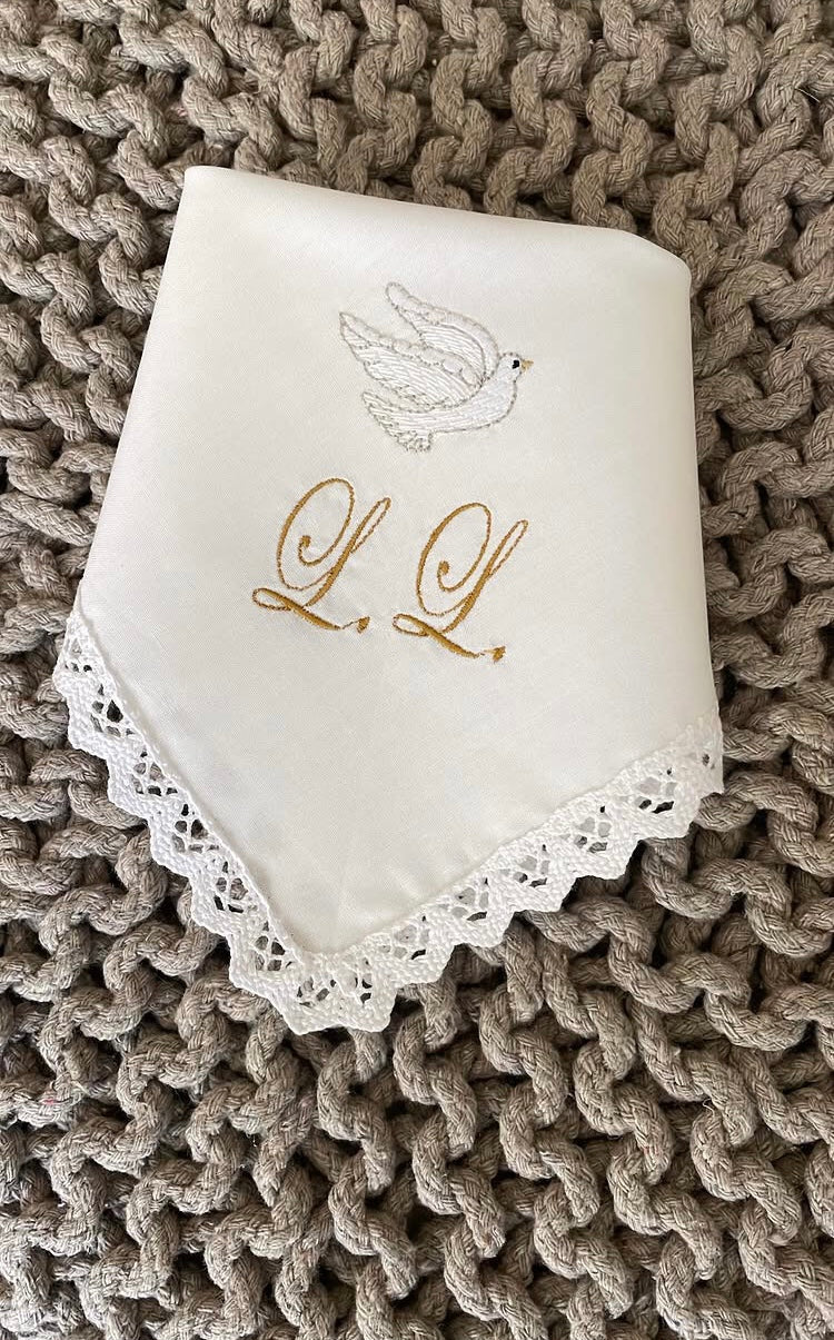 Fazzoletto battesimale realizzabile in puro lino o 100% cotone. Il fazzoletto è personalizzato con le iniziali ricamate e una graziosa colomba. Misura 25x25 cm