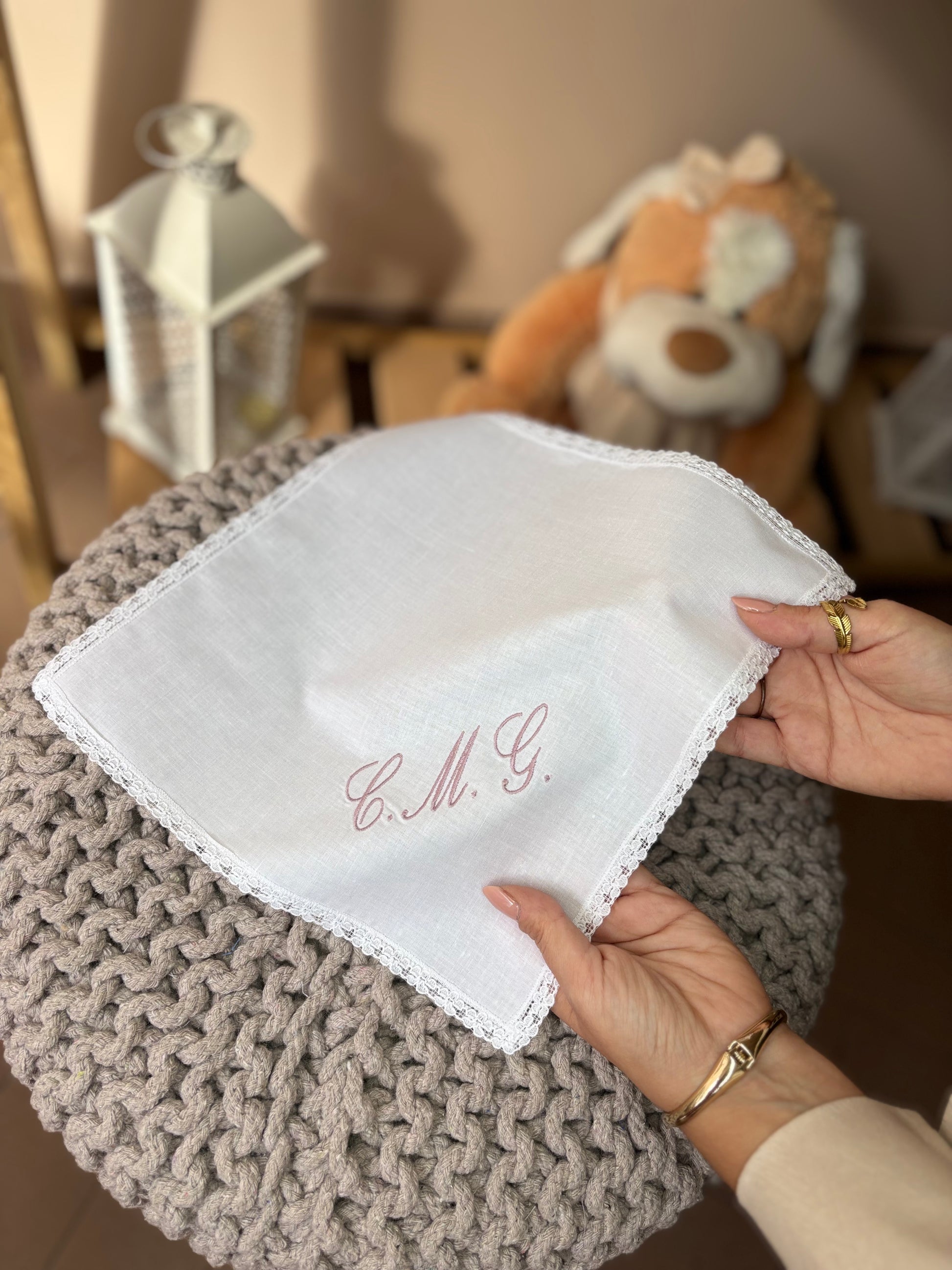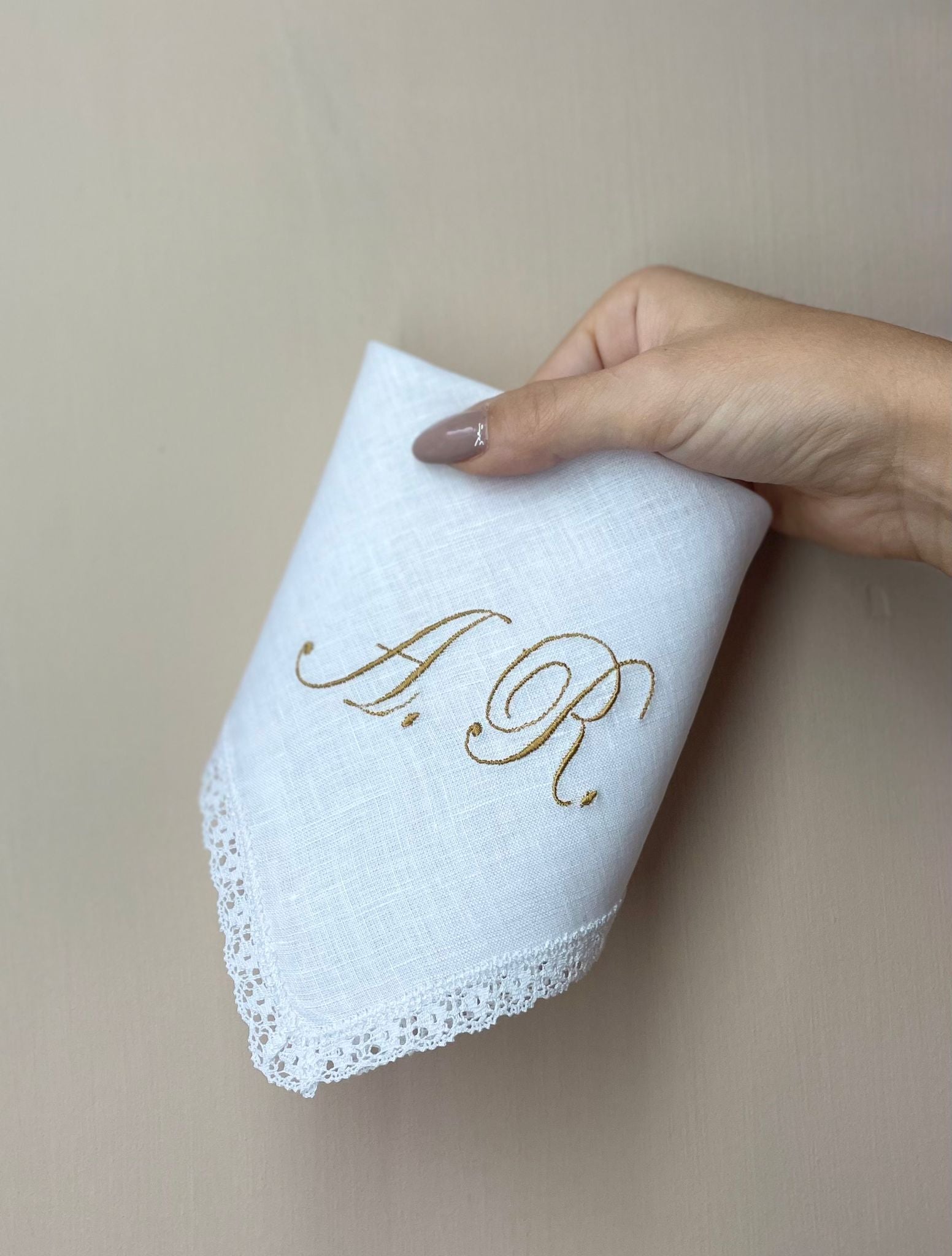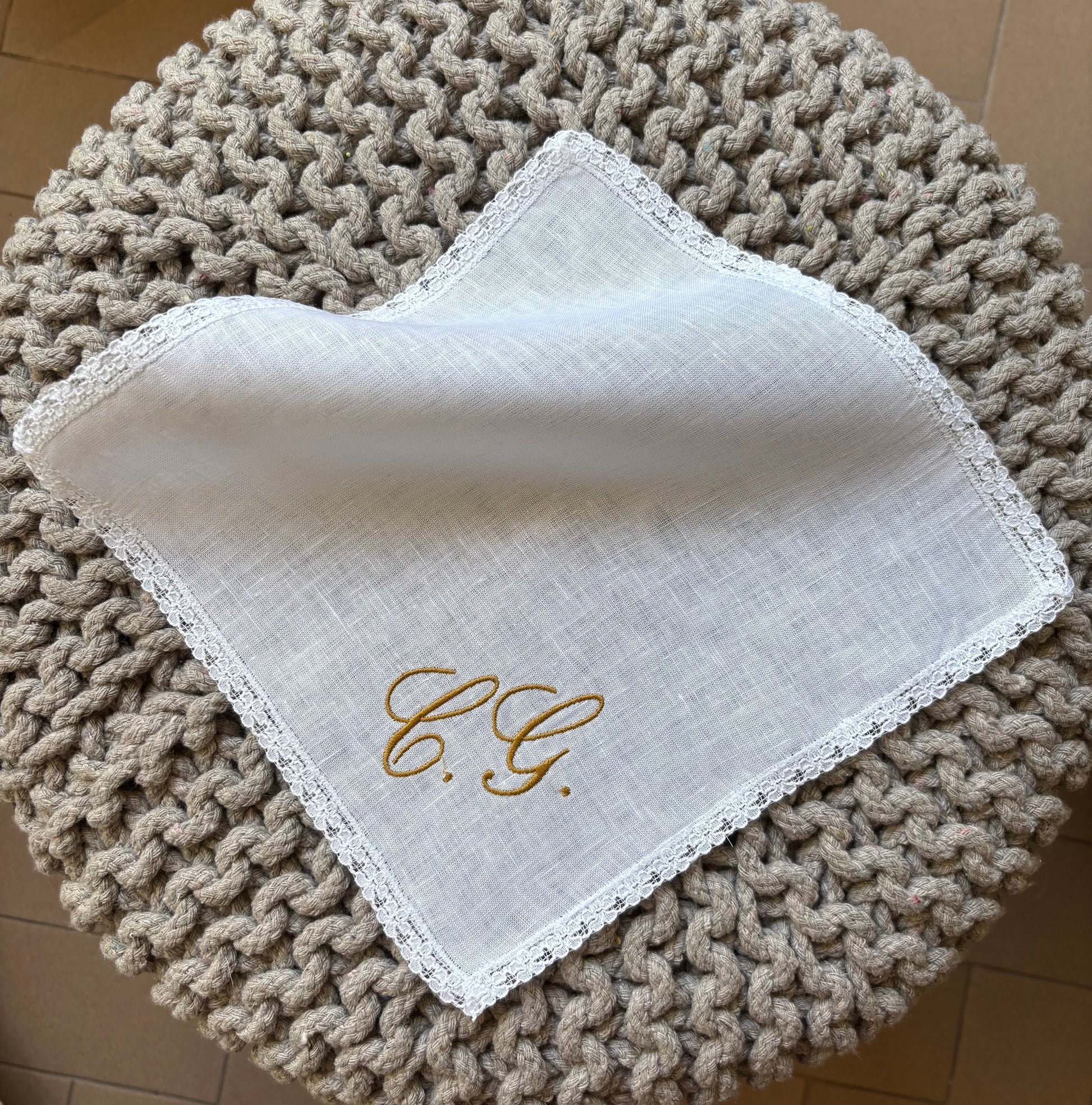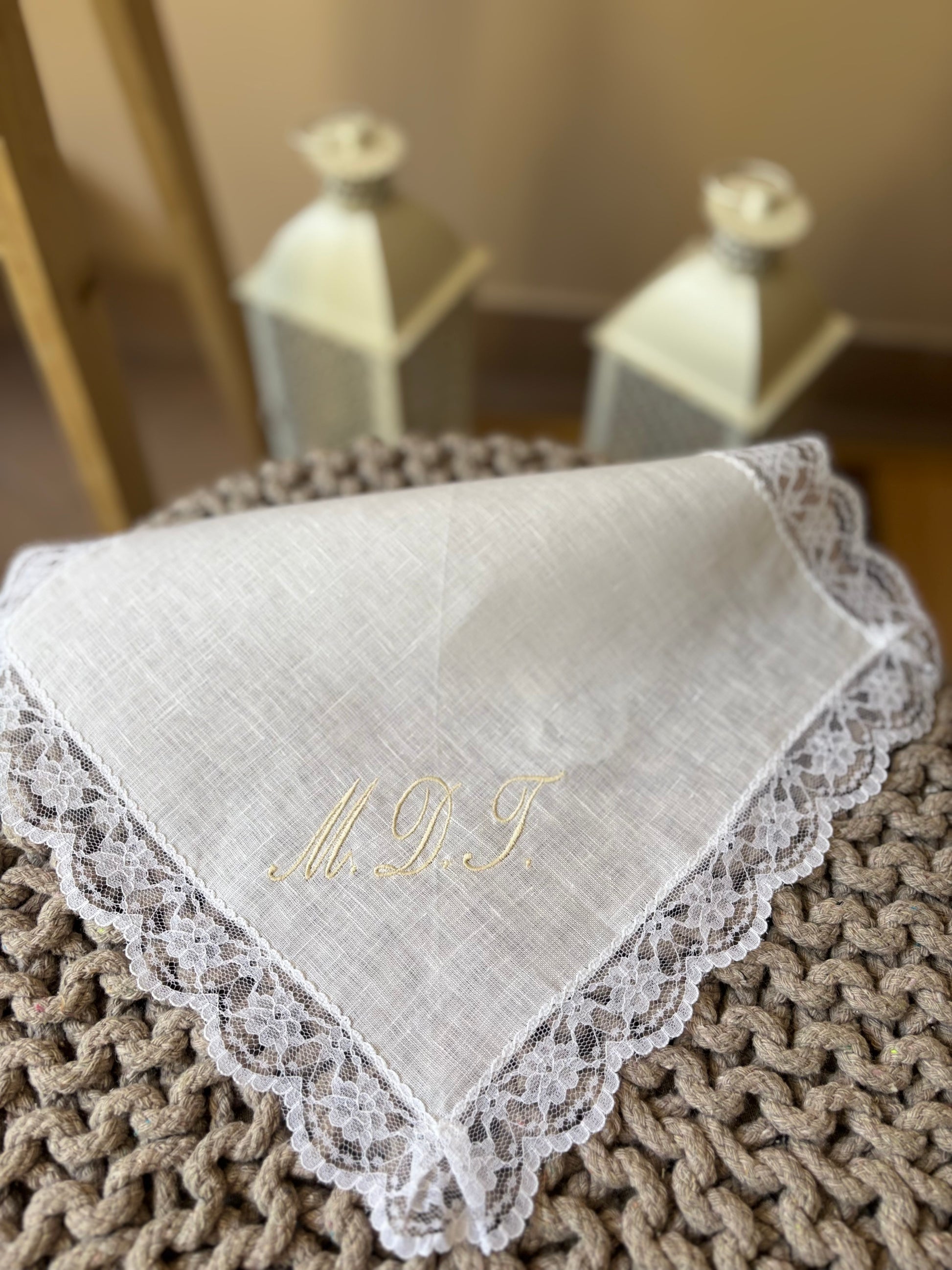 Fazzoletto battesimale realizzabile in puro lino o 100% cotone. Il fazzoletto è personalizzato con iniziali ricamate. Misura 25x25 cm
