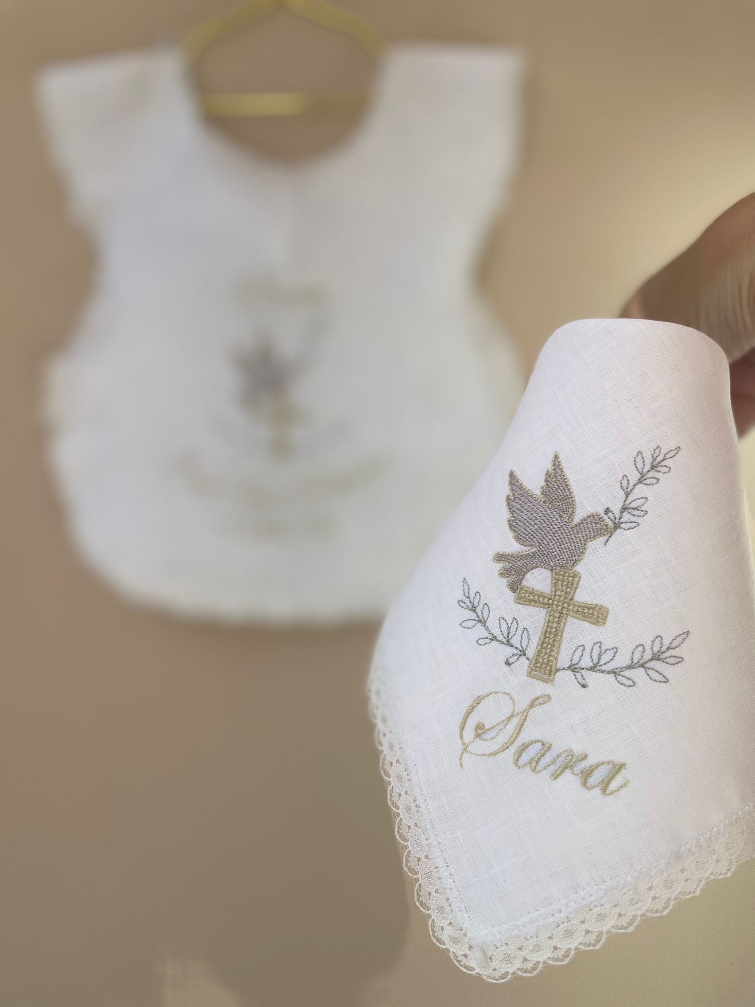 Fazzoletto battesimale realizzabile in puro lino o 100% cotone. Il fazzoletto è personalizzato con croce, una graziosa colomba e nome ricamato. Misura 25x25cm