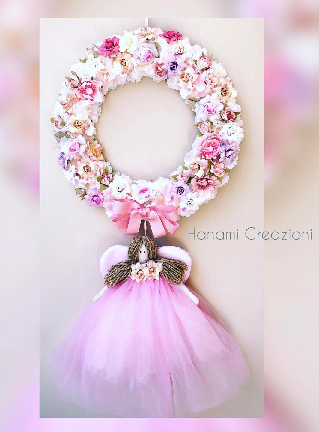 Fiocco nascita con ghirlanda in legno ampiamente decorata con fiori verosimili dalle diverse sfumature di rosa. La parte inferiore presenta una dolcissima fatina dei fiori realizzata interamente a mano. Questo fiocco può essere utilizzato anche dopo la nascita per decorare la cameretta della vostra bimba. Misura: alto circa 60 cm.