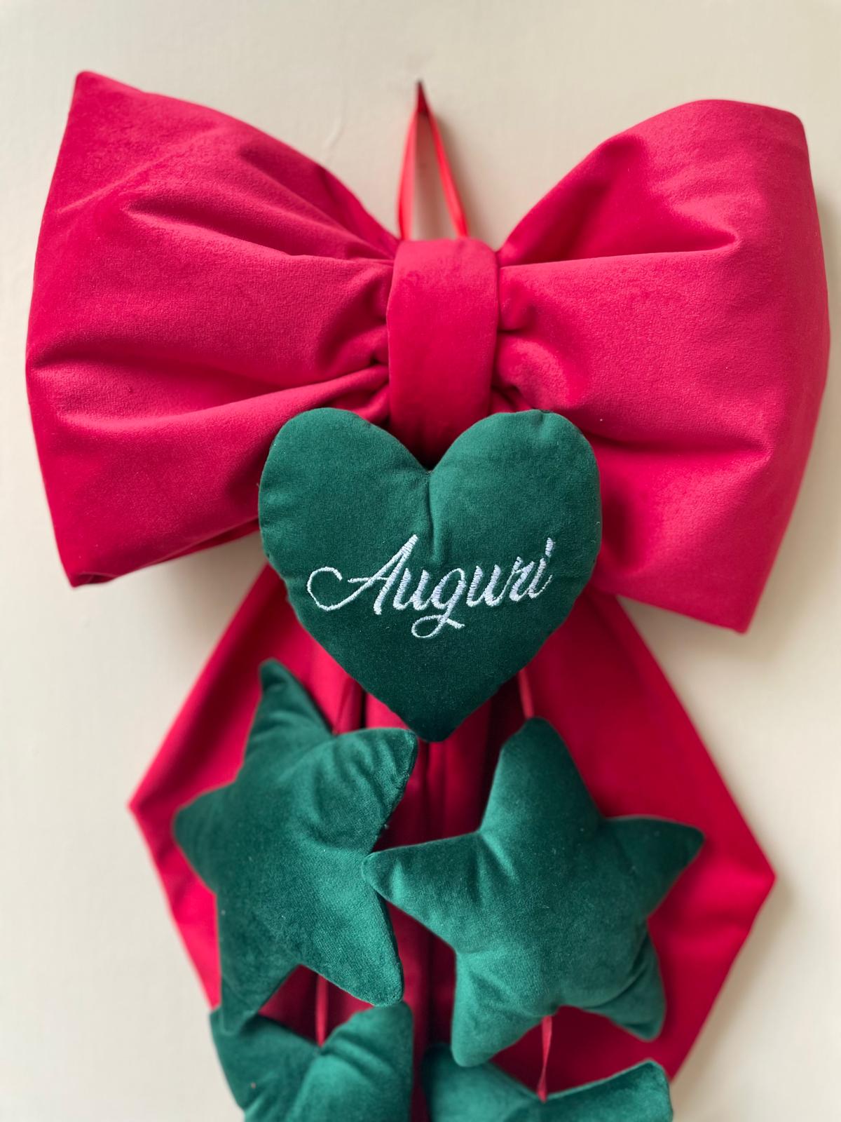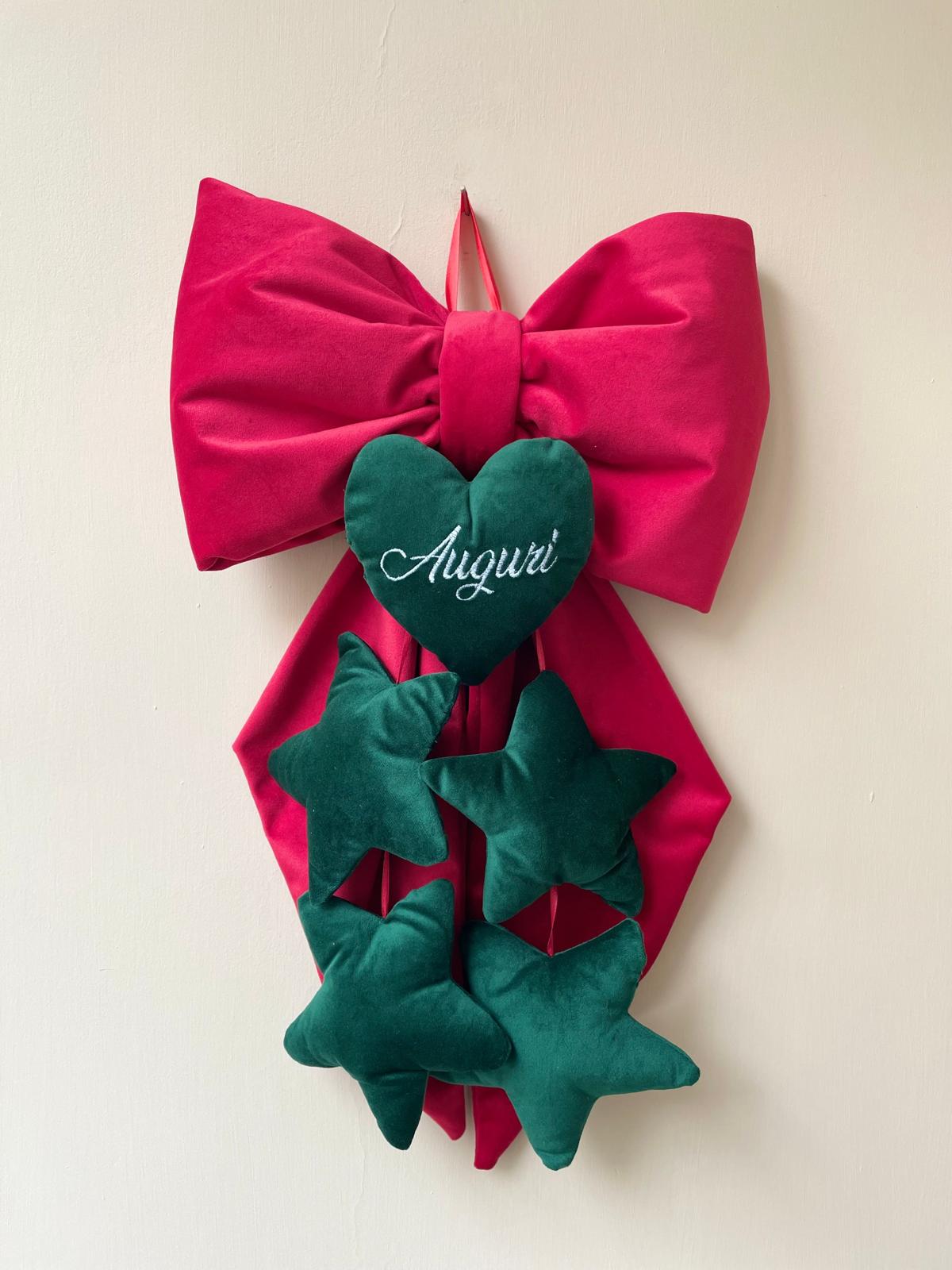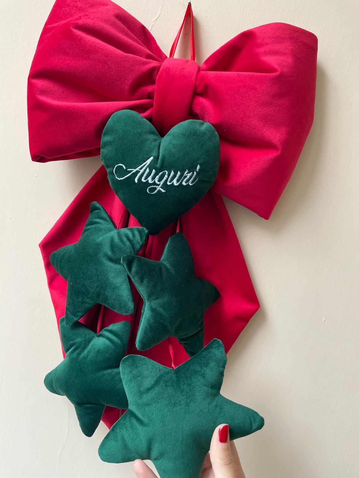 Fiocco in velluto rosso impreziosito con cuori e stelle verdi.