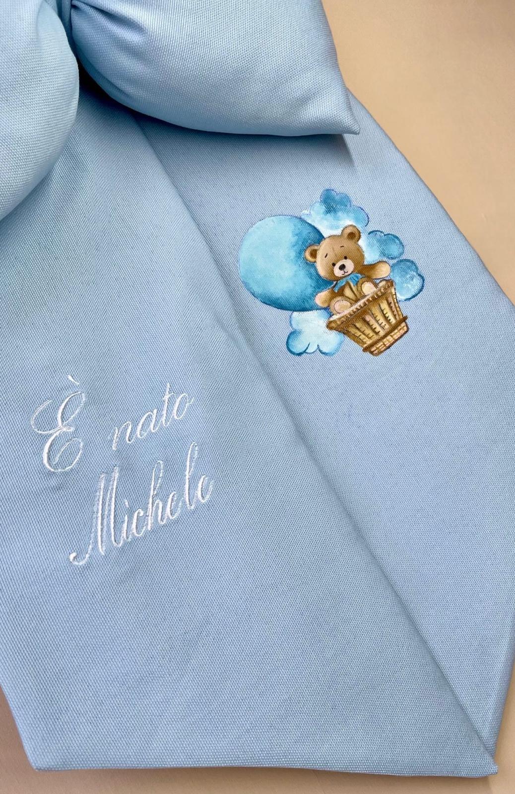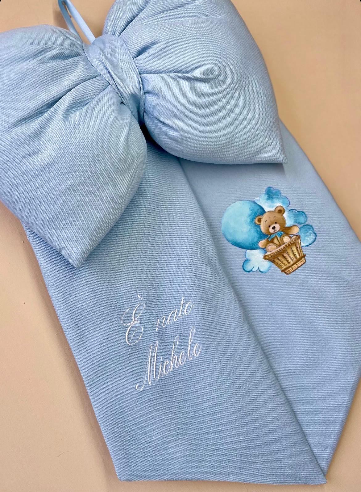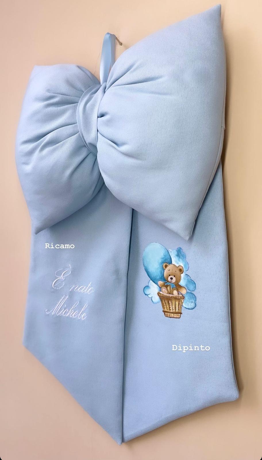 Fiocco nascita realizzato in cotone personalizzato con orsetto su mongolfiera dipinto a mano e nome ricamato a macchina. (N.B. è possibile realizzarlo anche in rosa).