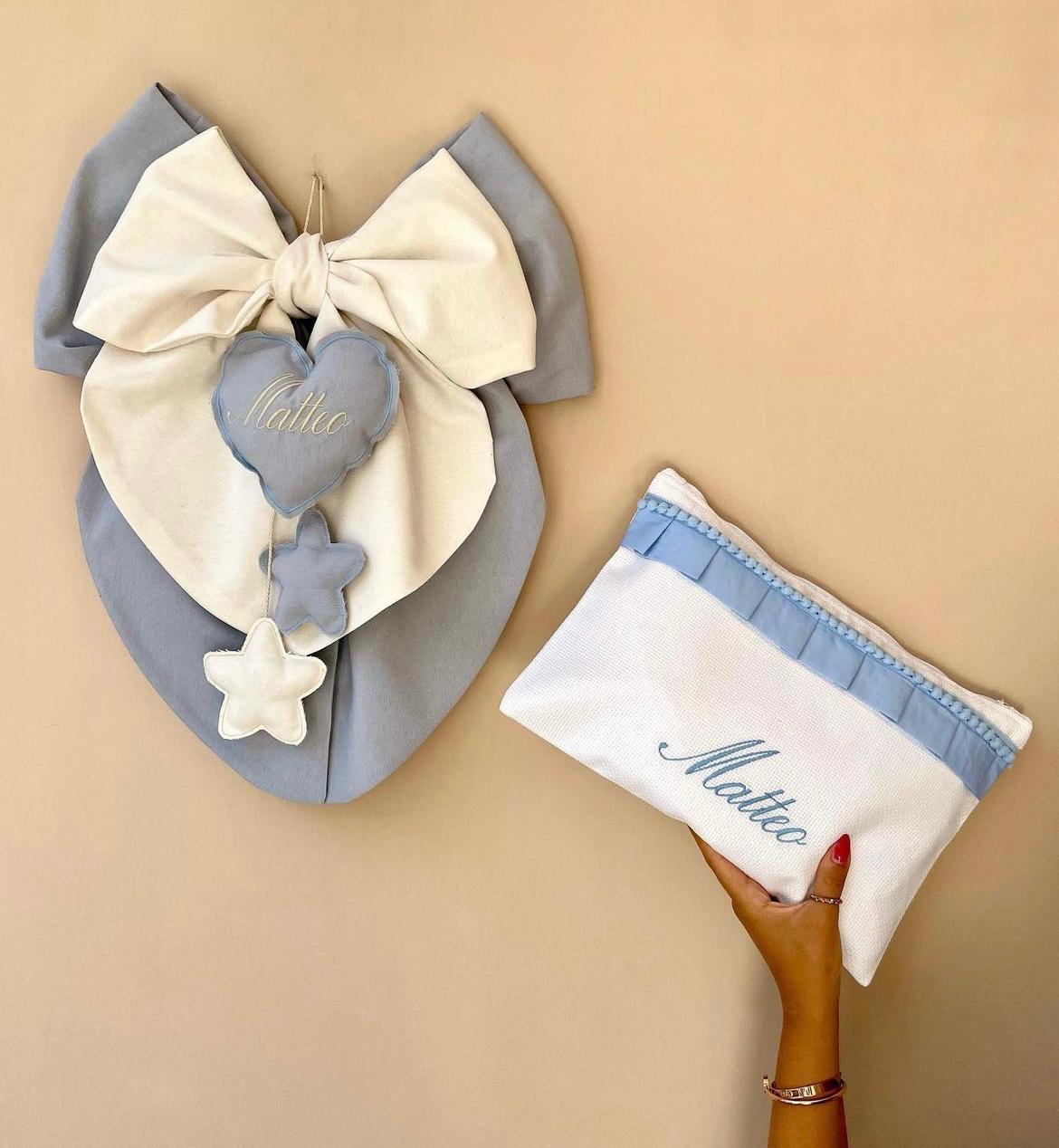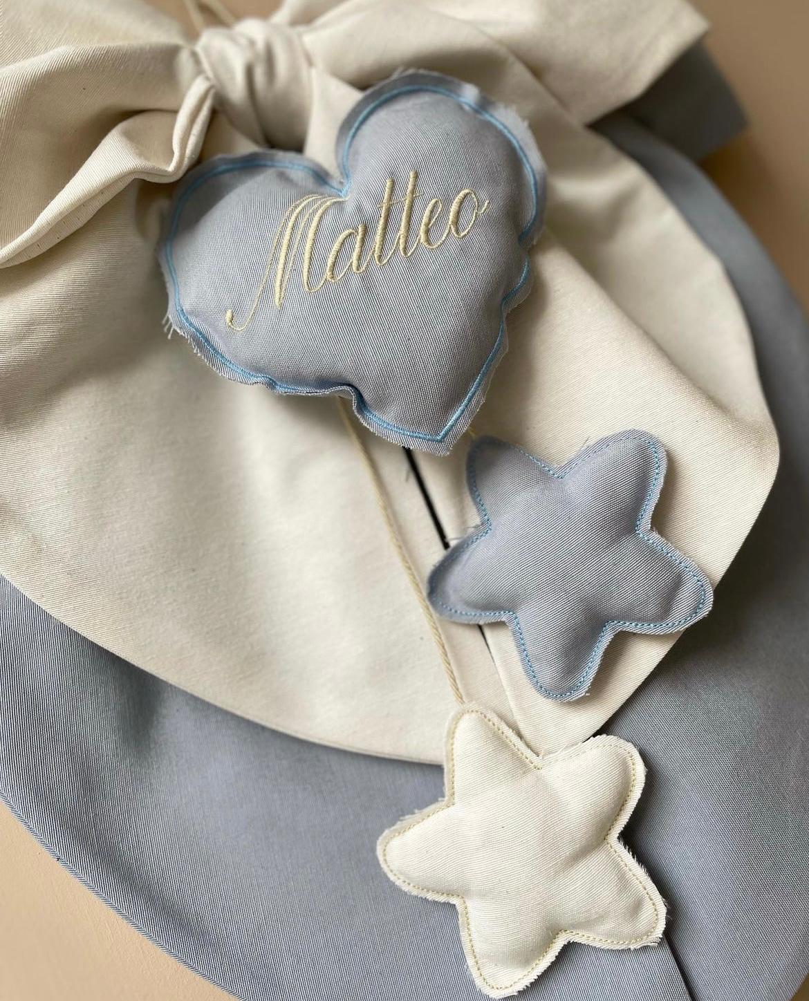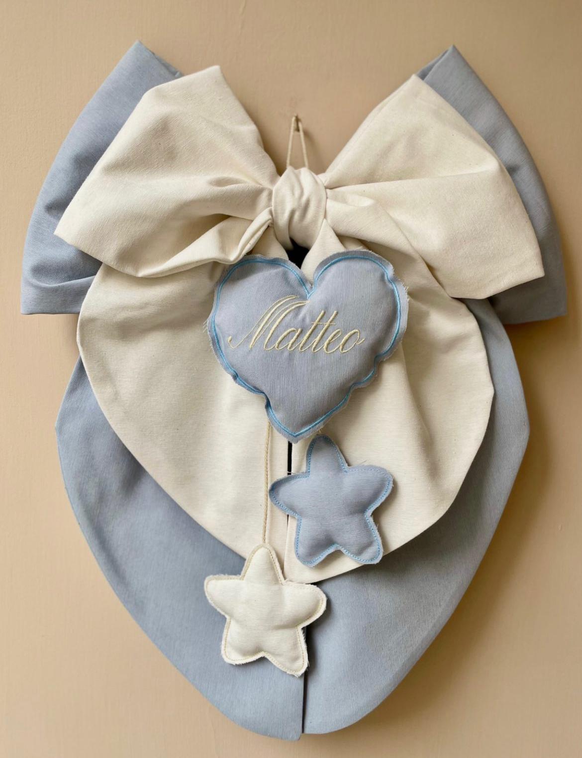 Doppio fiocco realizzato in cotone celeste e panna e arricchito da un cuore centrale con il nome del bimbo ricamato e dal quale scendono due stelle pendenti. È possibile realizzarlo anche in rosa.