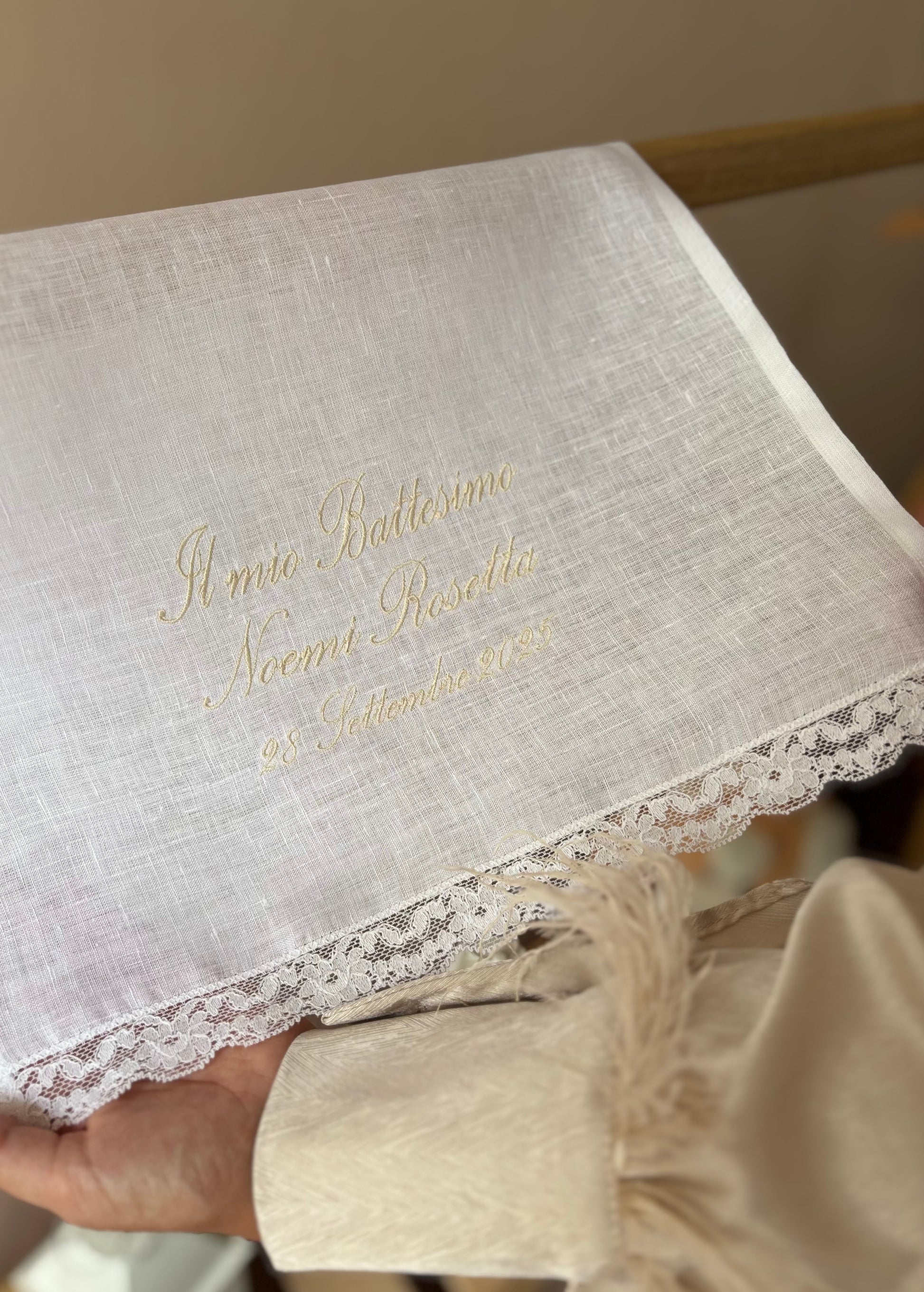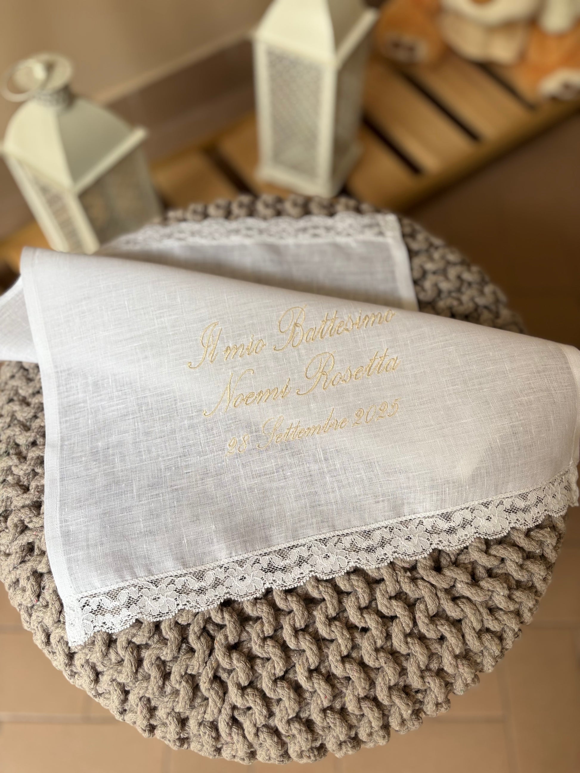 Asciugamano battesimale realizzabile in lino o 100% cotone personalizzata con ricamo a macchina. Misura 35x45 cm