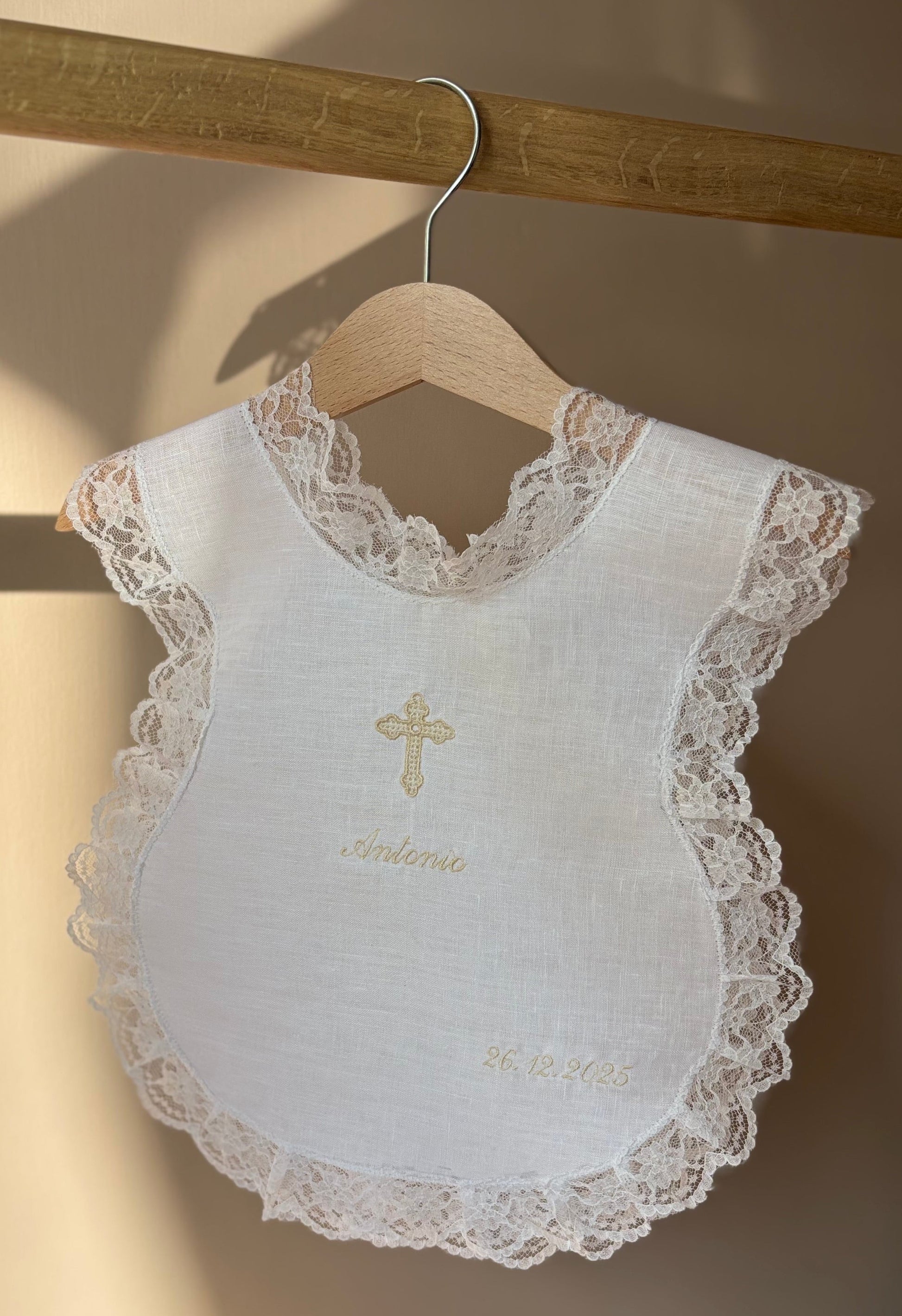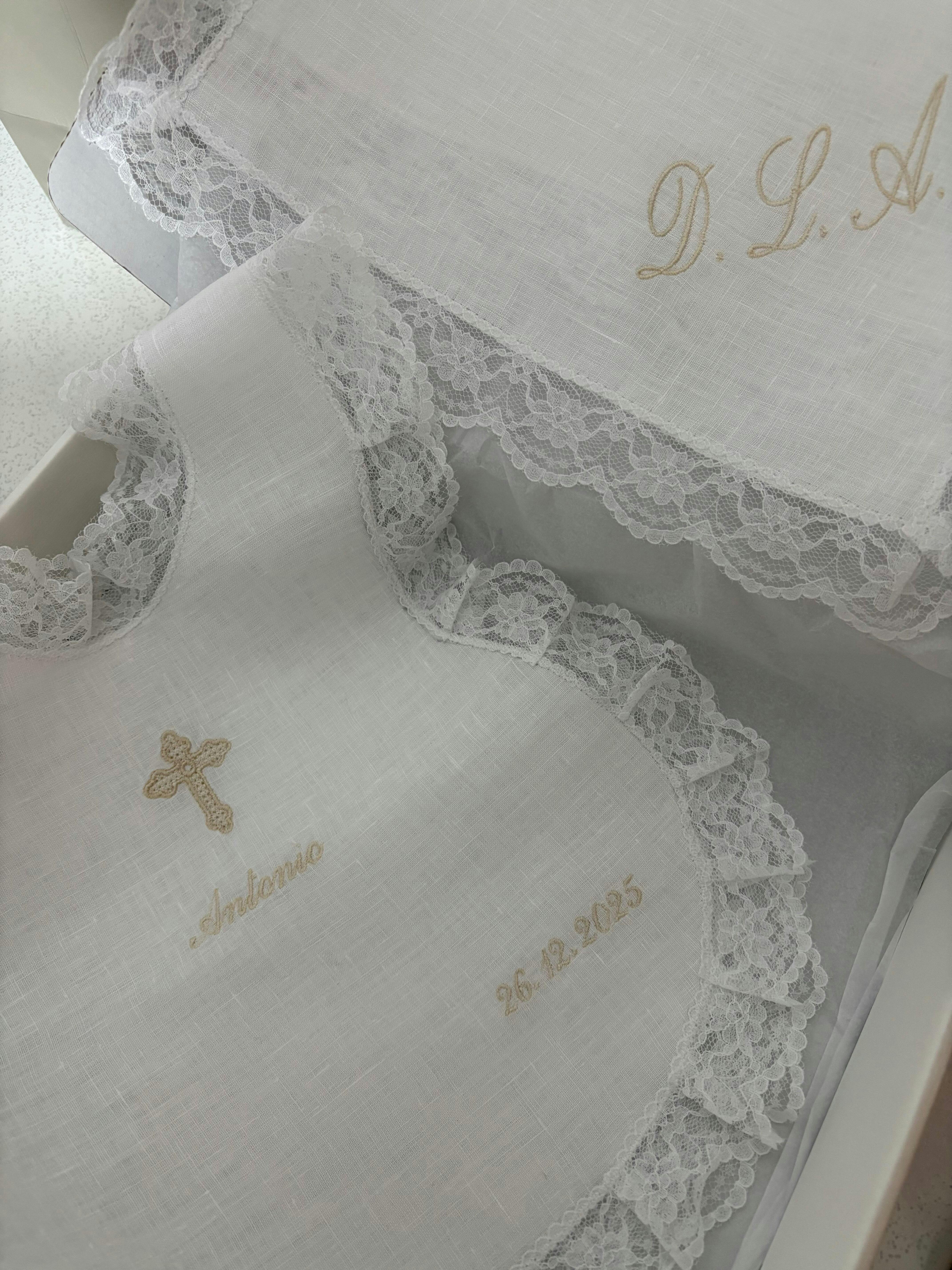 Esempio -> Nome da ricamare: Sara. Data del Battesimo: 20/10/2024. Numero merletto: 12
