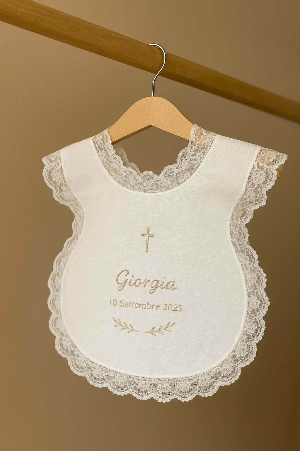 Esempio -> Nome da ricamare: Sara. Data del Battesimo: 20/10/2024. Numero merletto: 6