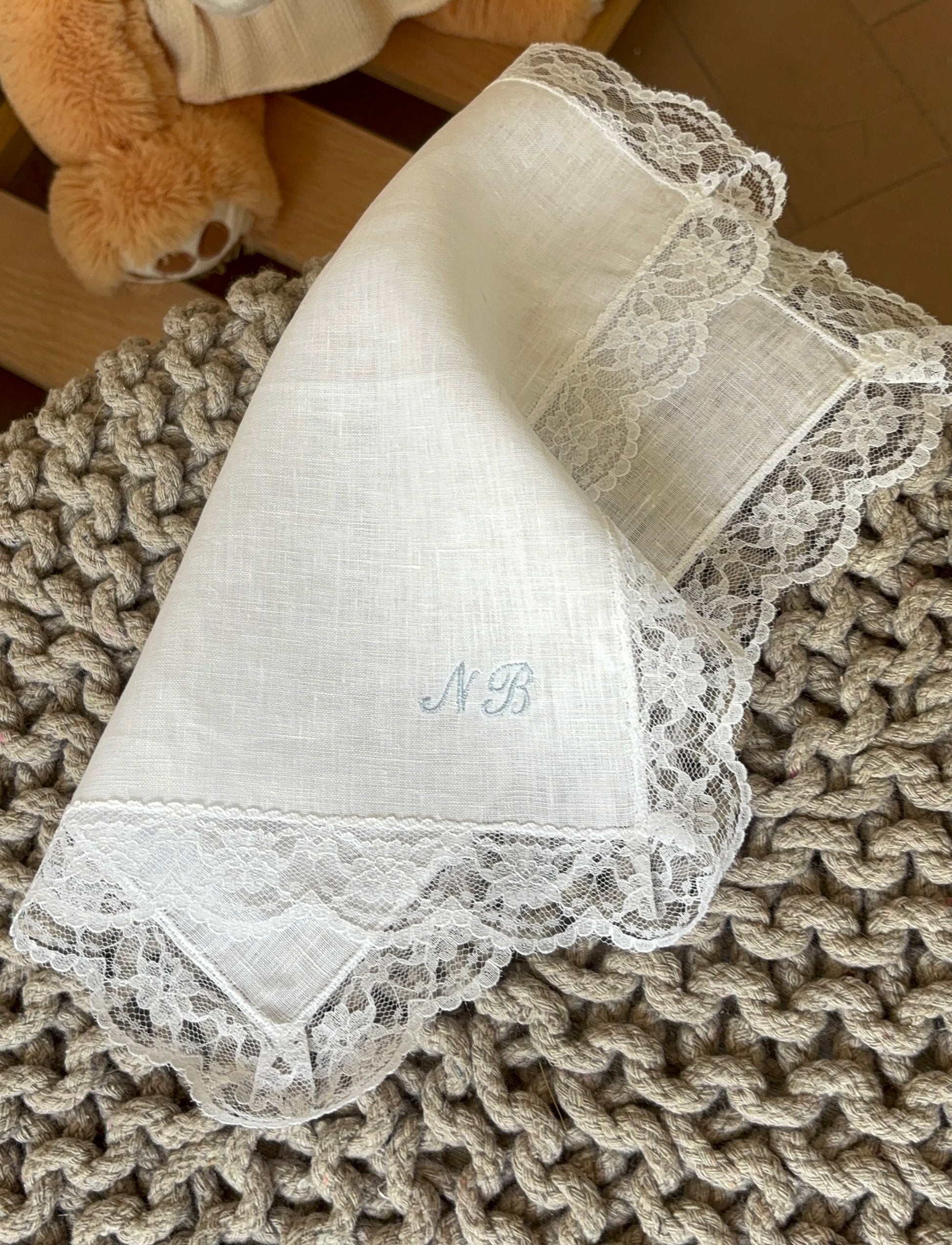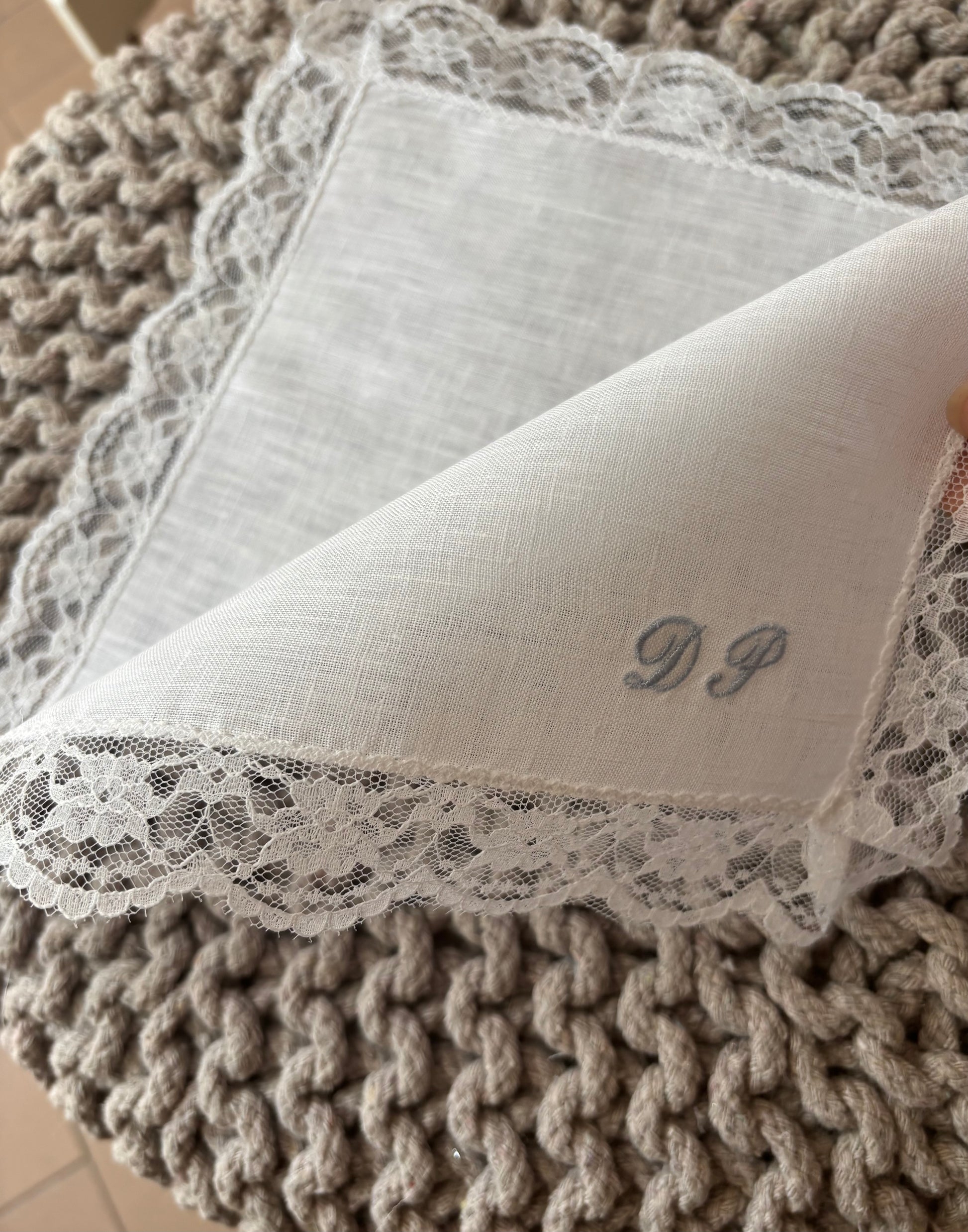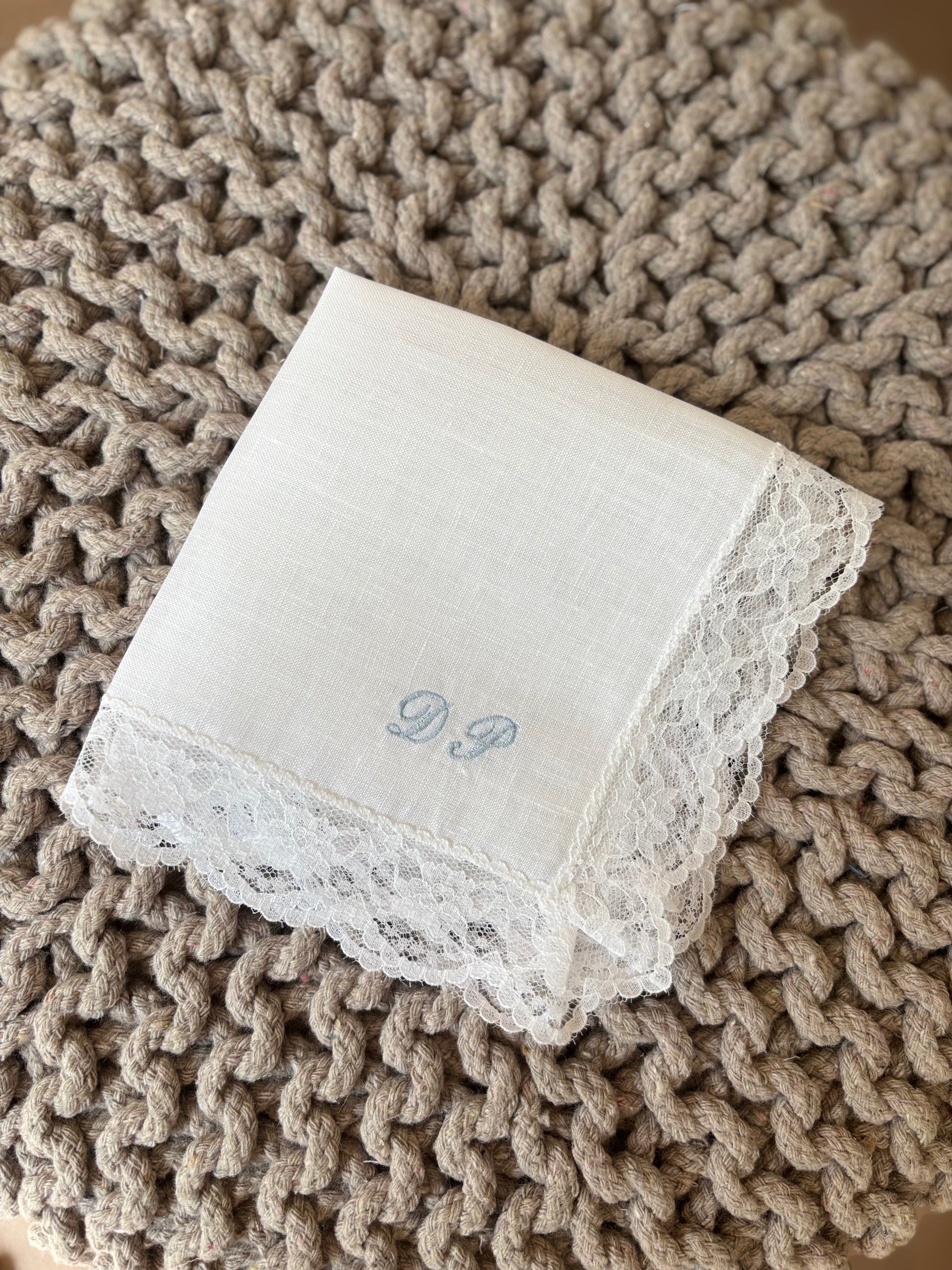 Fazzoletto battesimale realizzabile in puro lino o 100% cotone. Il fazzoletto è personalizzato con iniziali ricamate. Misura 25x25 cm