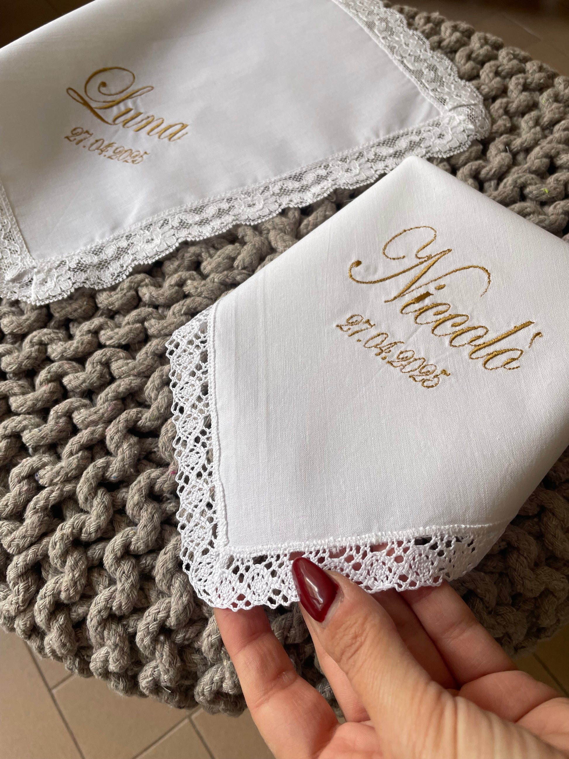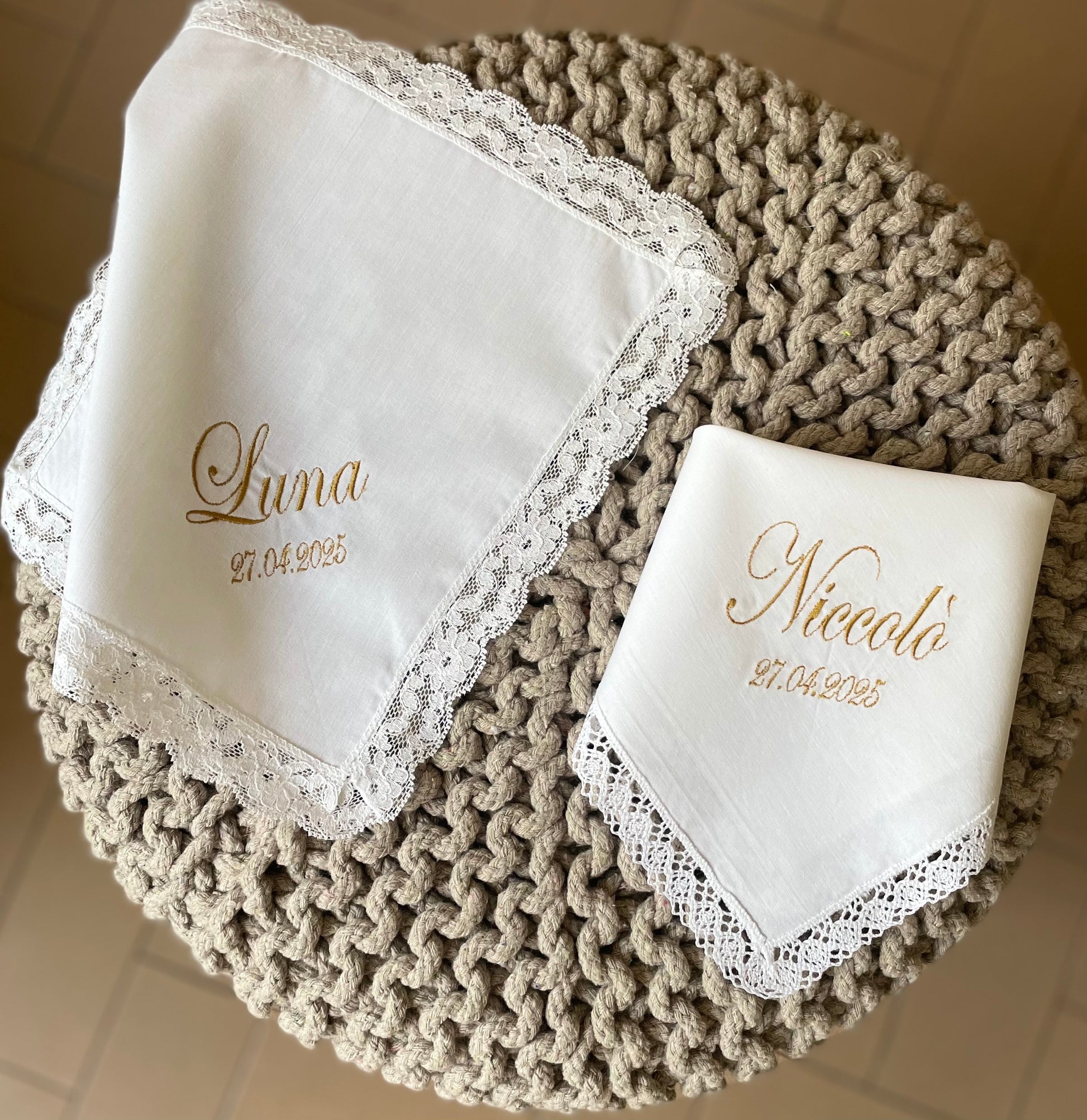 Fazzoletto battesimale realizzabile in puro lino o 100% cotone. Il fazzoletto è personalizzato con nome e data ricamati. Misura 25x25 cm