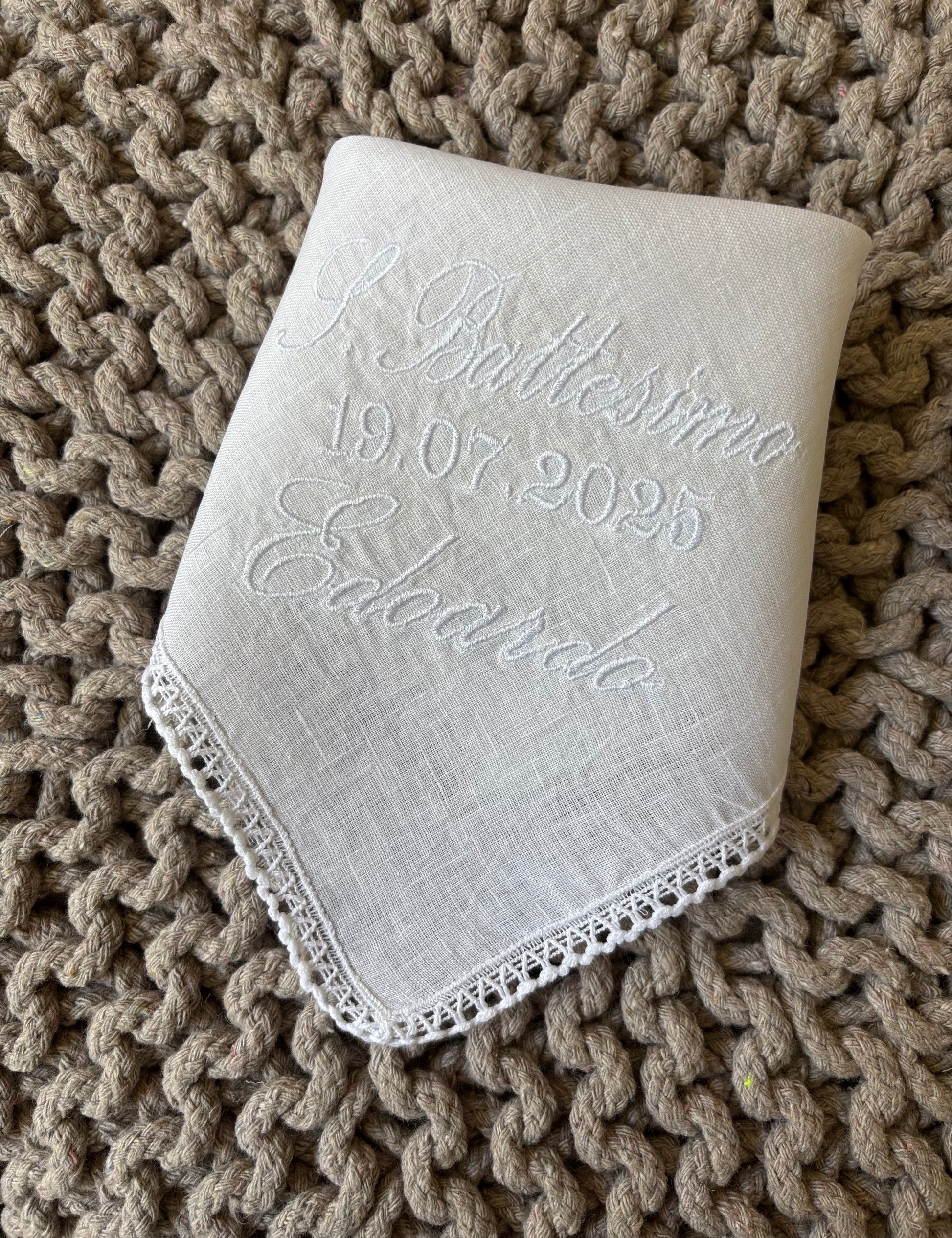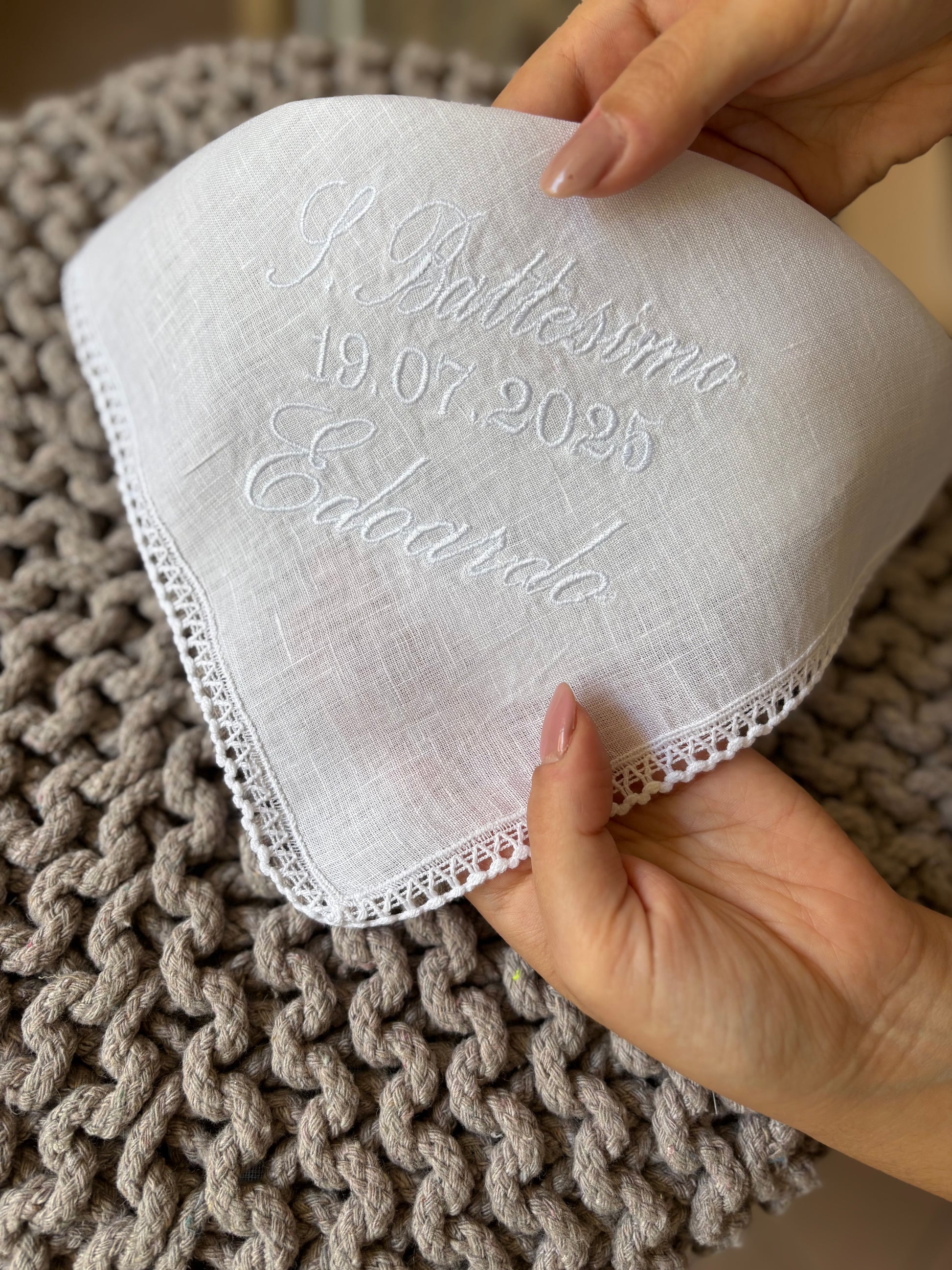 Fazzoletto battesimale realizzabile in puro lino o 100% cotone. Misura 25x25 cm