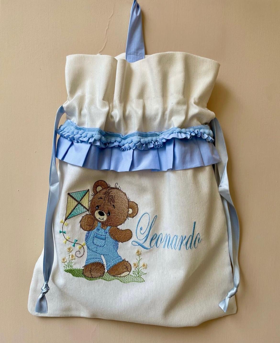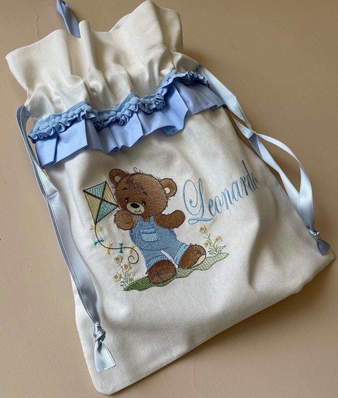 Sacca primo cambio realizzata in cotone e arricchita da pon pon e pieghe di cotone celeste. L’articolo presenta un tenero orsetto e nome del bimbo/a ricamati a macchina (N.B. realizzabile anche in rosa)