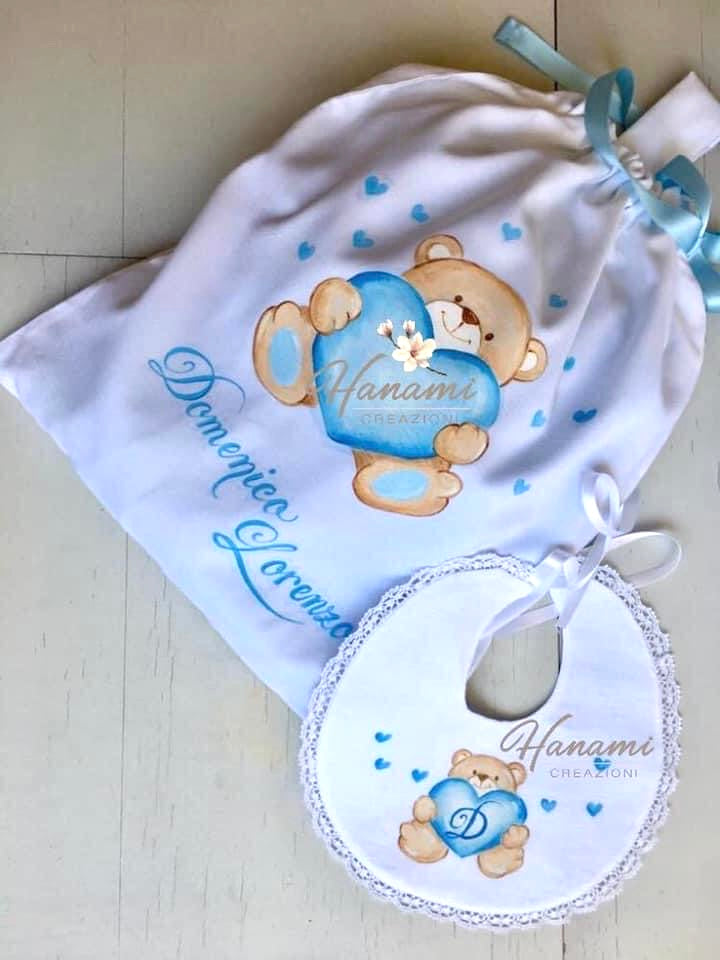 Sacca primo cambio in cotone personalizzata con disegno di un orsetto con cuore dipinto interamente a mano.