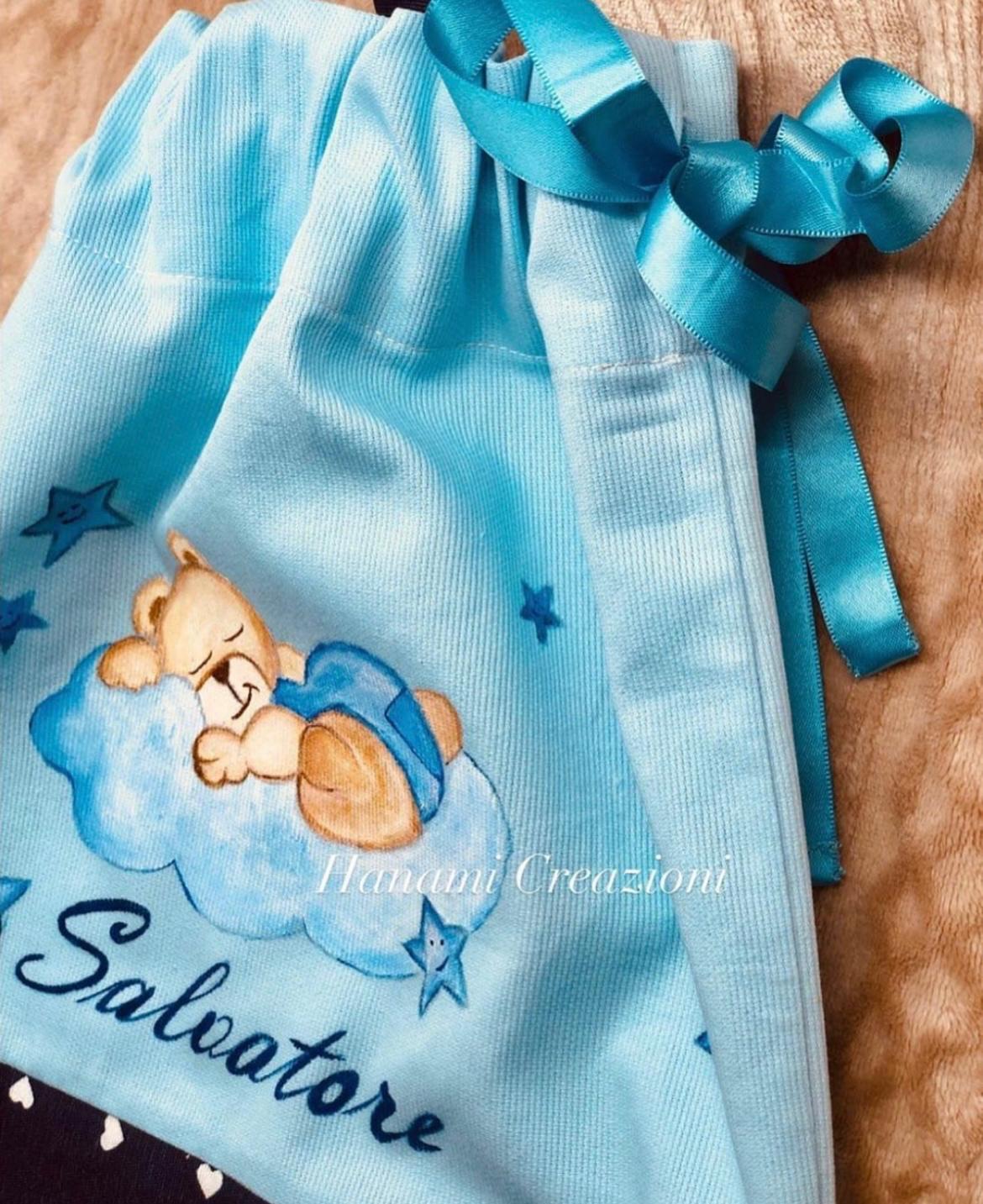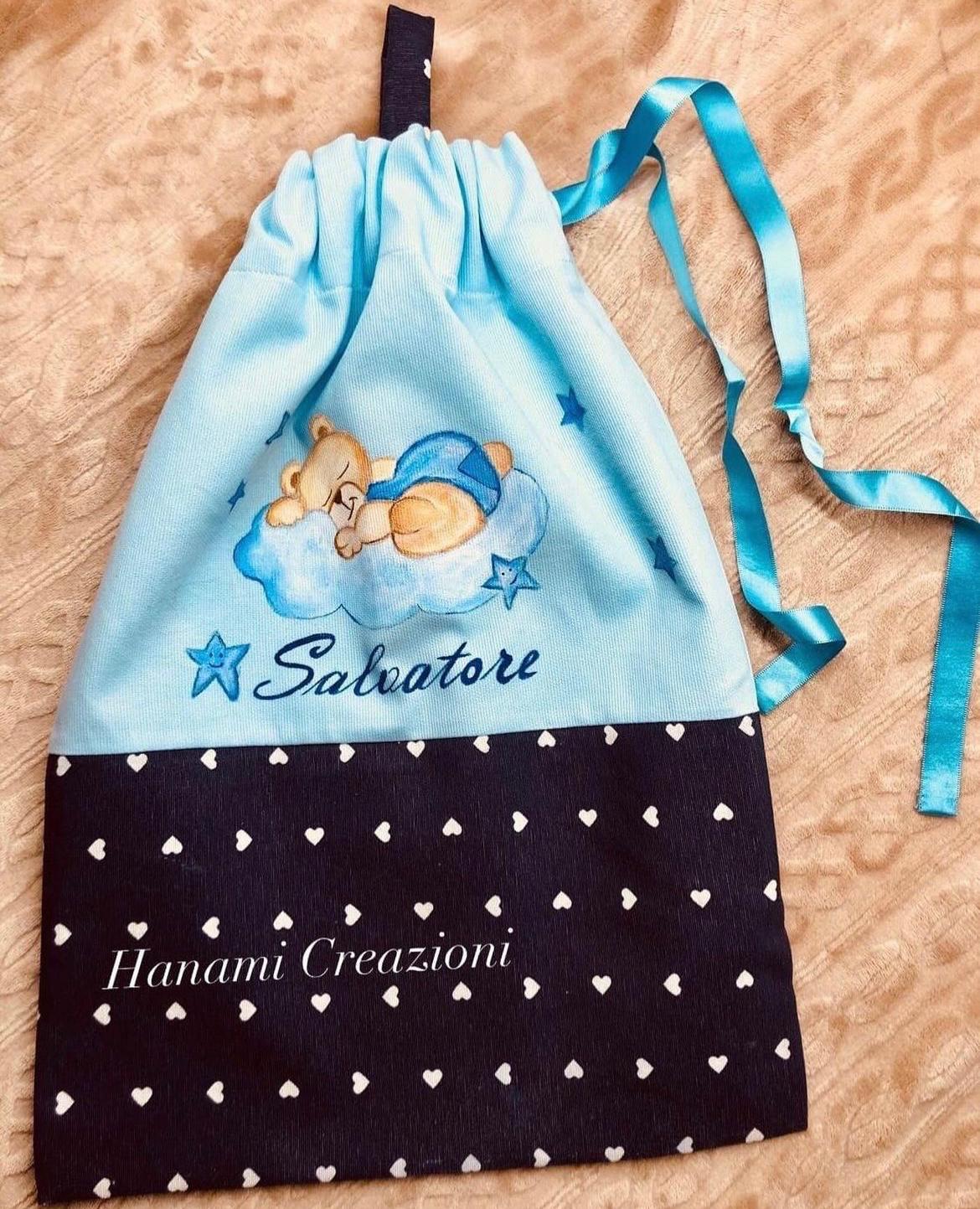 Sacca primo cambio realizzata con cotone in doppia fantasia: parte superiore in piquet celeste mentre quella inferiore in cotone blu notte con cuoricini bianchi. La sacca è personalizzata con il disegno di un grazioso orsetto su nuvoletta accompagnato dal nome del bimbo. Il tutto dipinto a mano.