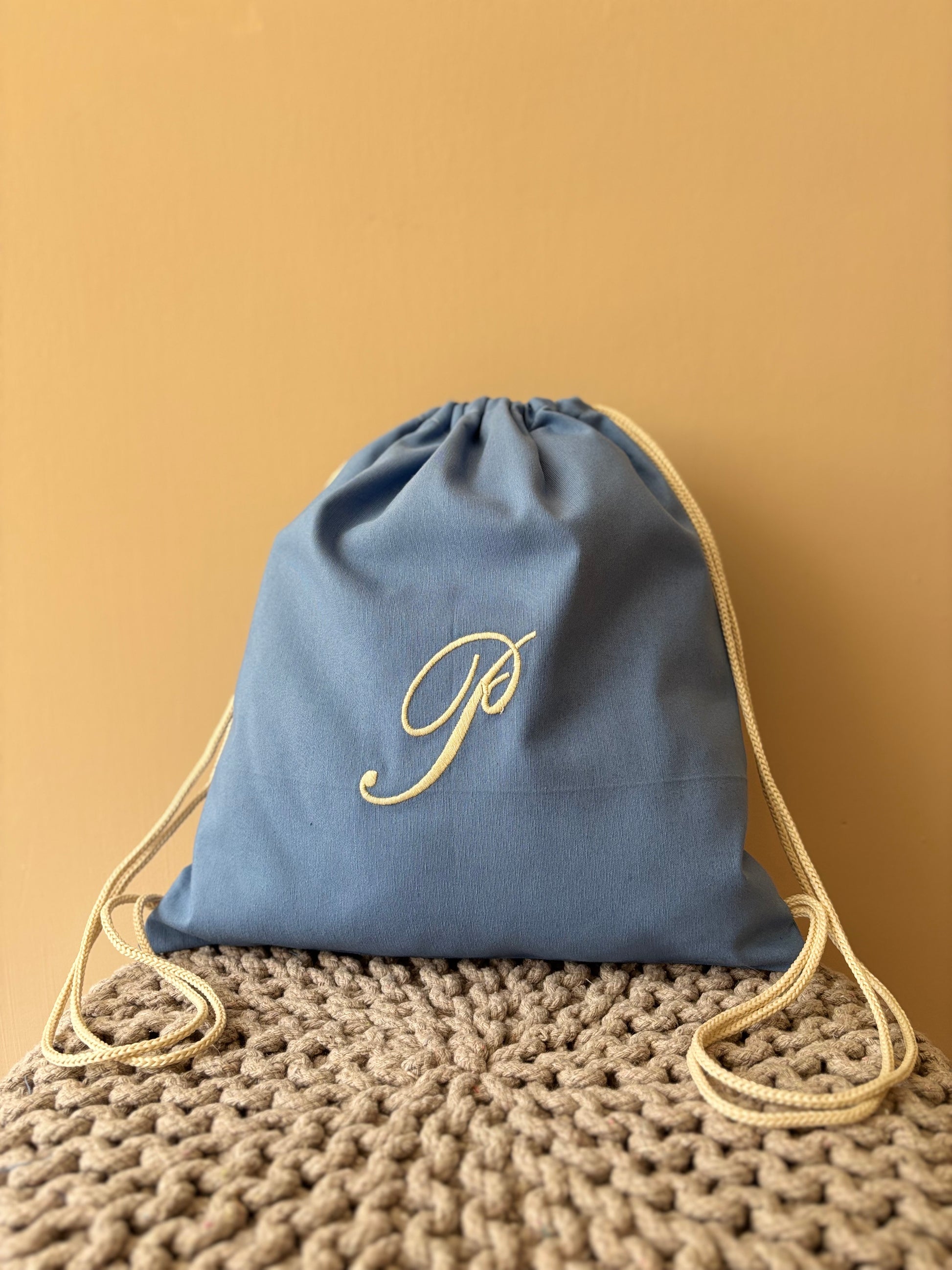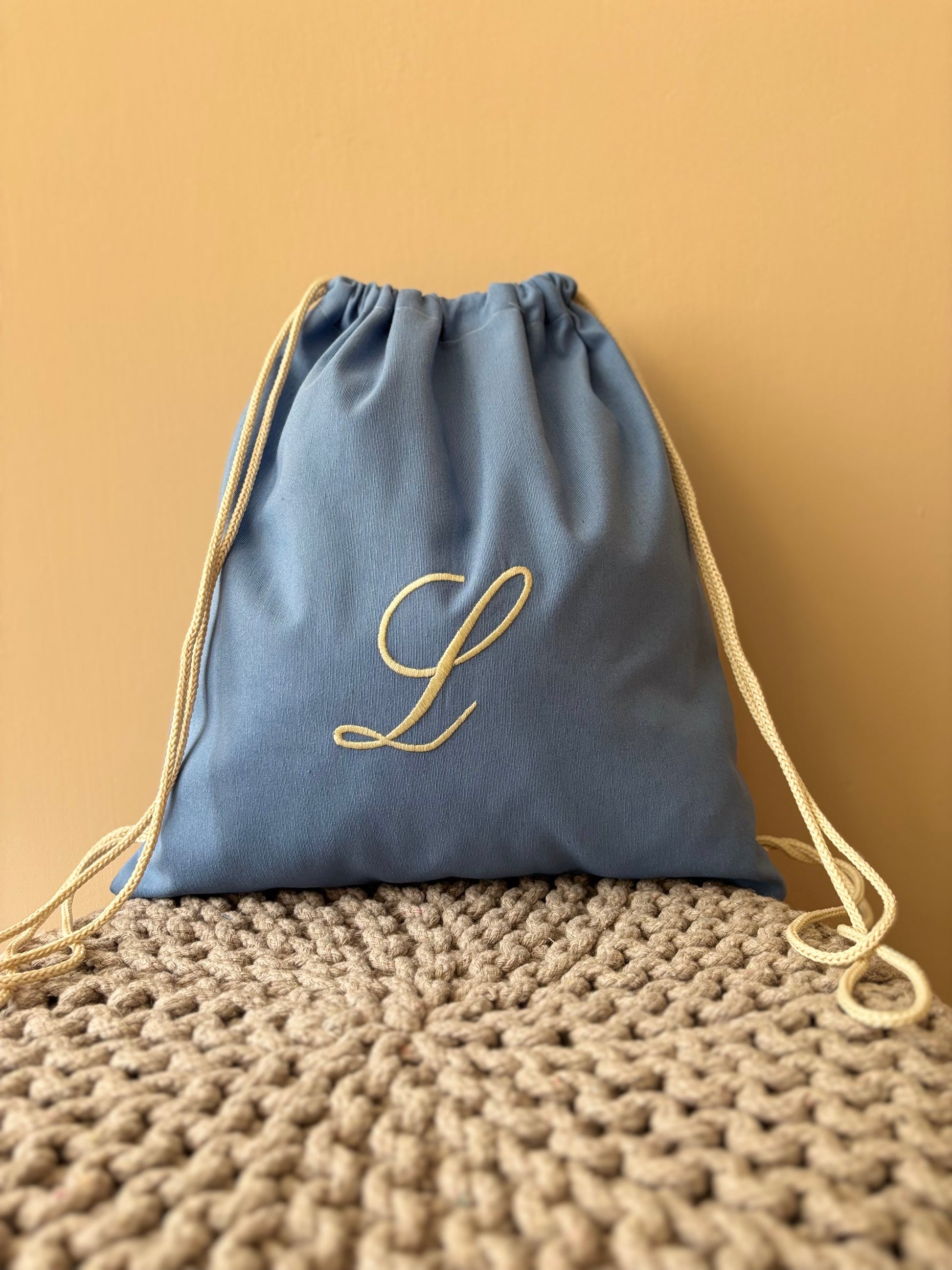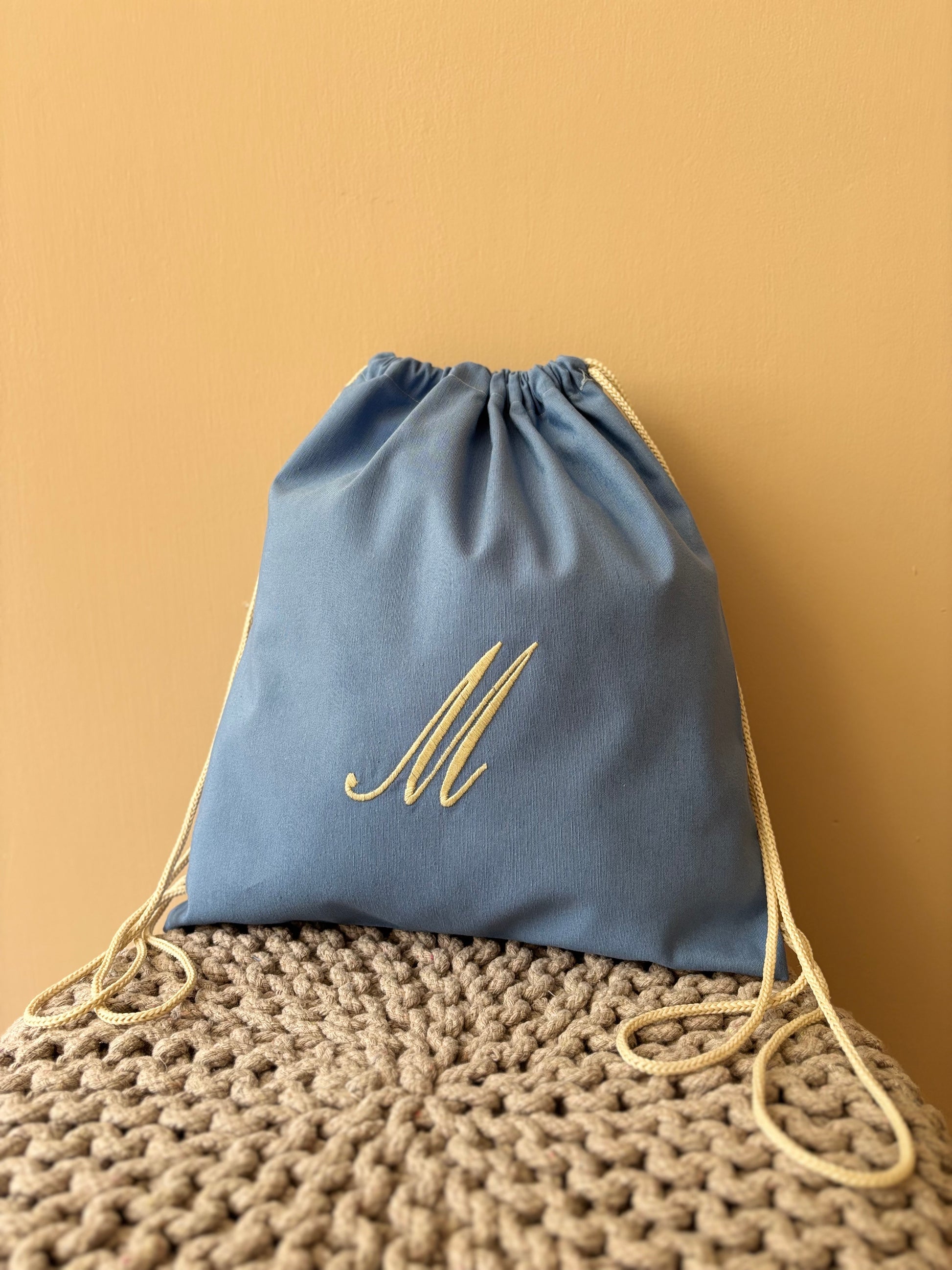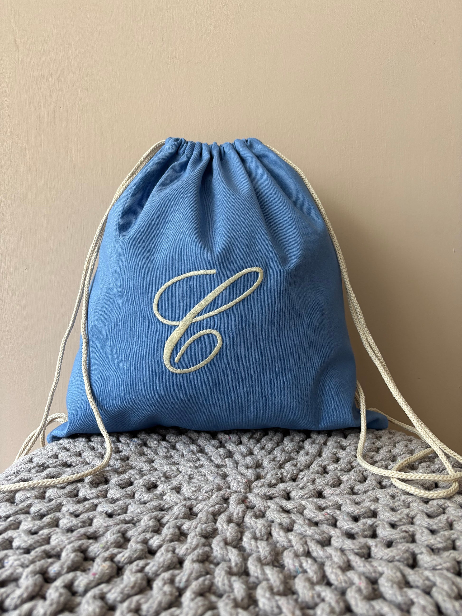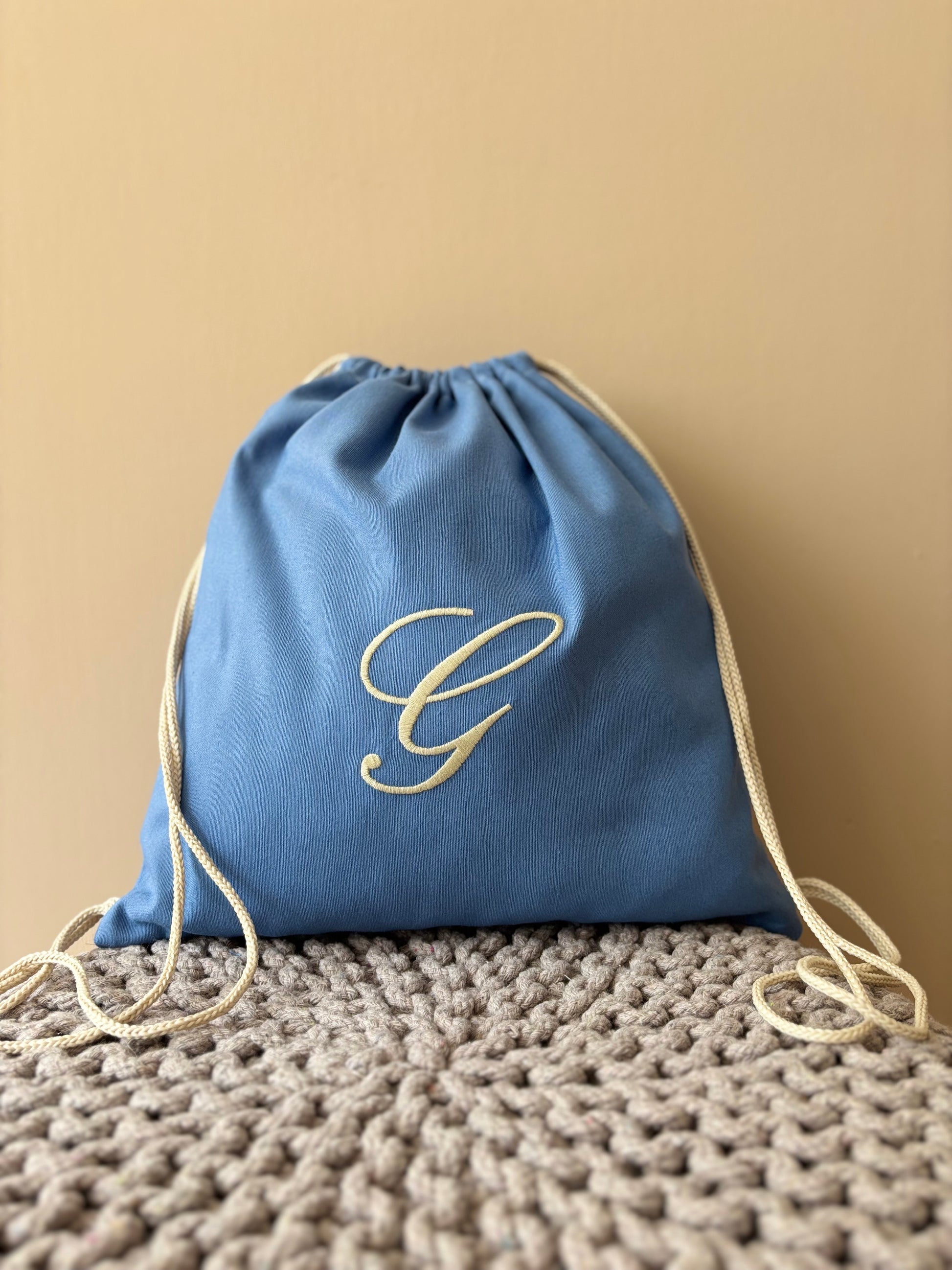 Sacca sartoriale in cotone con iniziale ricamata. L'articolo presenta un comodo cordoncino che consente di portare la sacca sulle spalle.
