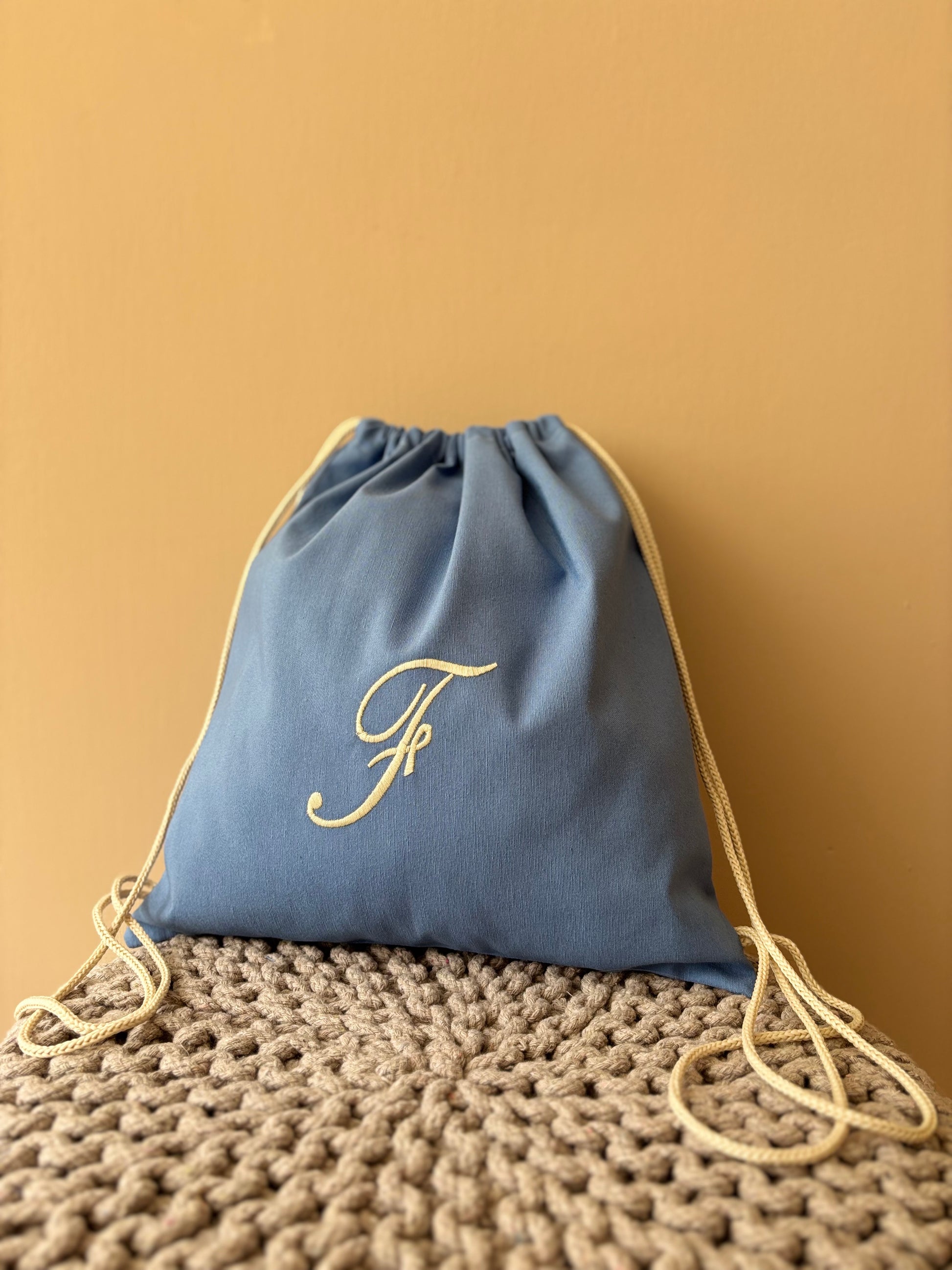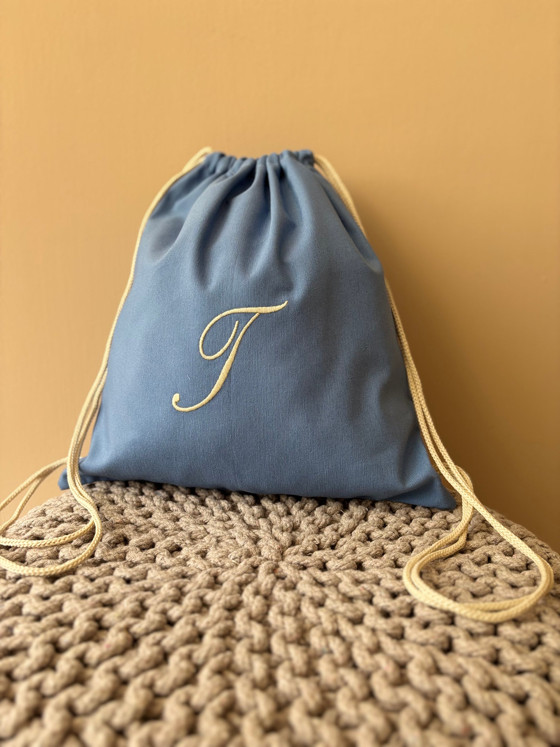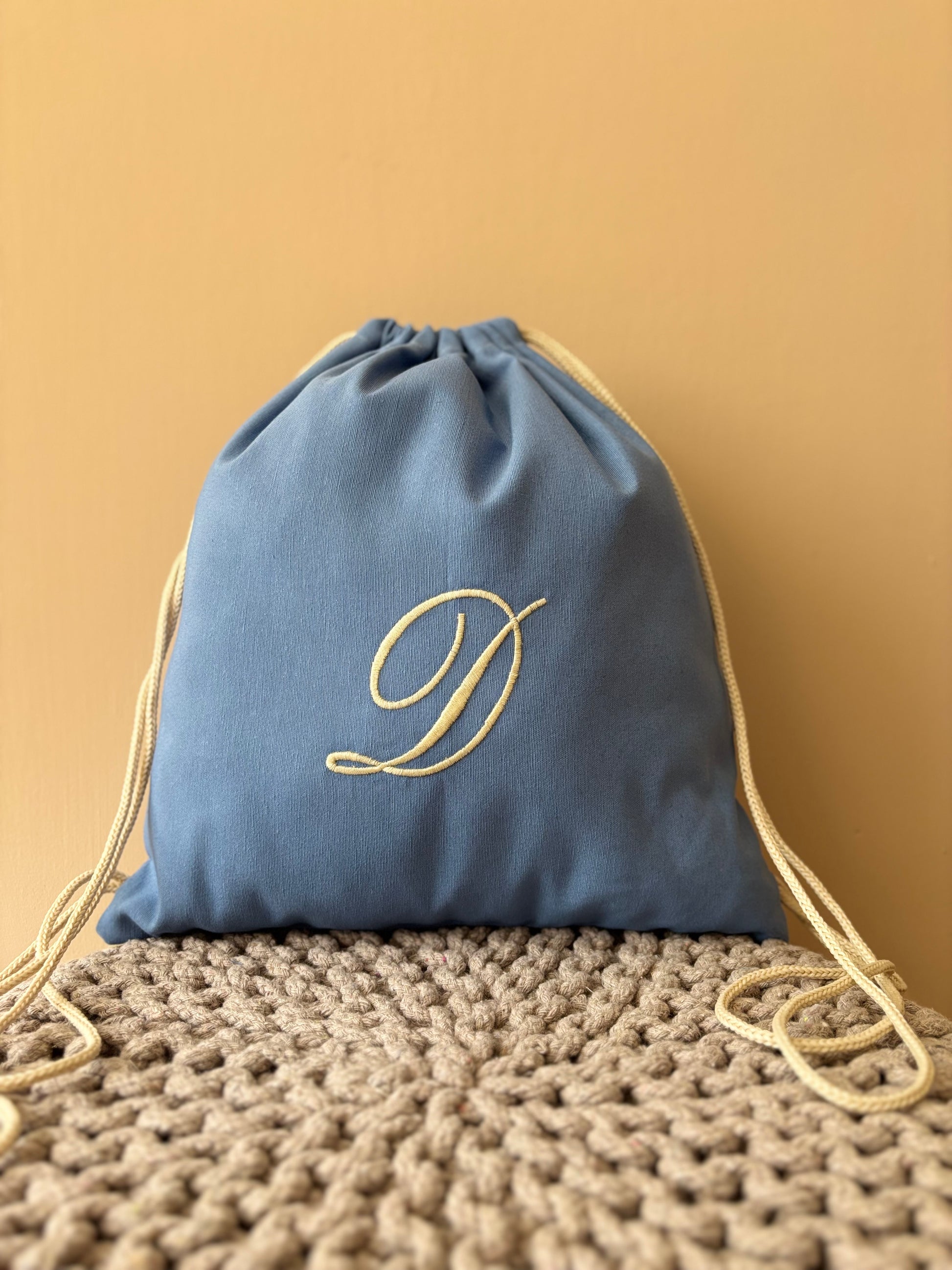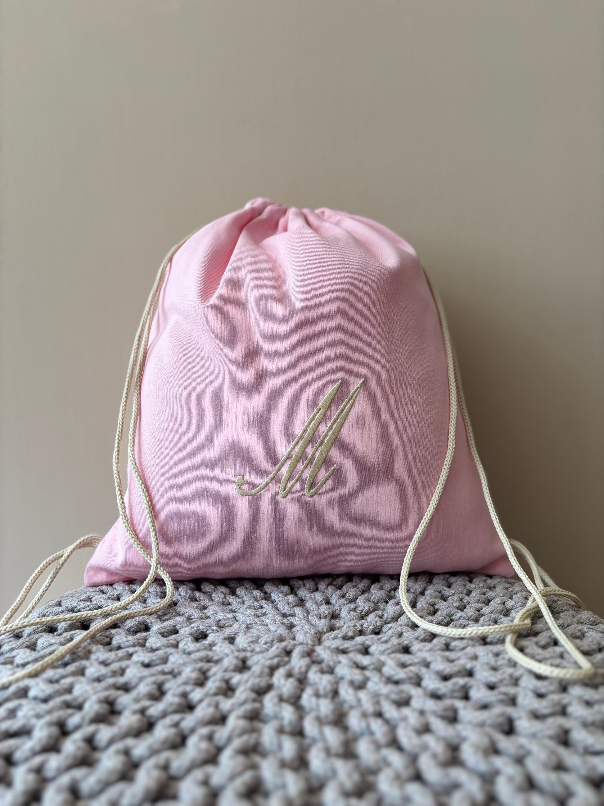 Sacca sartoriale in cotone con iniziale ricamata. L'articolo presenta un comodo cordoncino che consente di portare la sacca sulle spalle.