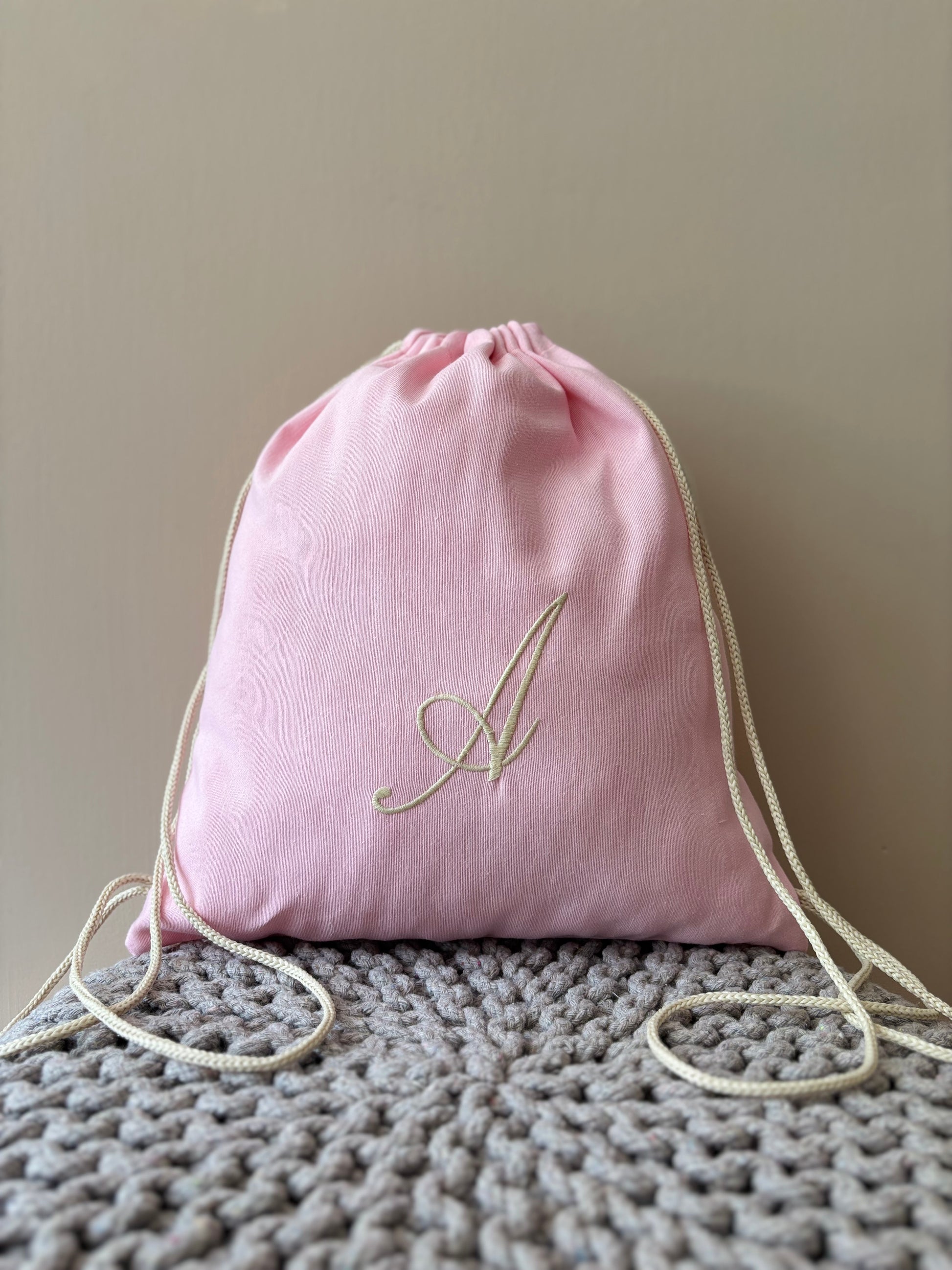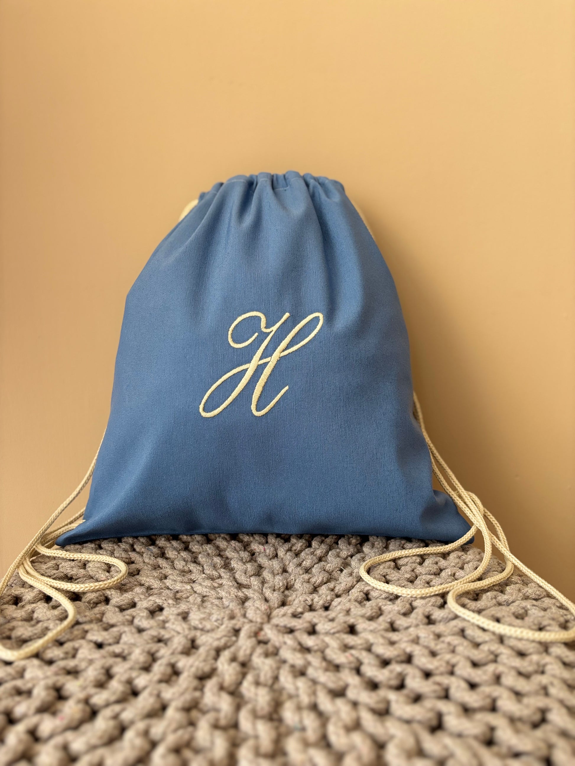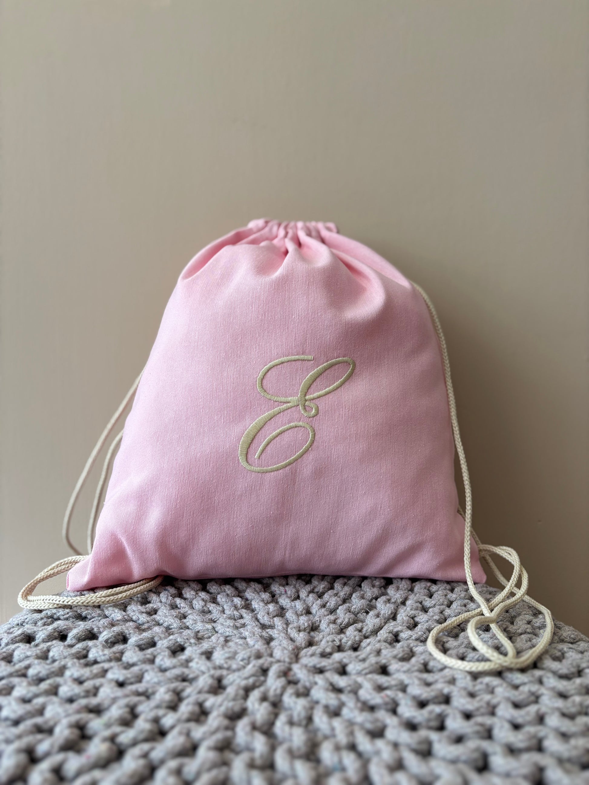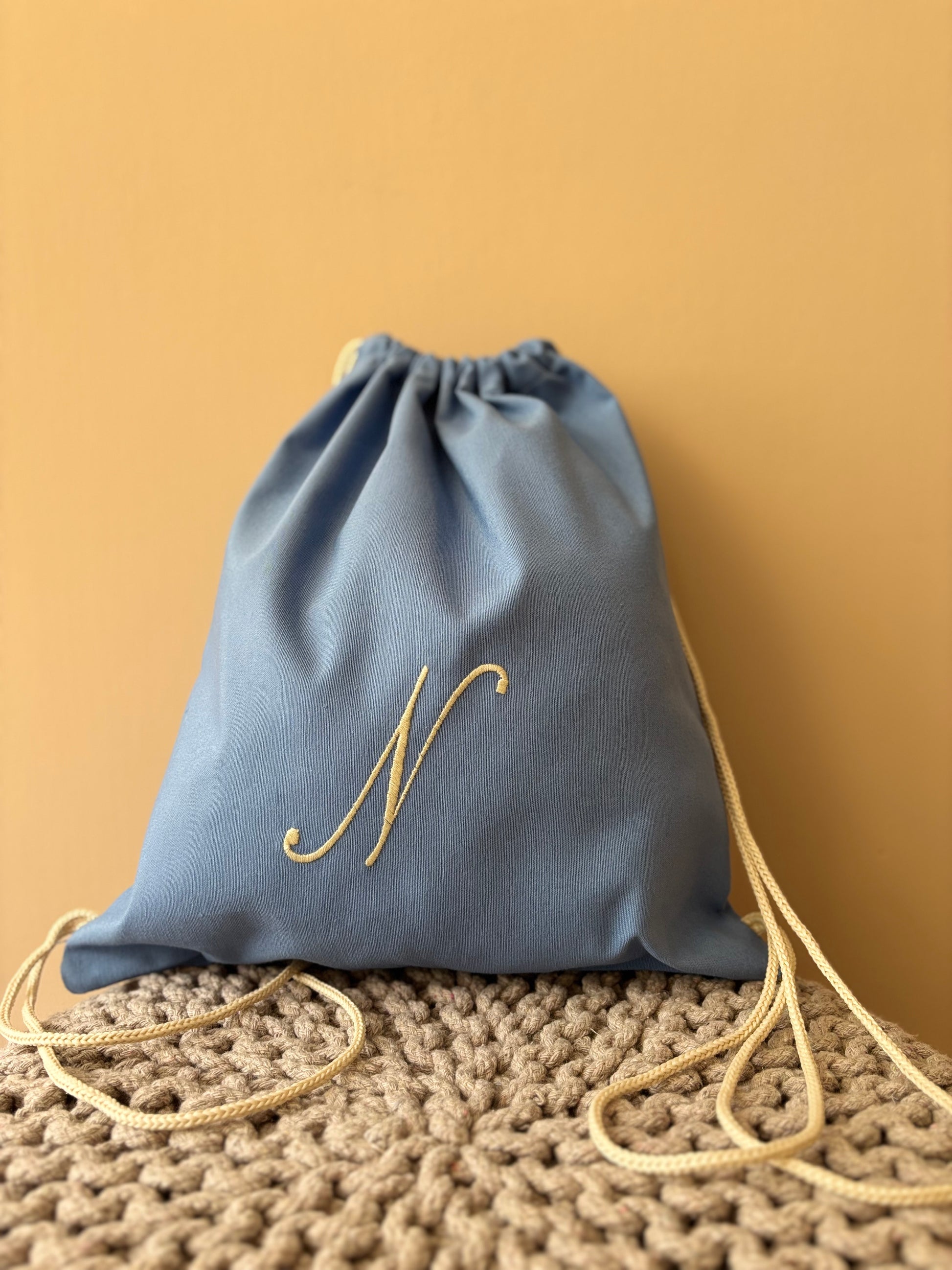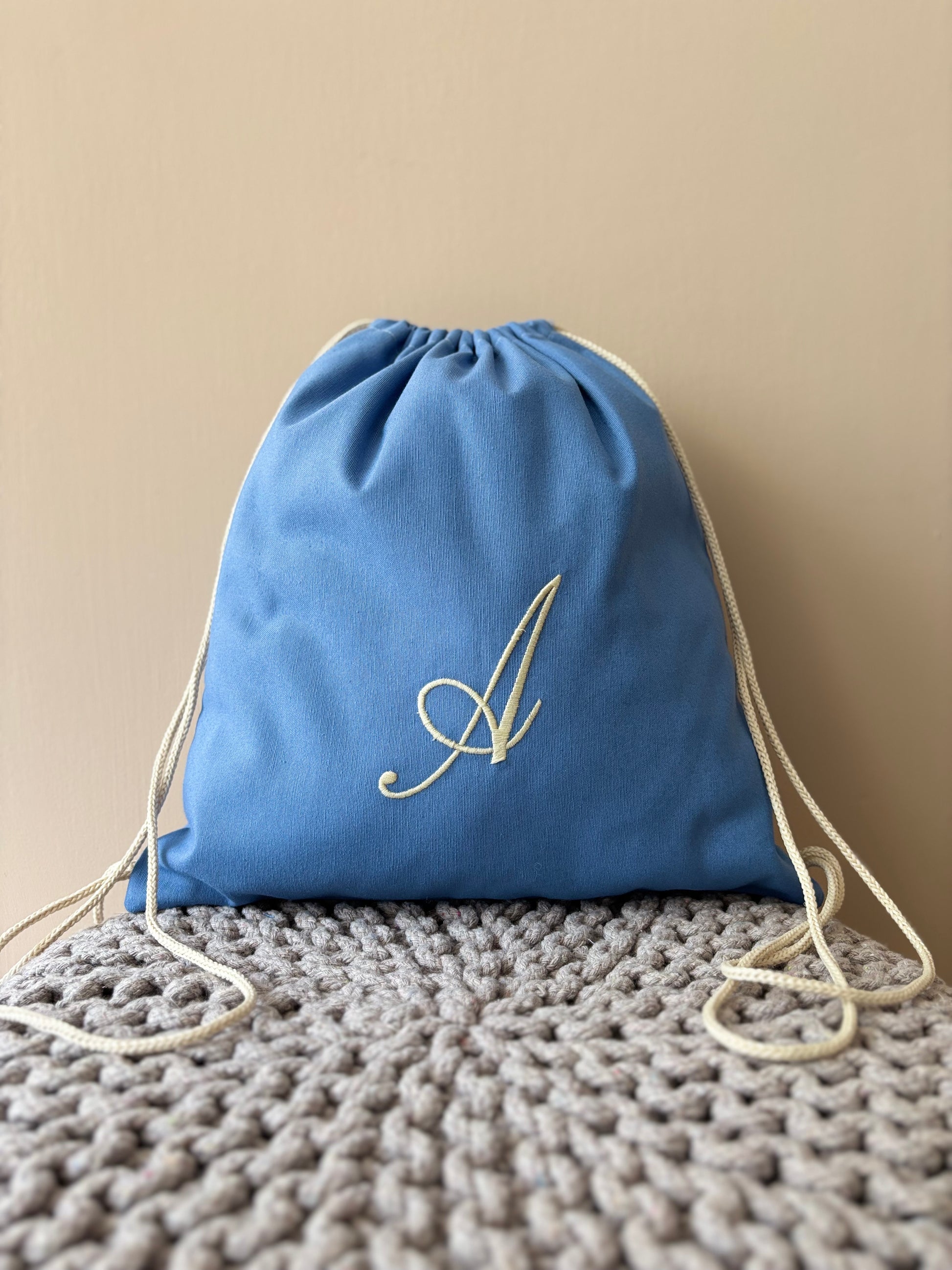 Sacca sartoriale in cotone con iniziale ricamata. L'articolo presenta un comodo cordoncino che consente di portare la sacca sulle spalle.