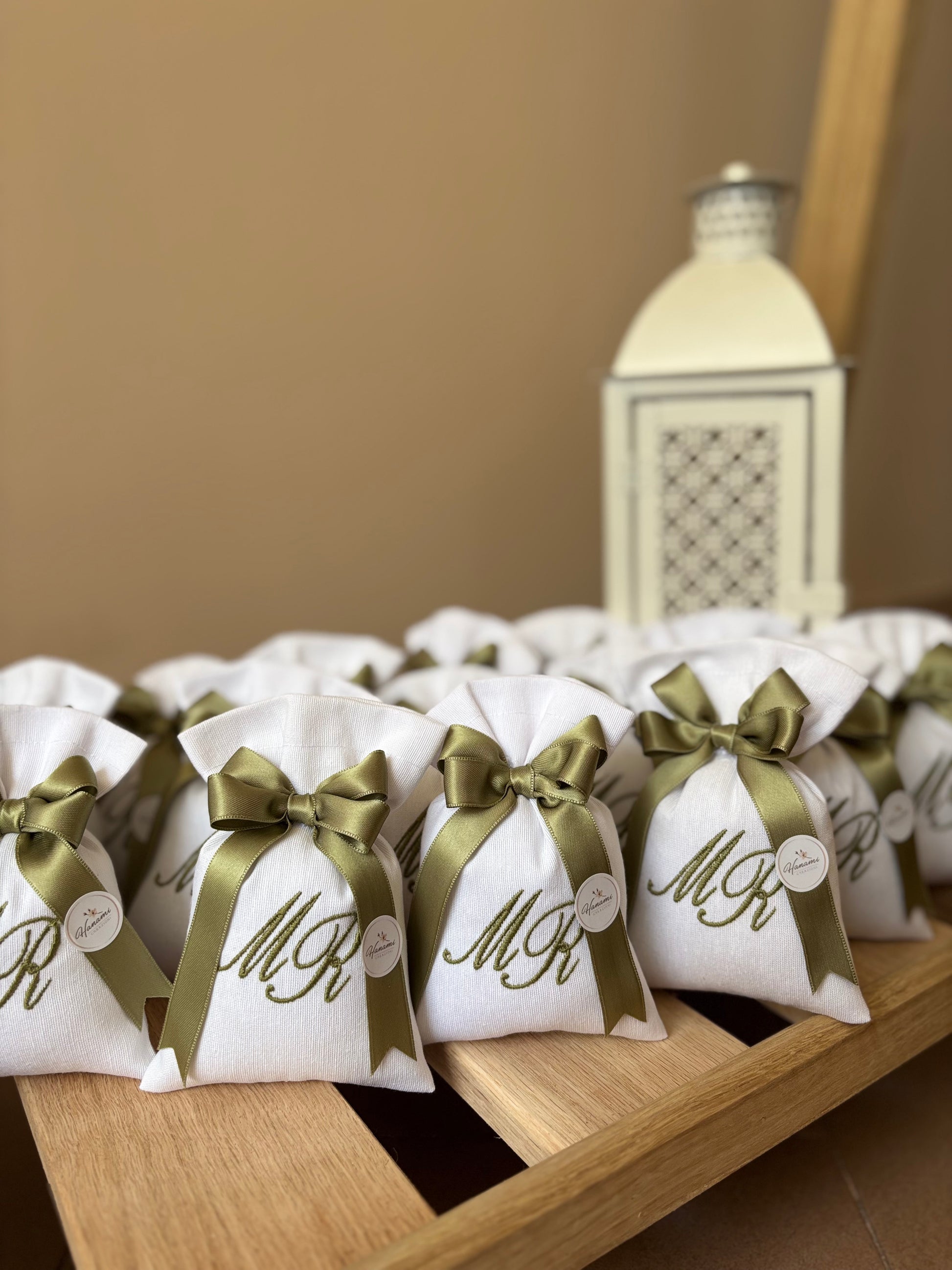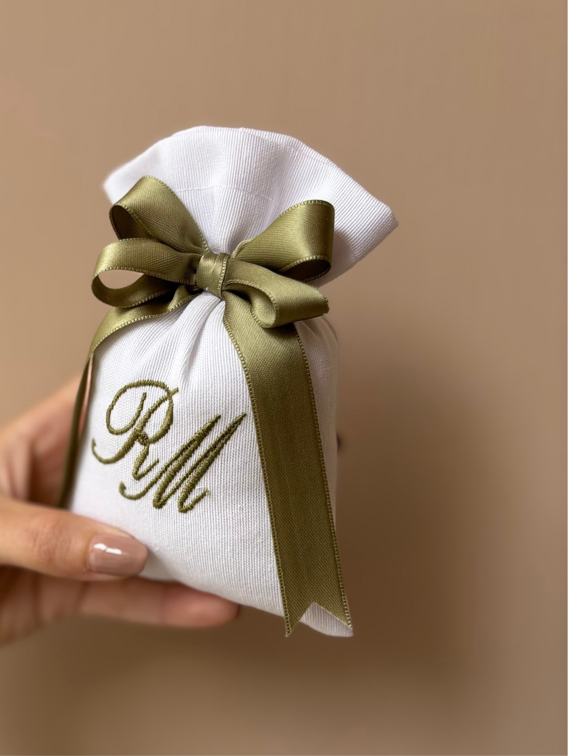 Sacchetto sartoriale realizzato in cotone e personalizzato con iniziali ricamate a macchina. Il prodotto è completo di fiocco in chiffon, bigliettino e cinque confetti a scelta tra gusto mandorla o cioccolato
