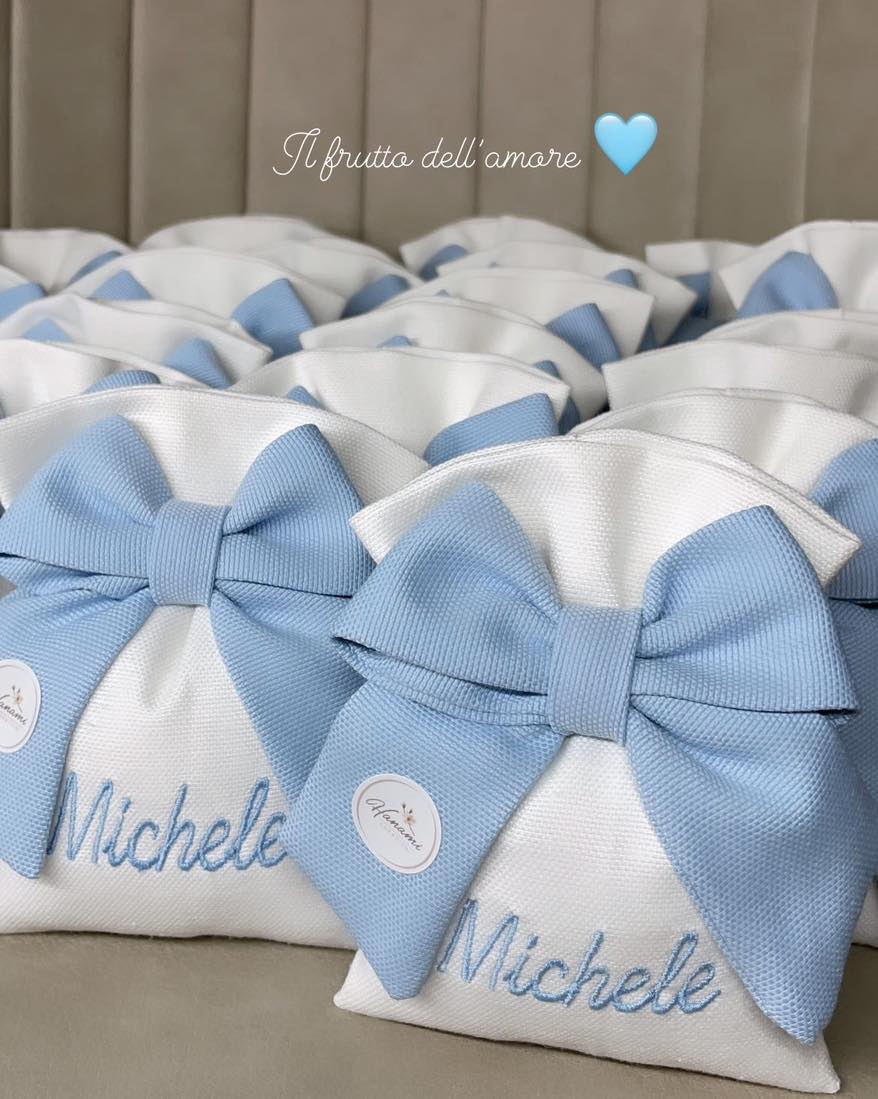 Sacchetto sartoriale realizzato in cotone e personalizzato con nome ricamato a macchina. Il prodotto è arricchito da un fiocco in cotone realizzato a mano. Il prodotto è completo di bigliettino e cinque confetti a scelta tra gusto mandorla o cioccolato.
