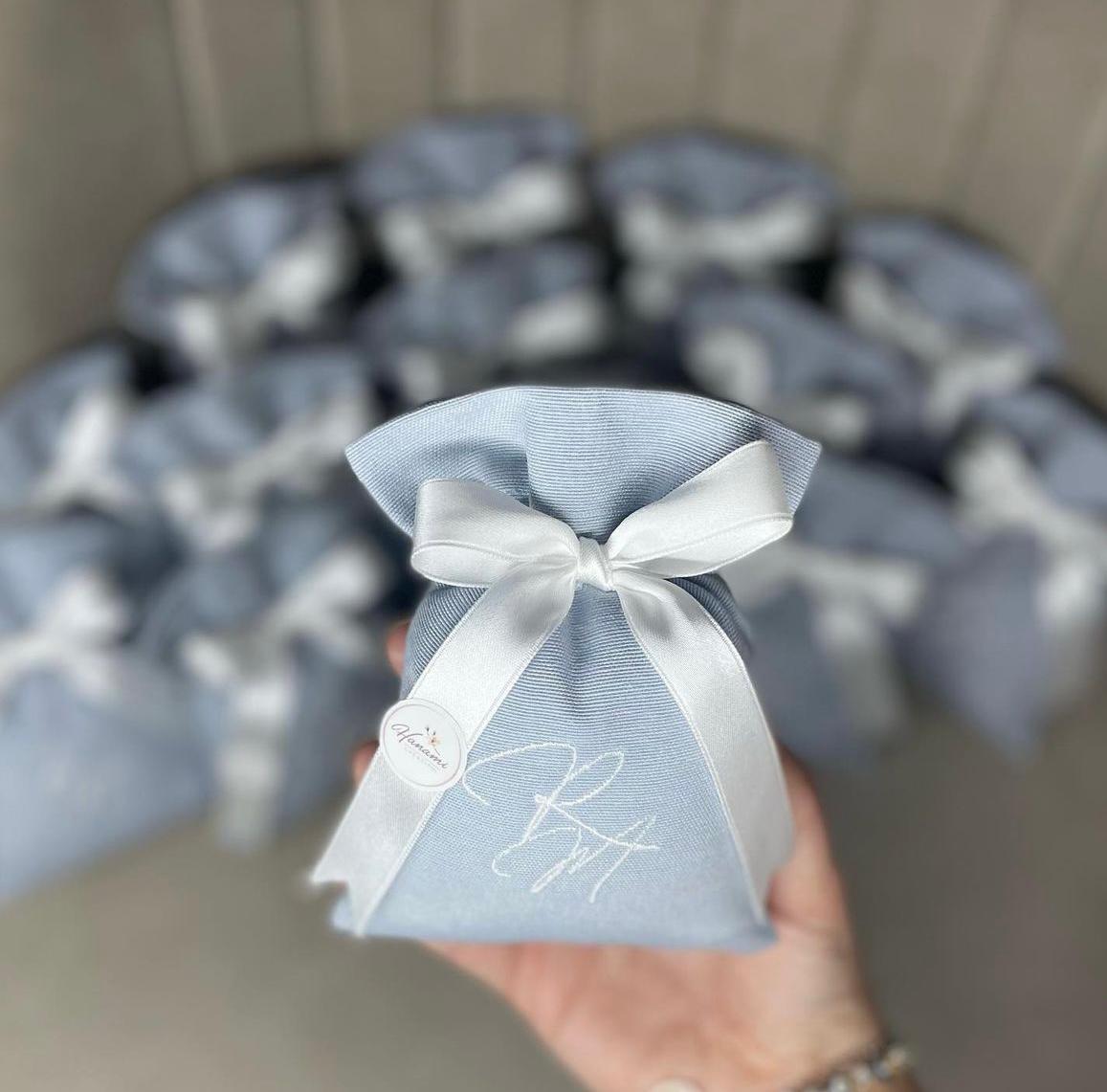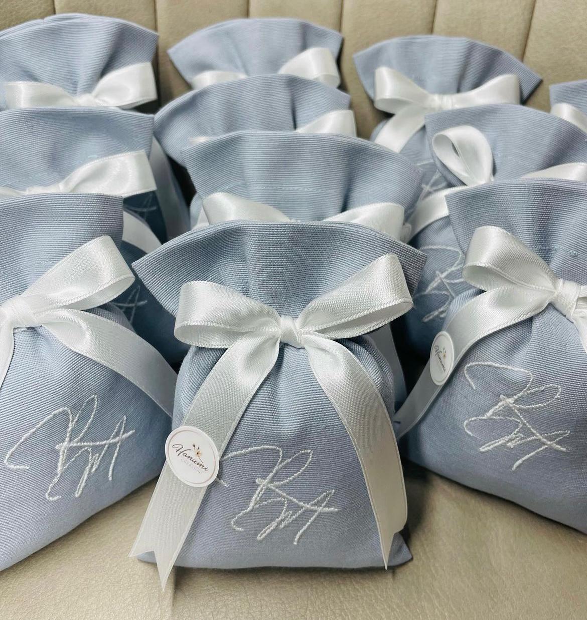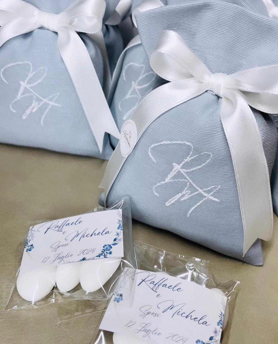Sacchetto sartoriale realizzato in cotone e personalizzato con iniziali ricamate a macchina. Il prodotto è completo di fiocco in chiffon, bigliettino e cinque confetti a scelta tra gusto mandorla o cioccolato