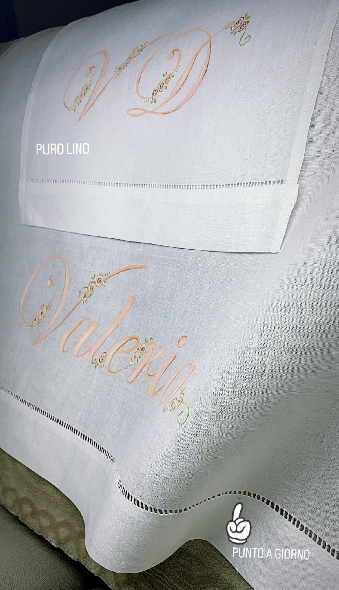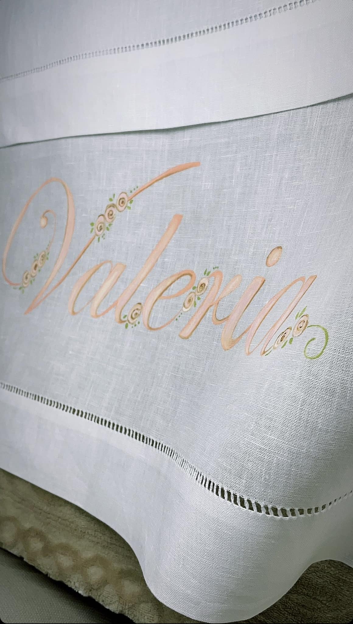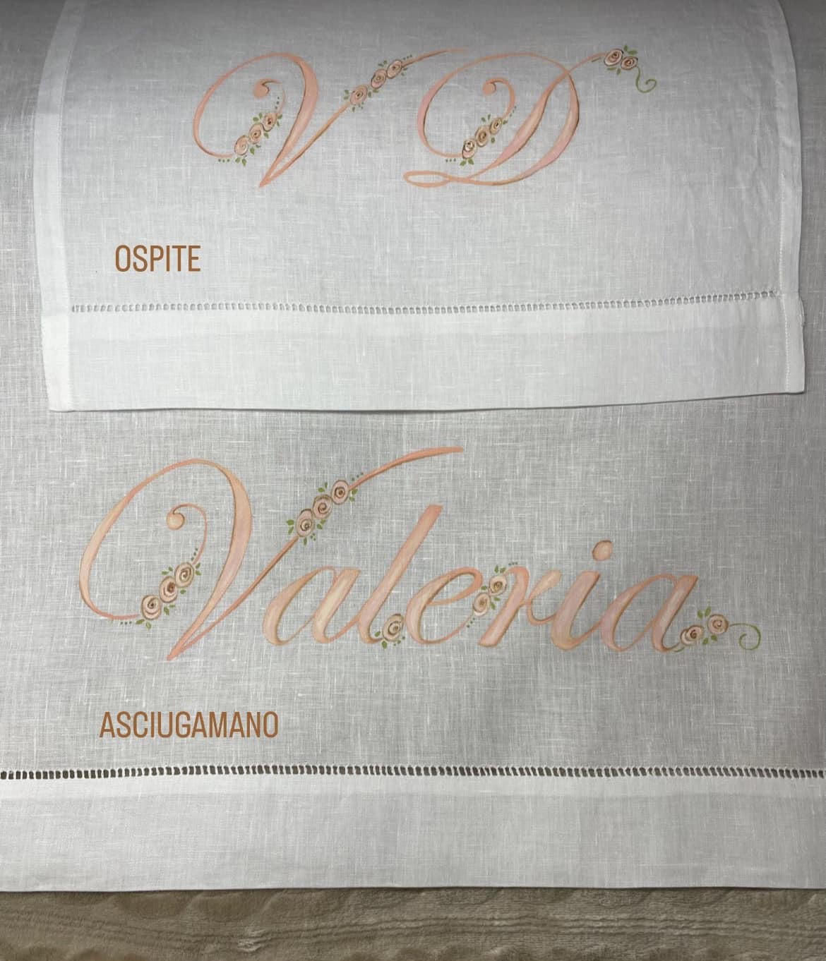 Prezioso set di asciugamani in Puro Lino con punto a giorno lavorato a mano e personalizzato con nome e iniziali dipinte con un delicato dettaglio di roselline.