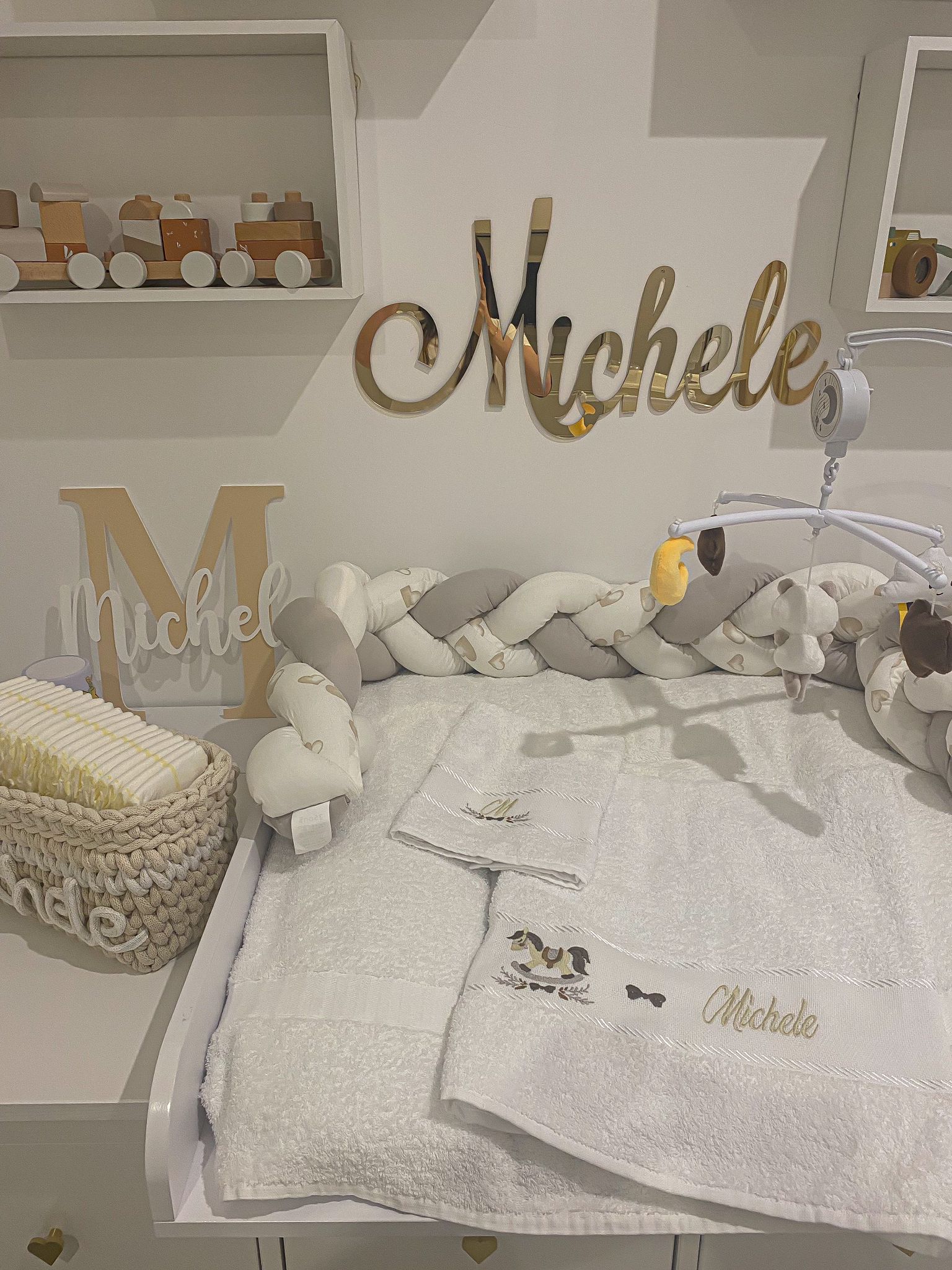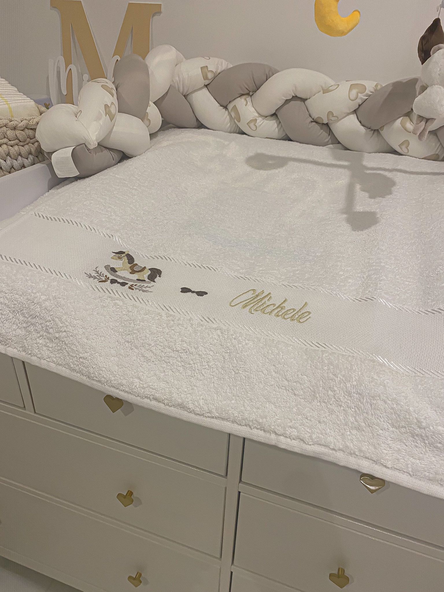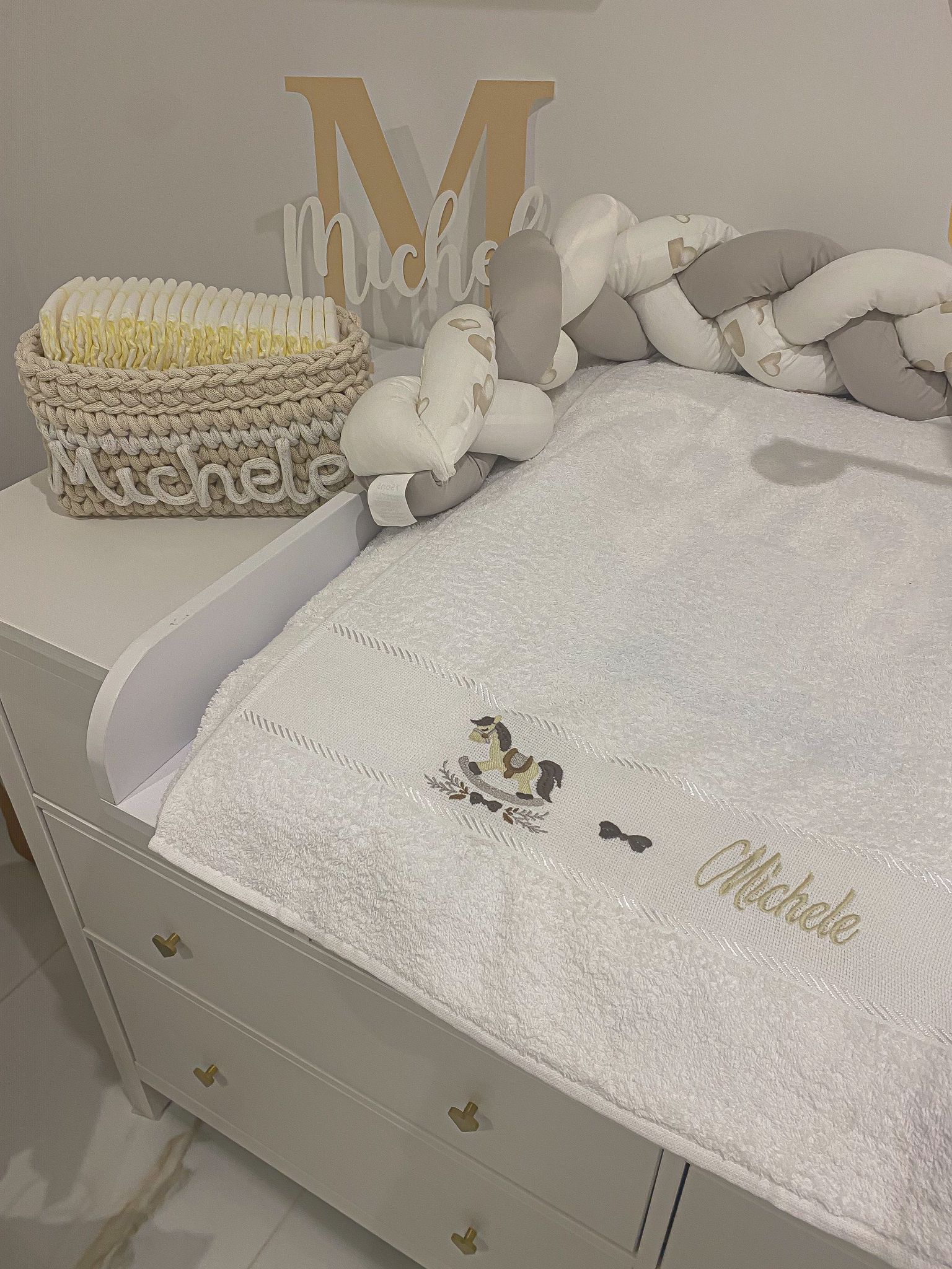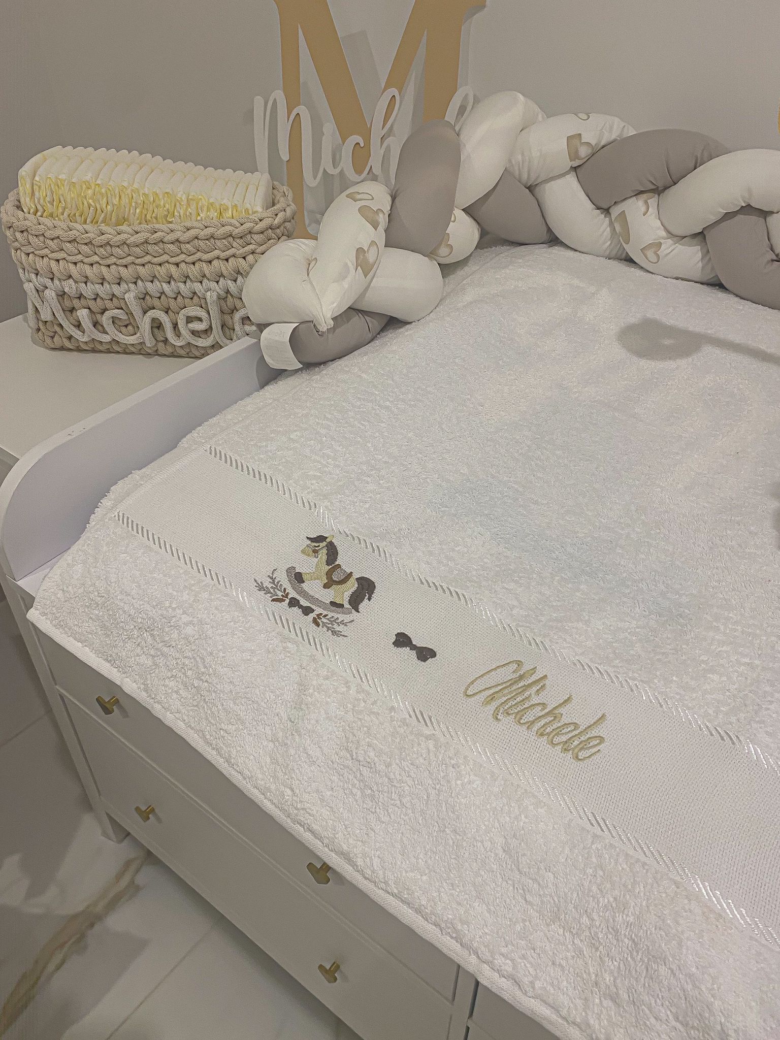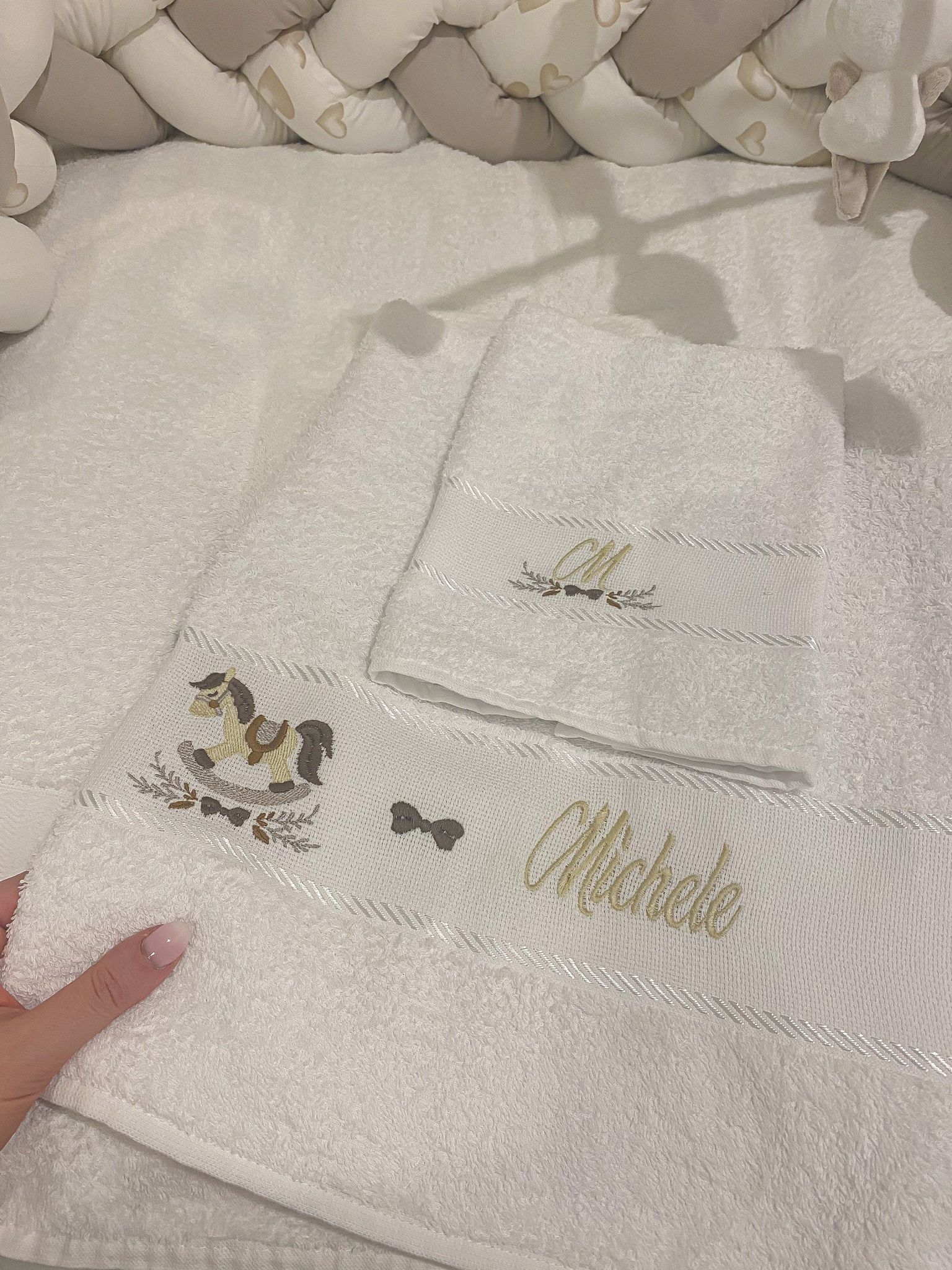 Questo set è ideale per avvolgere il bimbo dopo il bagnetto facendolo sentire dolcemente coccolato dalla morbidezza della sua spugna di cotone 100% italiana. Il prodotto è poi personalizzato col nome del bimbo e un grazioso cavalluccio a dondolo.