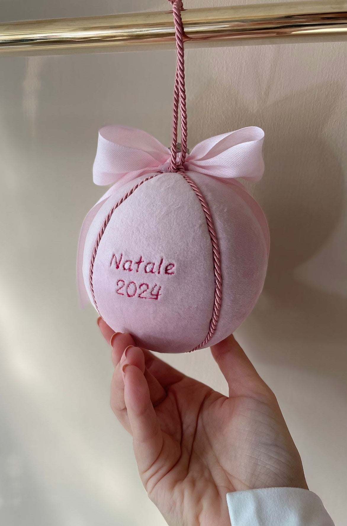 Sfera natalizia in velluto con fiocco in cotone e doppio ricamo: davanti "Aspettando te" sul retro "Natale 2024". Inoltre, la sfera è impreziosita da una gemma a forma di goccia.