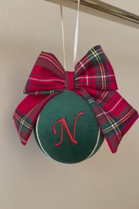 Sfera natalizia in velluto personalizzata con iniziale ricamata e fiocco in tartan rosso.