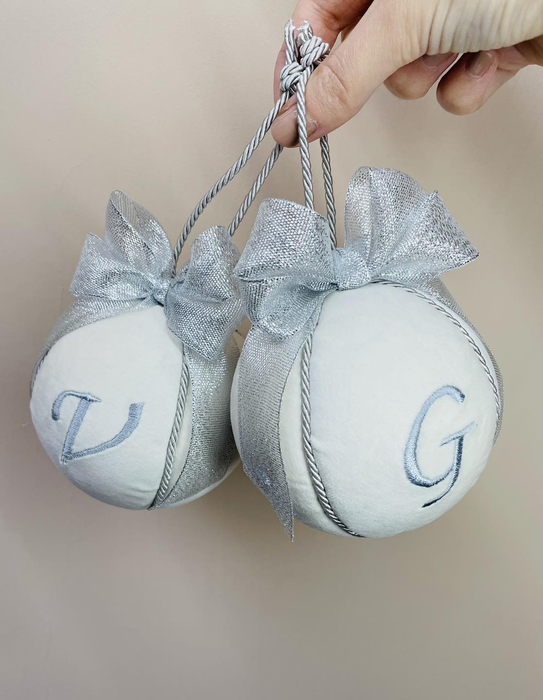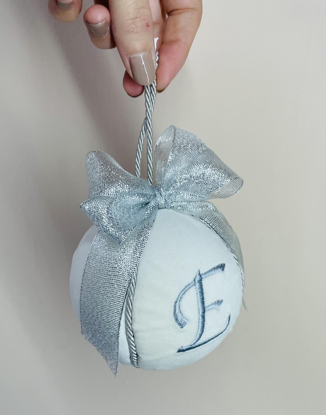 Sfera natalizia in velluto personalizzata con iniziale ricamata e cordoncino.